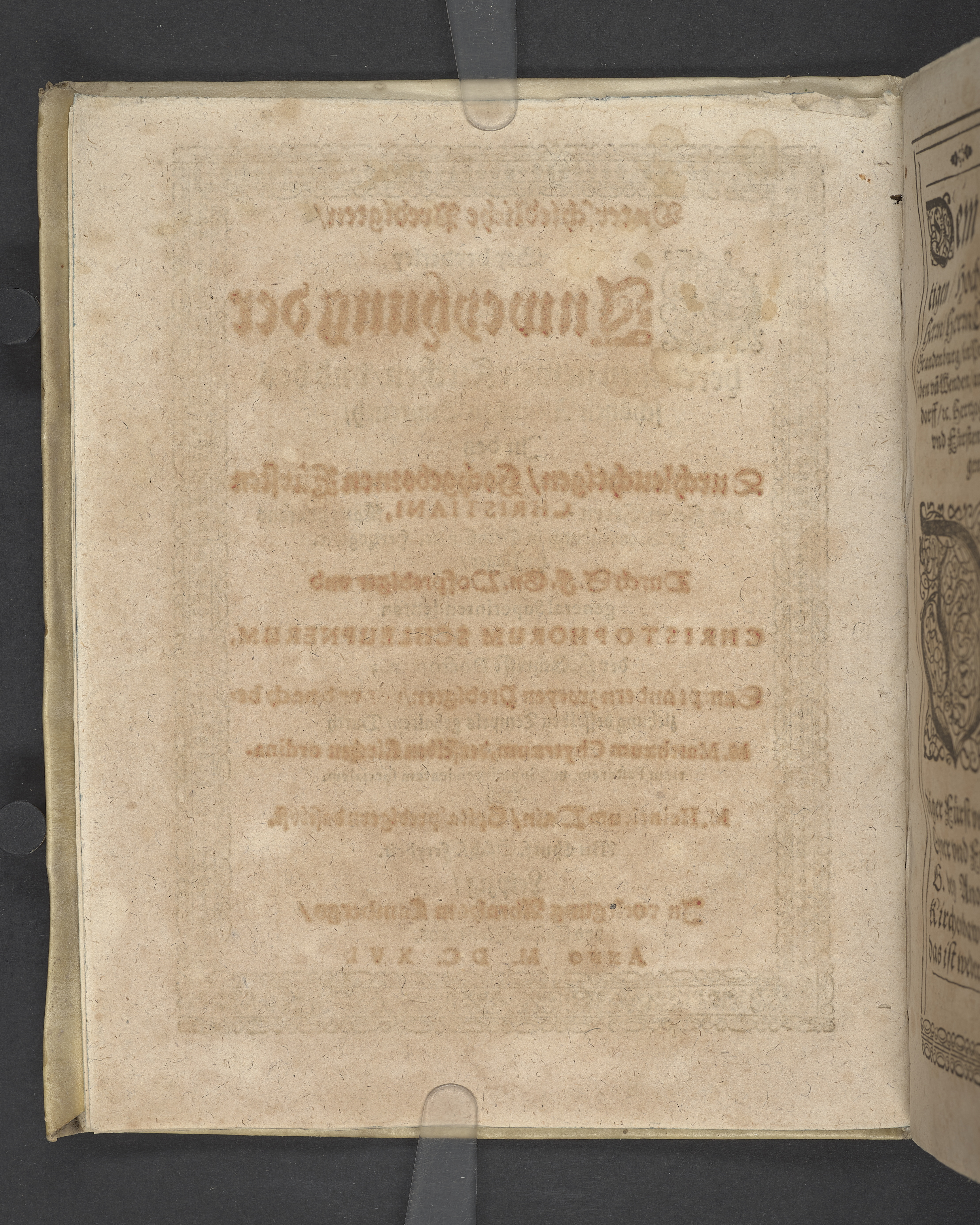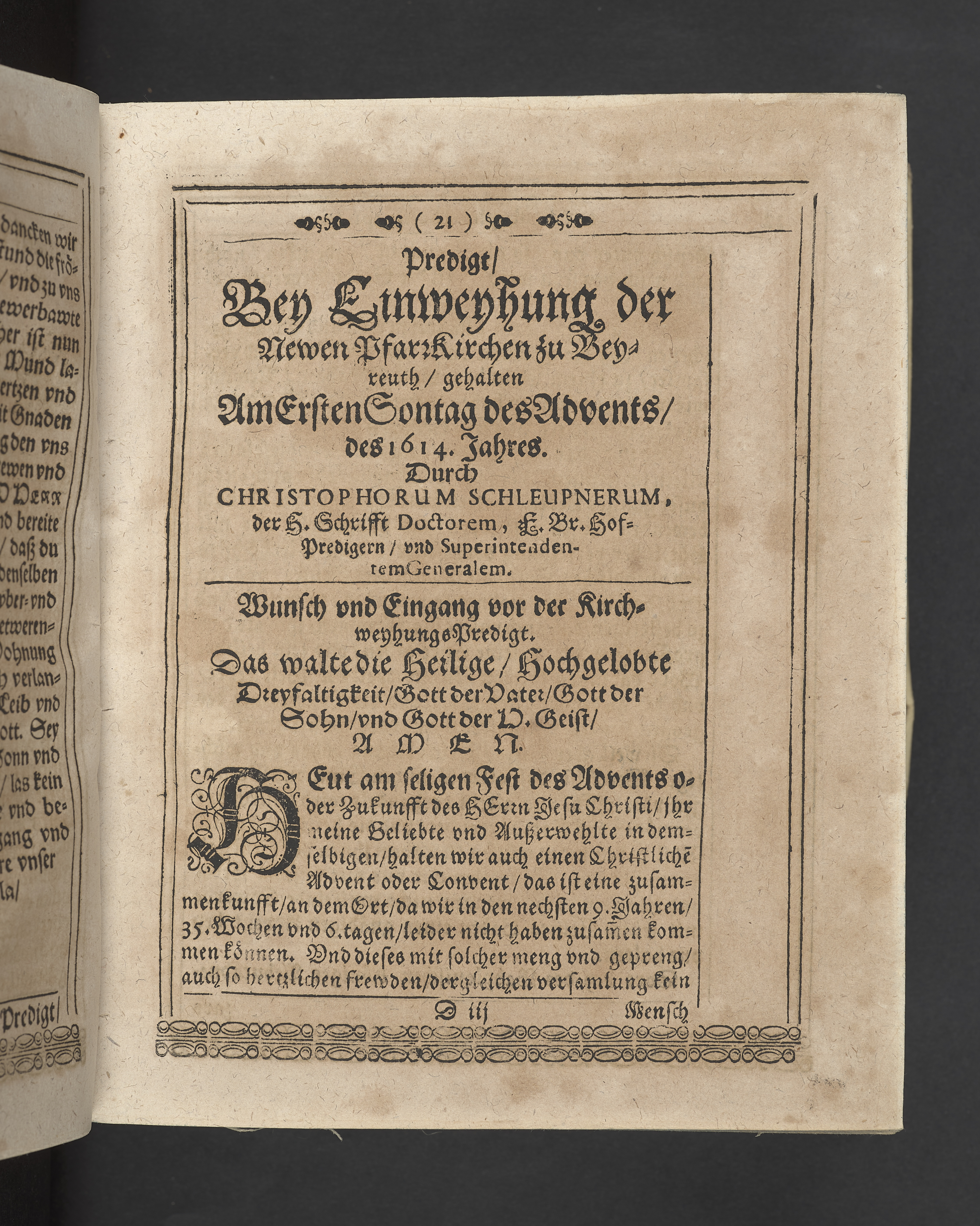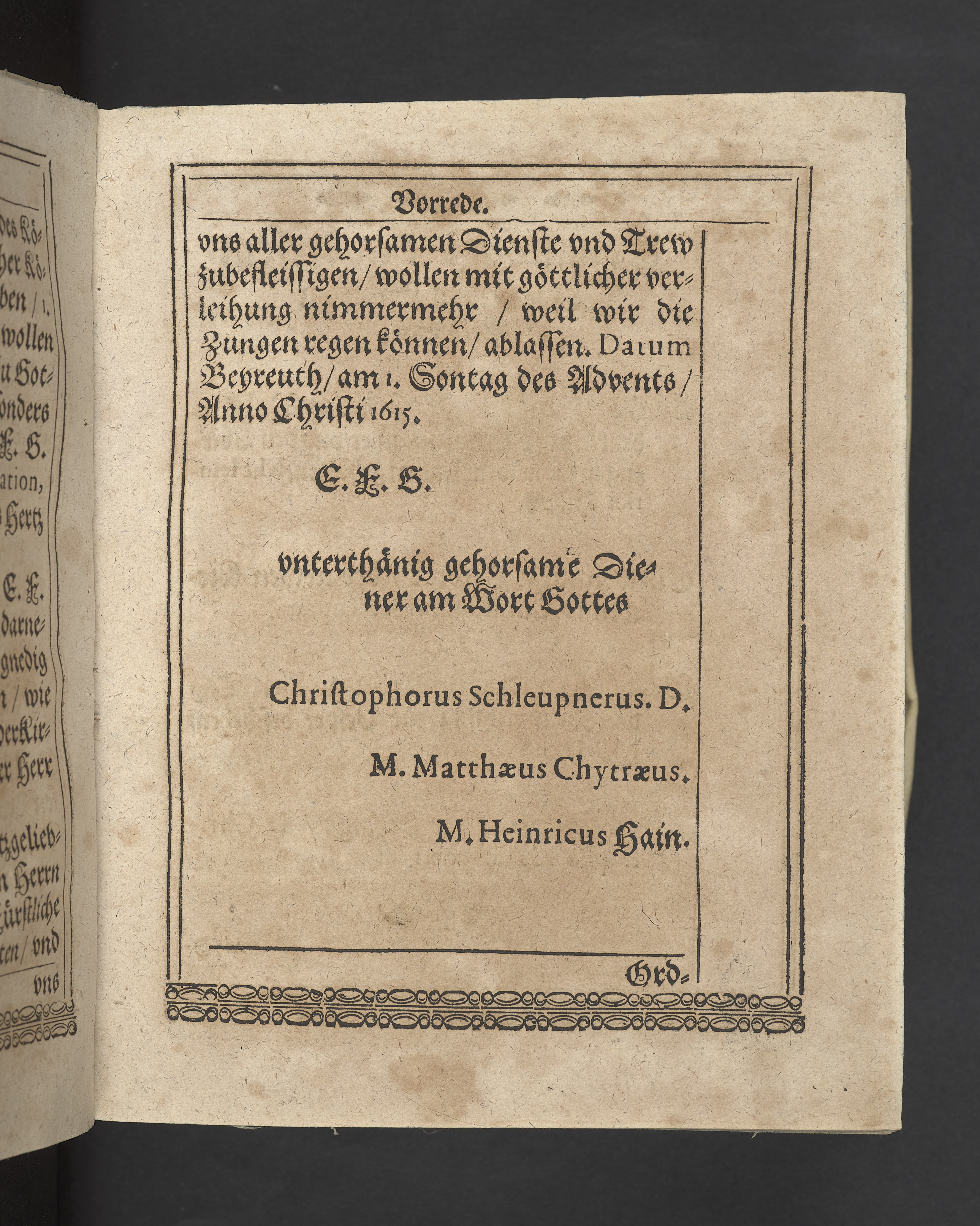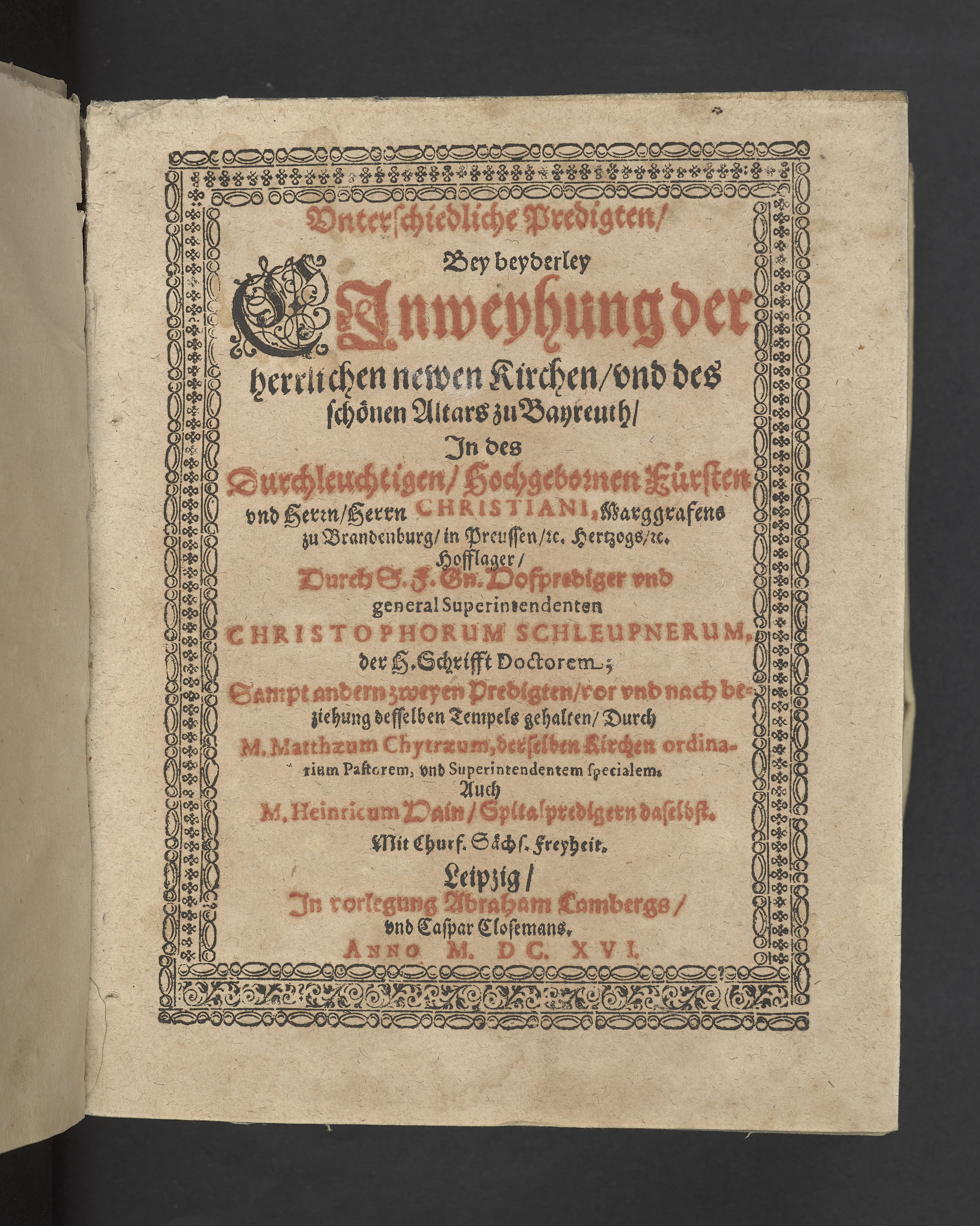Unterschiedliche Predigten, bey beyderley Einweyhung der... newen Kirchen, und des schönen Altars zy Bayreuth... Durch Christophorum Schleupnerum... Sampt andern zweyen Predigten... durch Matthæum Chytræum... Auch M: Henricum Dain... Leipzig, in vorlegung Abraham Lambergs und Caspar Closemans anno MDCXVI. (Kolofon:) Typis Lambergianis, gedruckt durch Johann Glück...