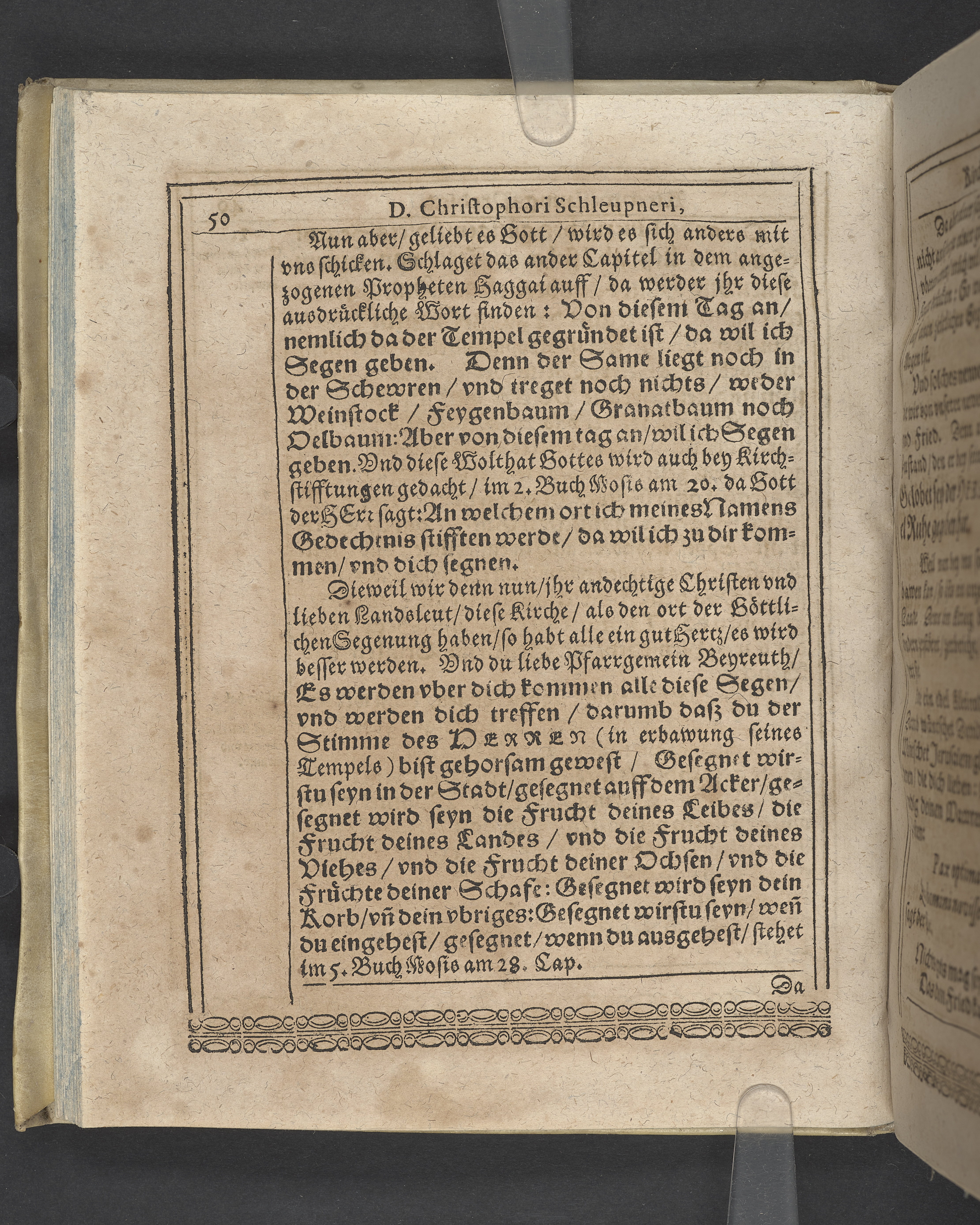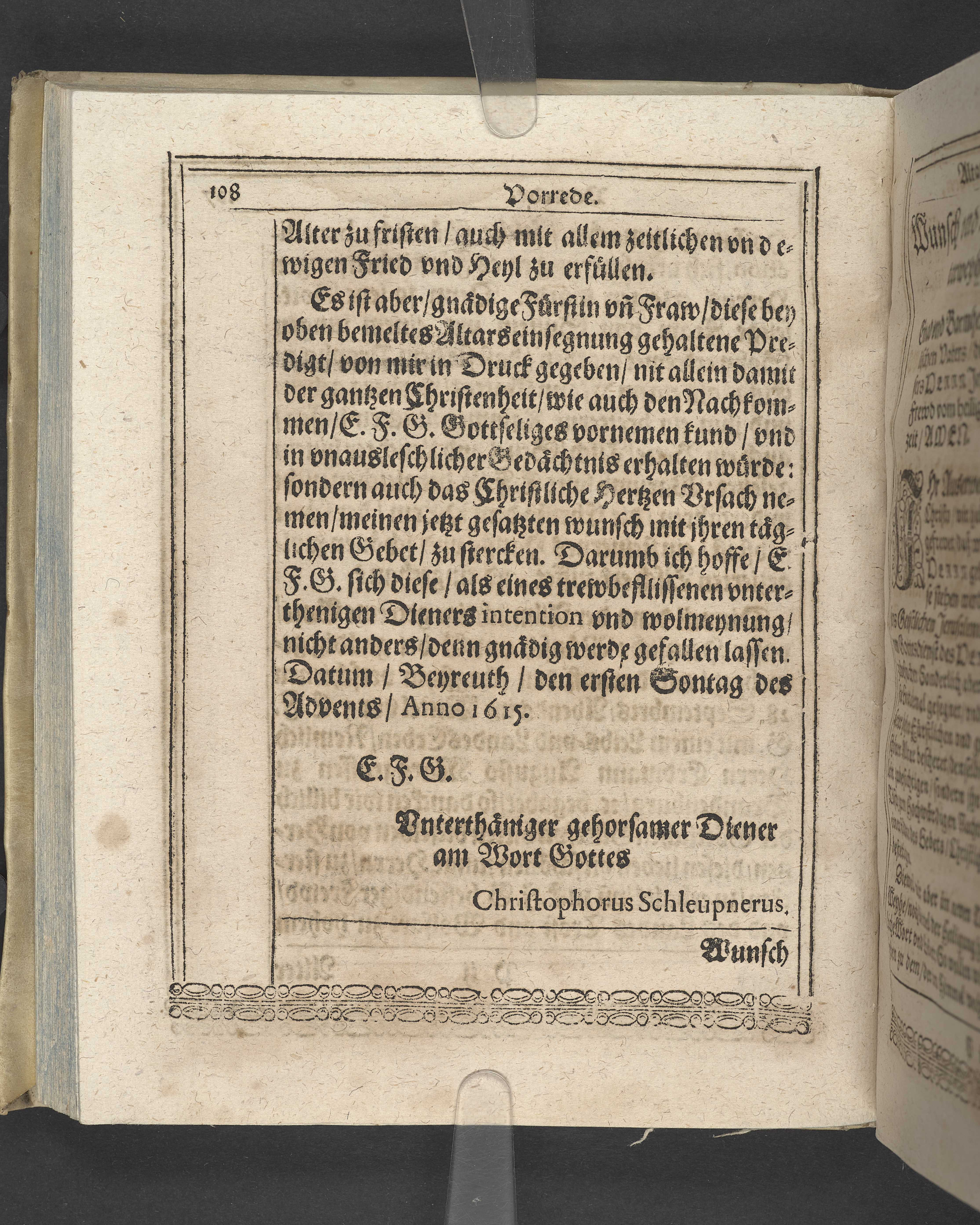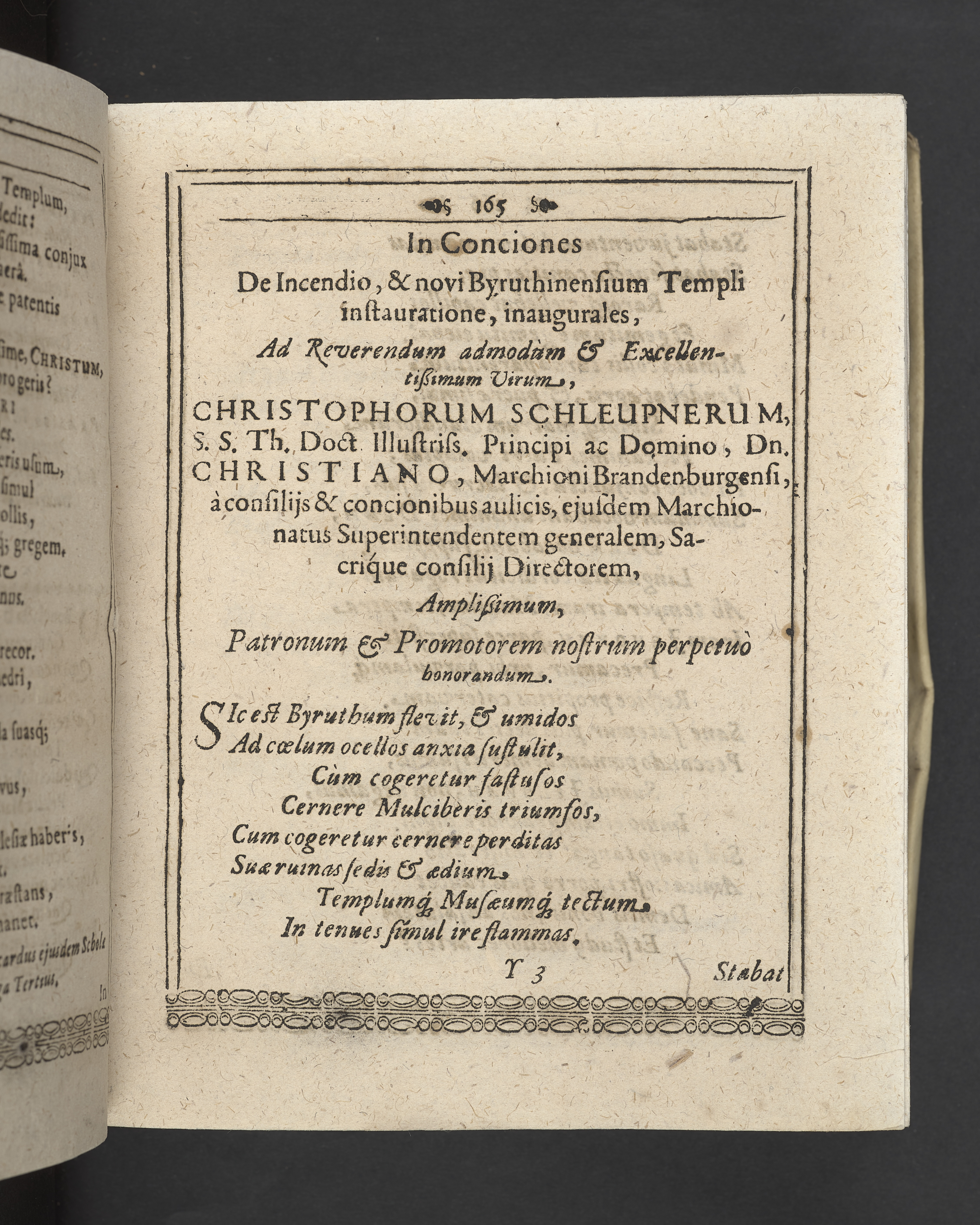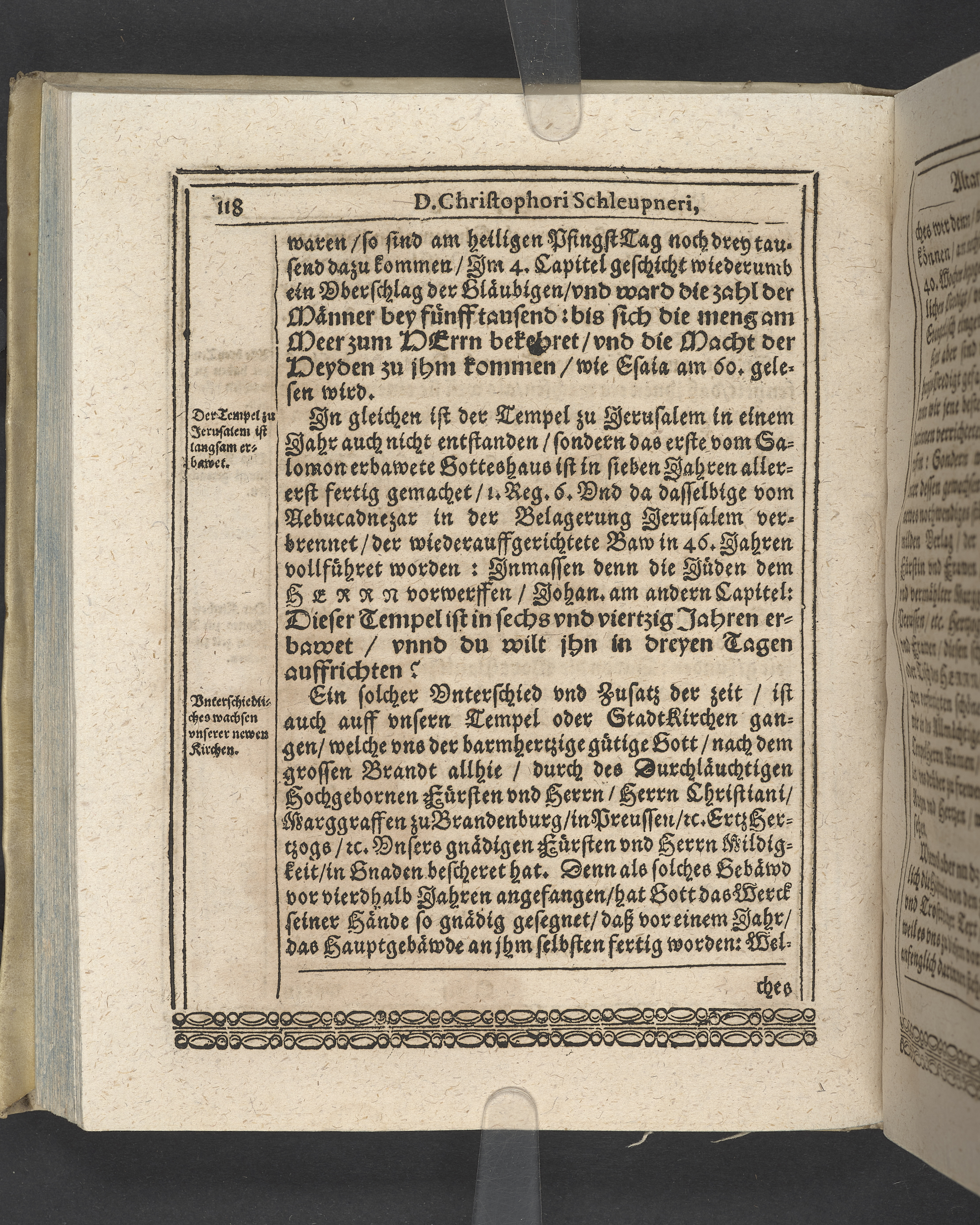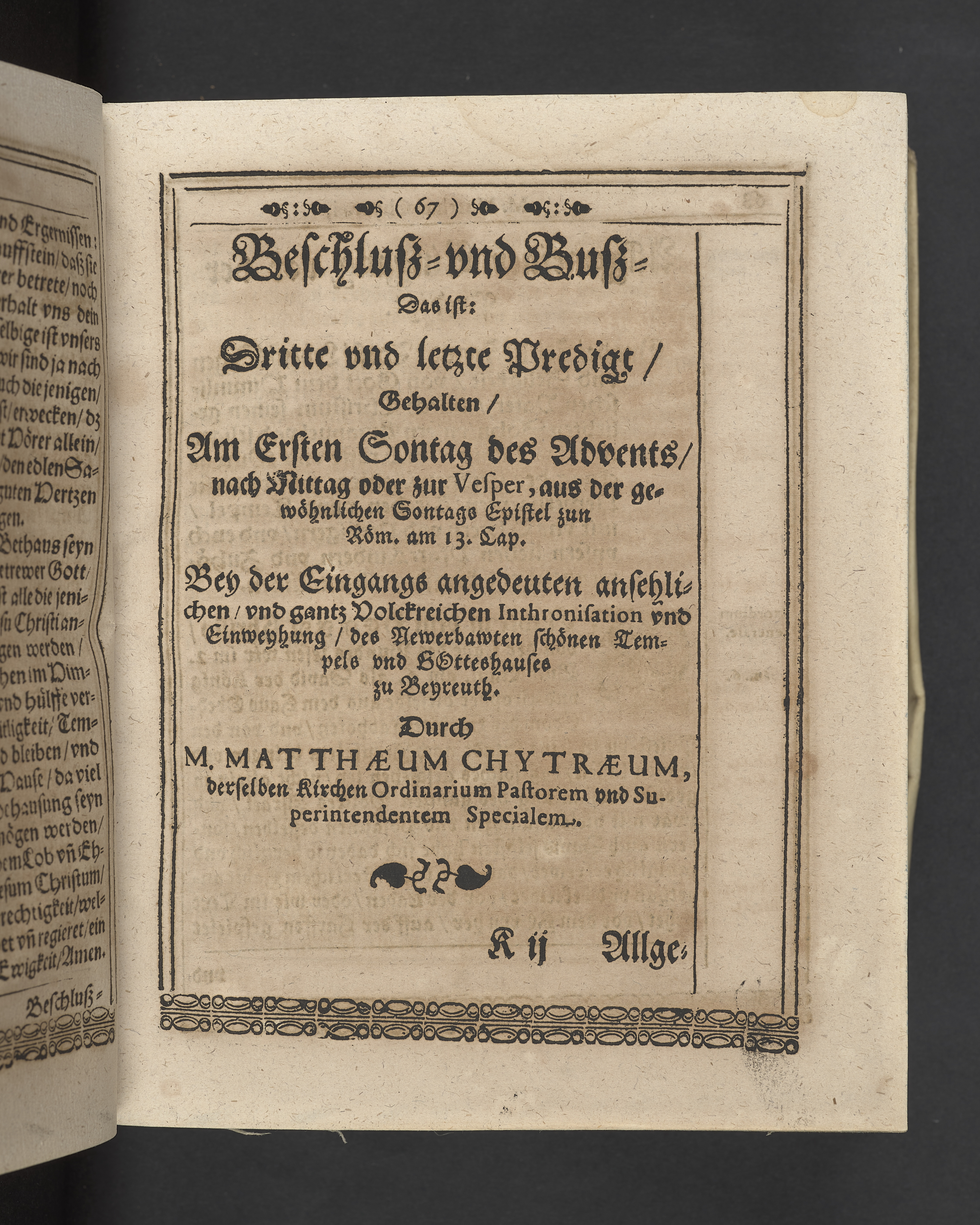 Unterschiedliche Predigten, bey beyderley Einweyhung der... newen Kirchen, und des schönen Altars zy Bayreuth... Durch Christophorum Schleupnerum... Sampt andern zweyen Predigten... durch Matthæum Chytræum... Auch M: Henricum Dain... Leipzig, in vorlegung Abraham Lambergs und Caspar Closemans anno MDCXVI. (Kolofon:) Typis Lambergianis, gedruckt durch Johann Glück...