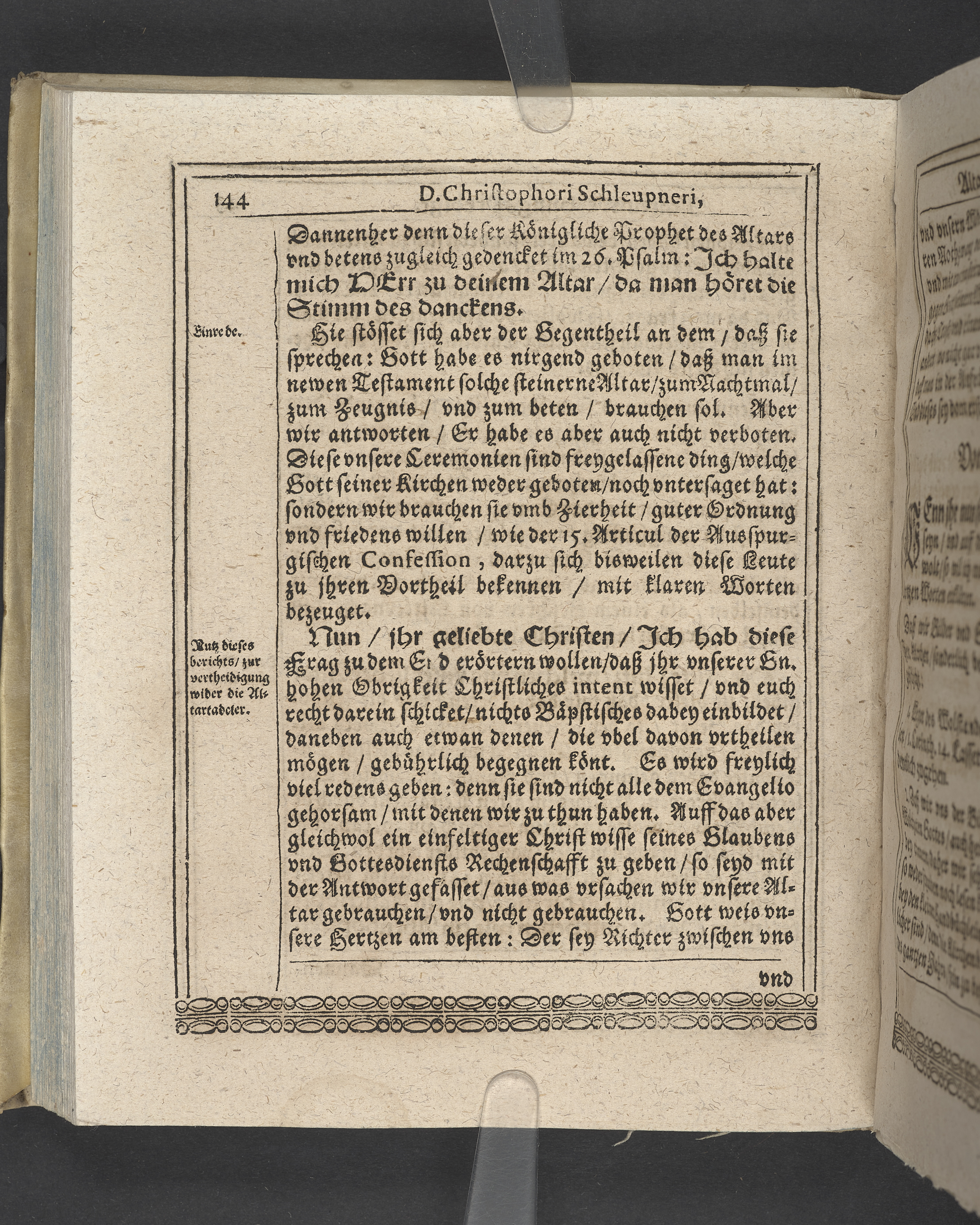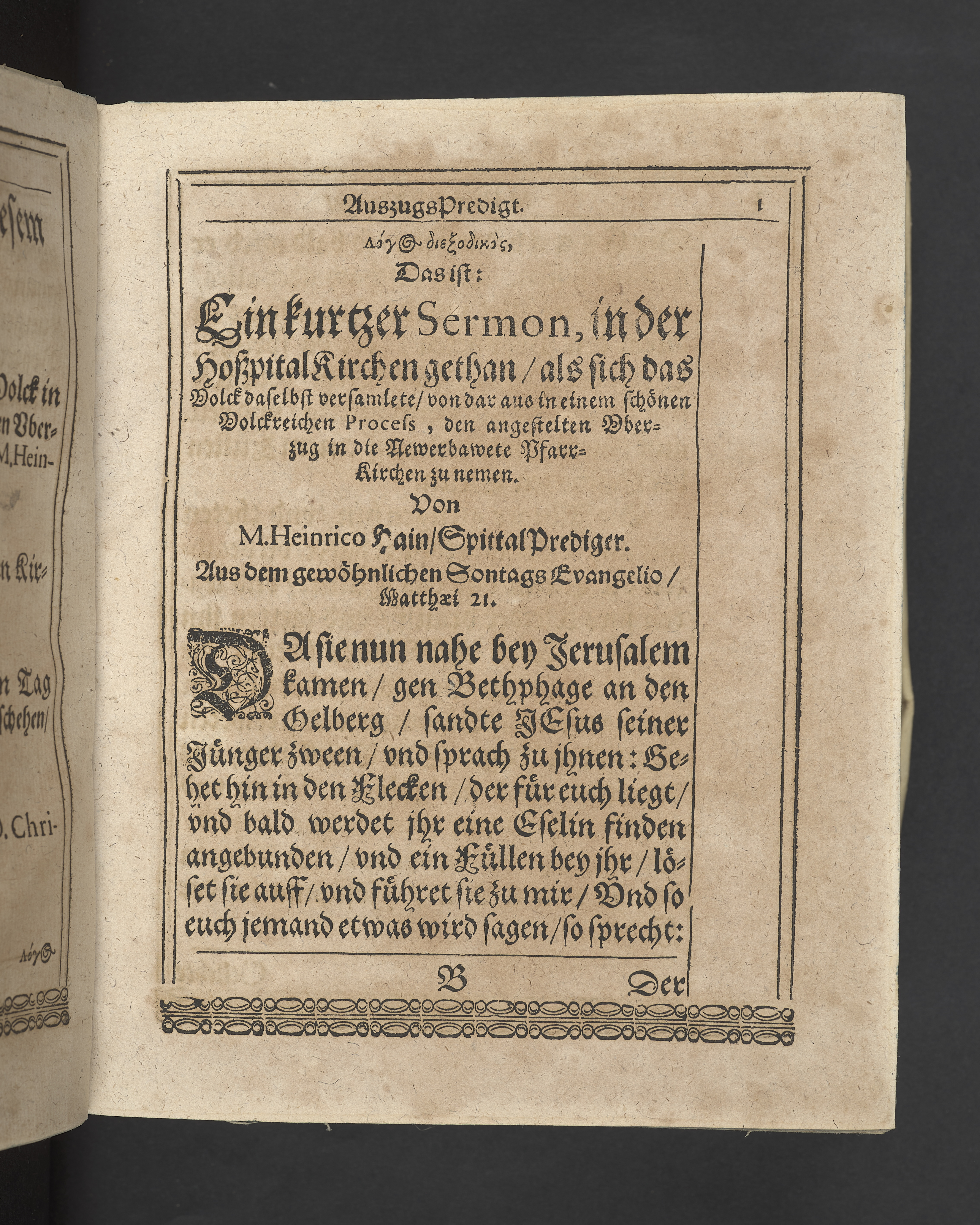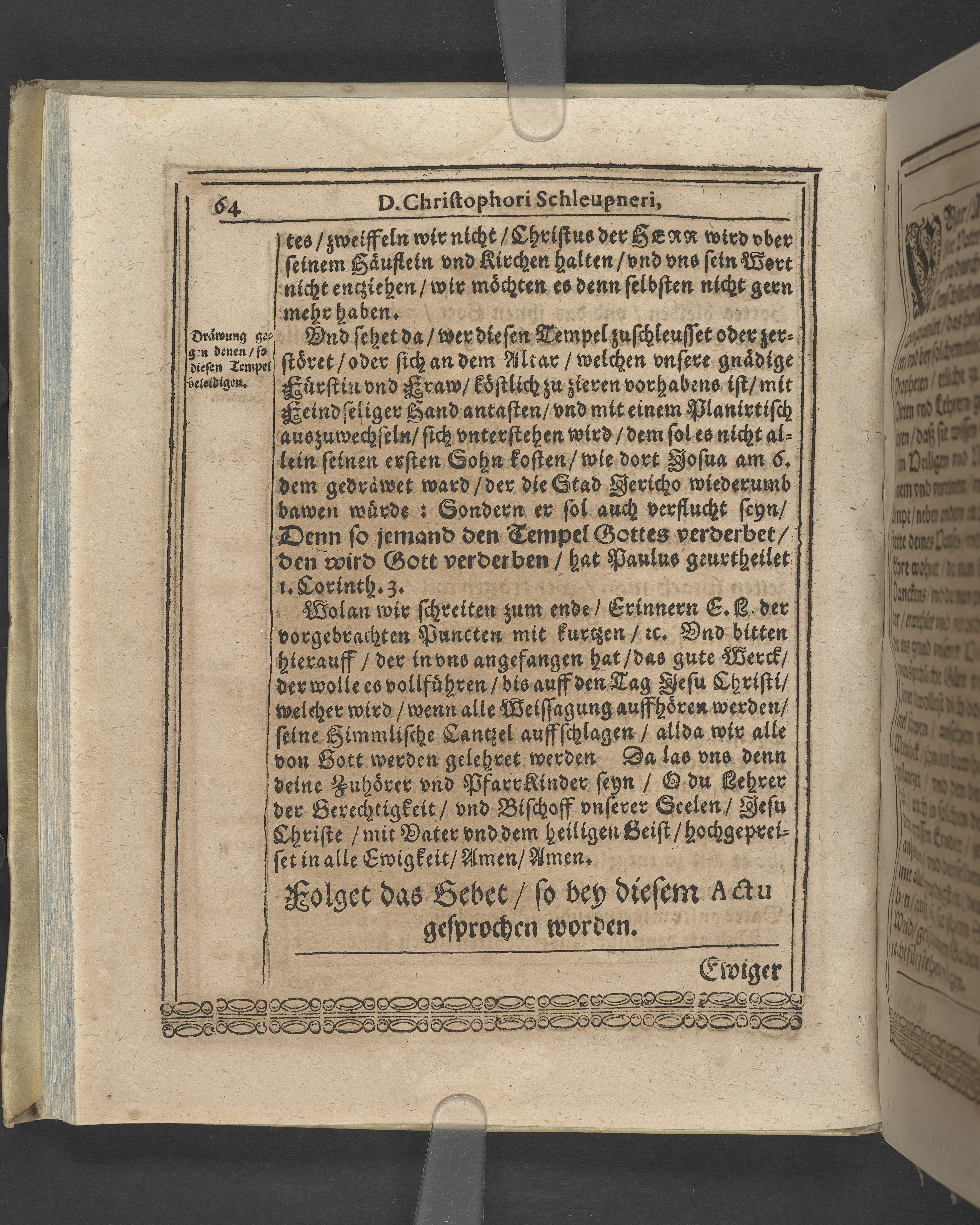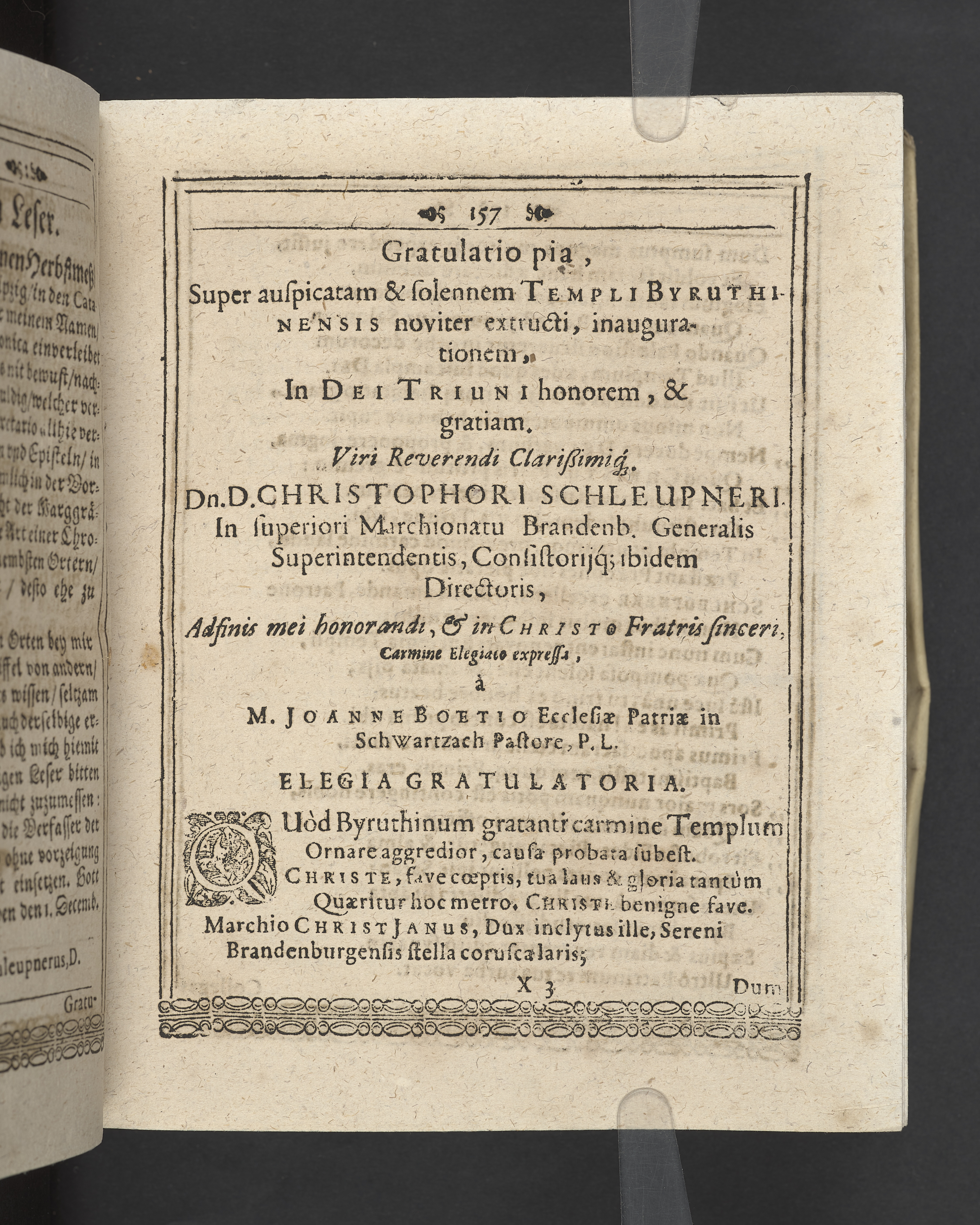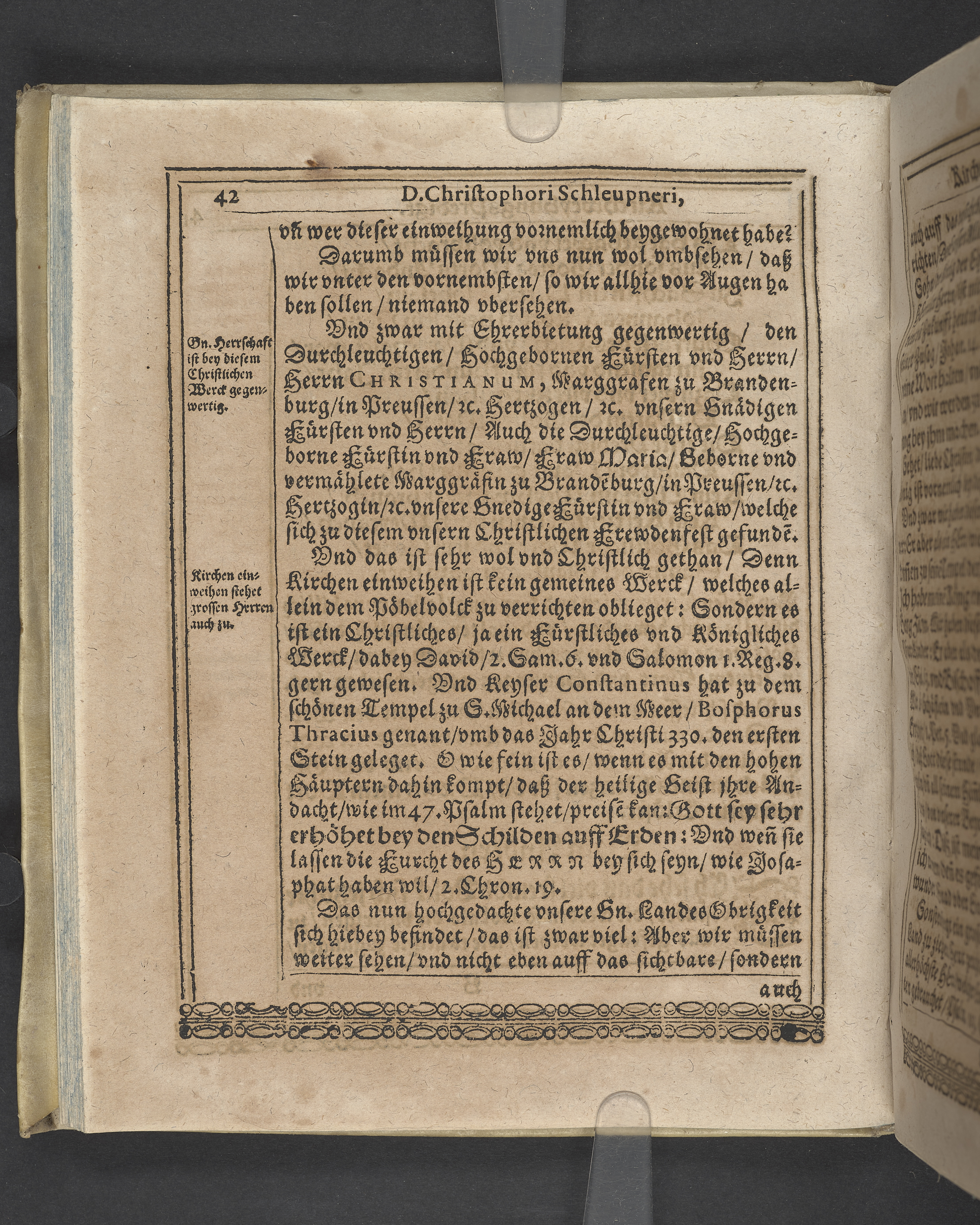 Unterschiedliche Predigten, bey beyderley Einweyhung der... newen Kirchen, und des schönen Altars zy Bayreuth... Durch Christophorum Schleupnerum... Sampt andern zweyen Predigten... durch Matthæum Chytræum... Auch M: Henricum Dain... Leipzig, in vorlegung Abraham Lambergs und Caspar Closemans anno MDCXVI. (Kolofon:) Typis Lambergianis, gedruckt durch Johann Glück...