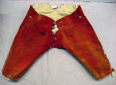 Knälånga byxor av röd sammet fodrade med vitt twills. En bred midjelinningen, 80 mm fram och 90 mm bak. Mitt fram ett sprund med en knäppning bestående av två knappar på höger sida på midjelinningen och två motsvarande knapphål, 40 mm breda, på vänster sida. På vänster sida av sprundet en knappslå med två knapphål, 20 mm. På höger sida två motsvarande knappar. Samtliga knappar är klädda med guldpaljetter och guldtråd i ett korsande mönster. Mitt fram nedanför midjelinningen, två snedställda iskurna fickor, 70 mm långa, med fällbara ficklock. Dessa knäpps med en knapp på sidan i övre kanten. På vardera sida av byxbenen nedanför midjelinningen, en 160 mm lång sprundficka. Ett 180 mm högt sprund i byxbenens nederkant, knäppt med en knapprad av fyra knappar med motsvarande knapphål. Byxbenen är nedtill kantade med en 20 mm bred linning med en knappslå på vilken sitter ett knapphål men knapp saknas. Slå och linning är fodrade med vit atlas. På bakstycket ett sprund i midjelinningen, 110 mm långt. Upptill, vid sidan av sprundet sitter en slå med ett knapphål. Motsvarande knapp saknas. Tre hakar på insidan av midjelinningen.