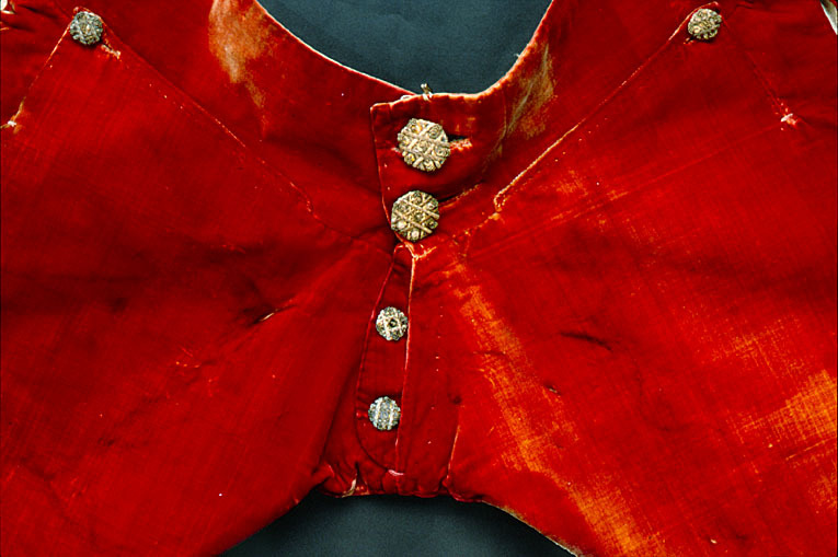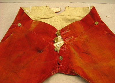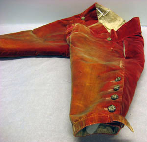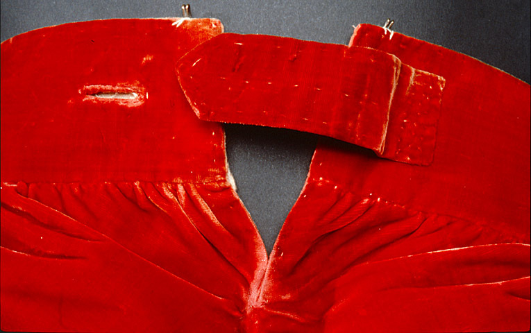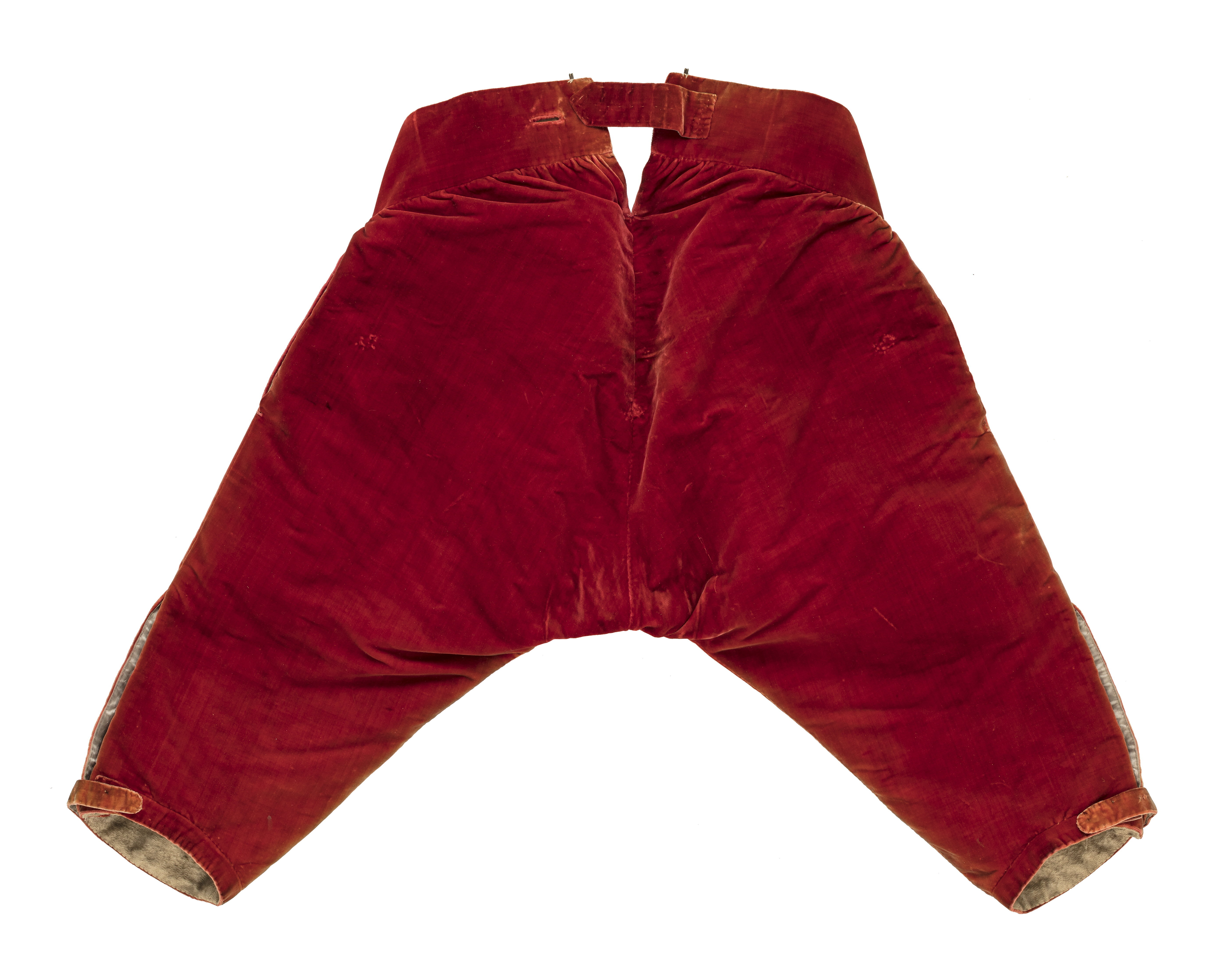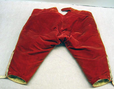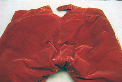 Byxor i röd sammet hörande till Adolf Fredriks serafimerdräkt.