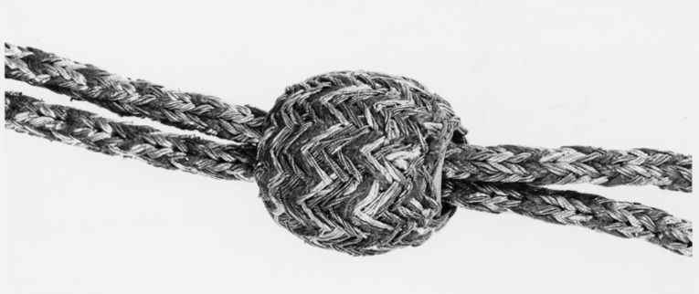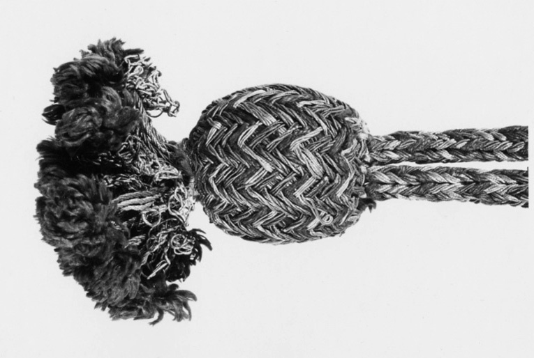 3 långa och 1 kortare samt 8 korta tömmar af silke och silfvertråd, med 18 knappar och knutar.