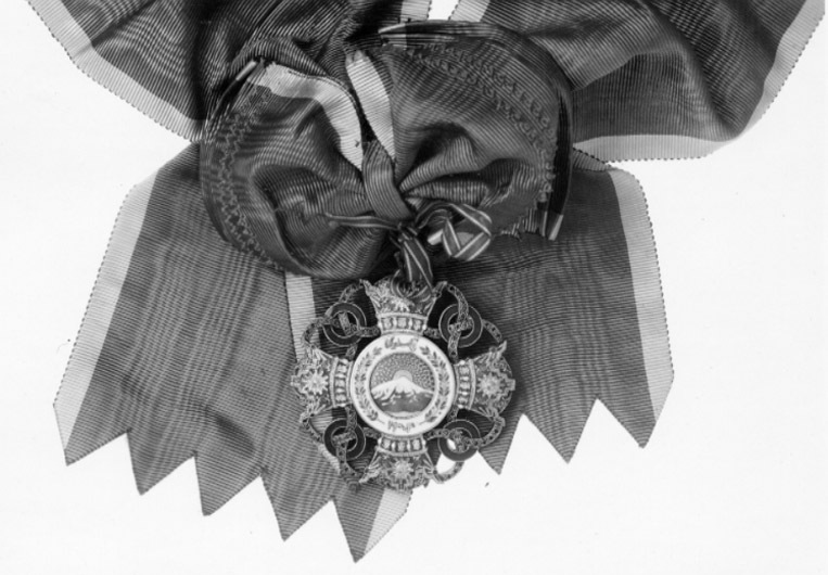 Axelband av blå sidenmoaré med 7 mm breda gula kanter. Tandade bandändar, ca 130 mm därovanför en rosett av bandet, därvid fäst knytband b: 5 mm av bandets färger, i vilket ordenstecknet (nr 1404) är fastbundet. Snedsytt vid axeln. Bäres från höger axel.