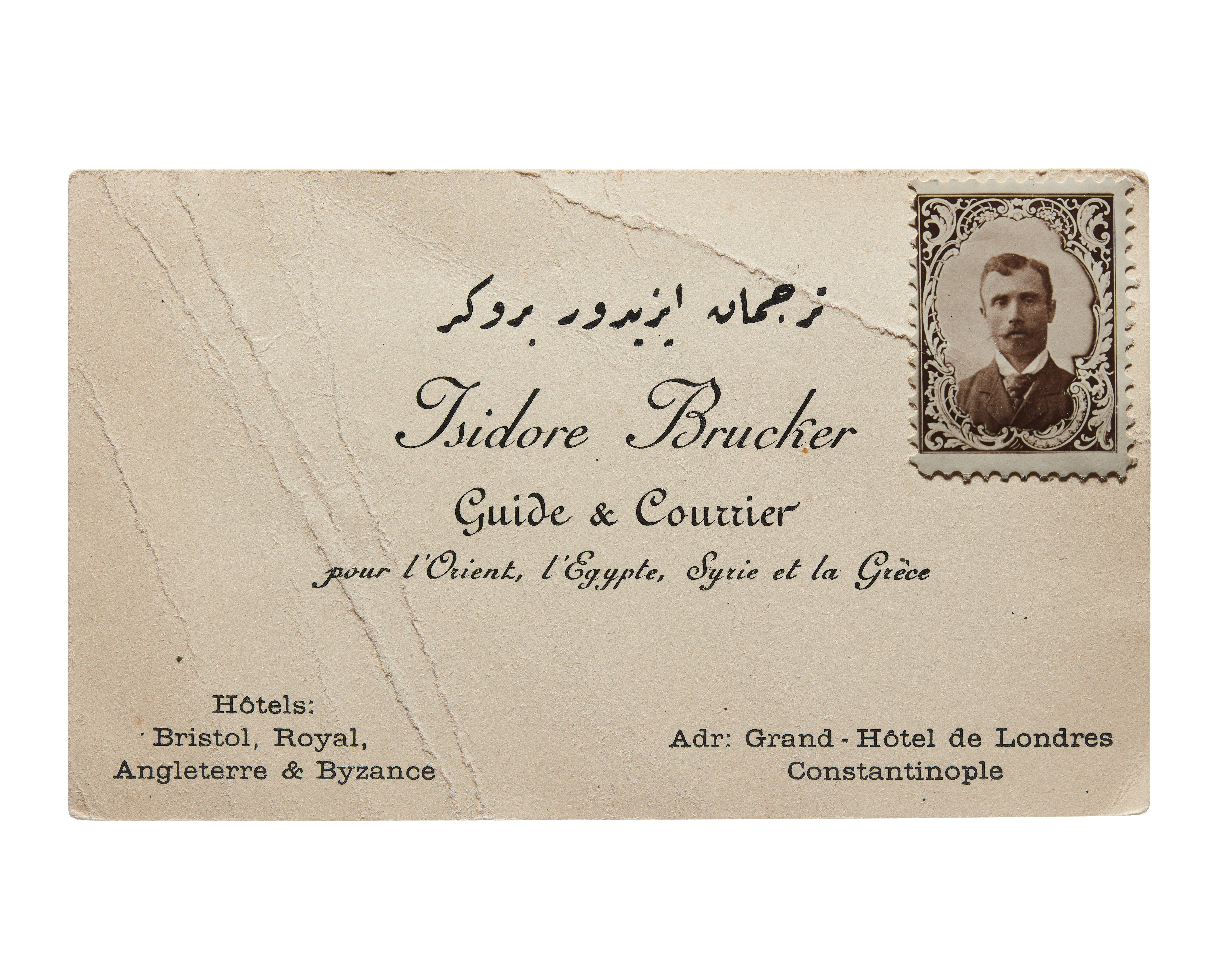 Ett visitkort från Isidore Brucker, Guide & Courrier. Ett frimärke på övre högra hörnet. Adress (nedre vänstra hörnet) Hotel: Bristol, Royal, Angleterre & Byzance, (nedre högra hörnet) Adr: Grand-Hotel de Londres Constantinople. Ovanför namnet står hans namn på ottomanska.