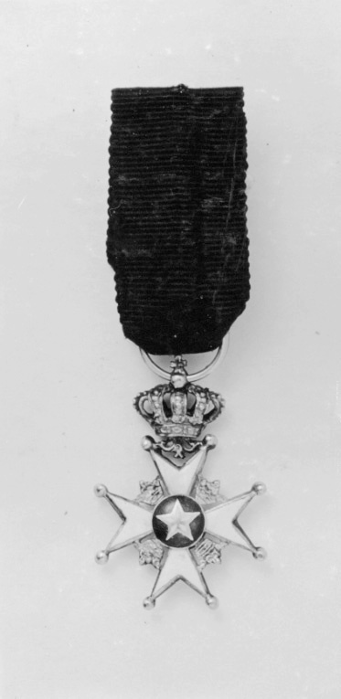 Vitemaljerat malteserkors av guld, kulor på spetsarna, mellan korsarmarna öppna kronor av guld. Blåemaljerad medaljong med femuddig stjärna av vit emalj. Mellan den övre korsarmens spetsar bladornament, däri fäst med scharner en kunglig krona av guld, i äpplet fäst bandring. Igenom ringen draget ett ordensband av svart sidenmoaré, hopfäst med en säkerhetsnål av gulmetall.