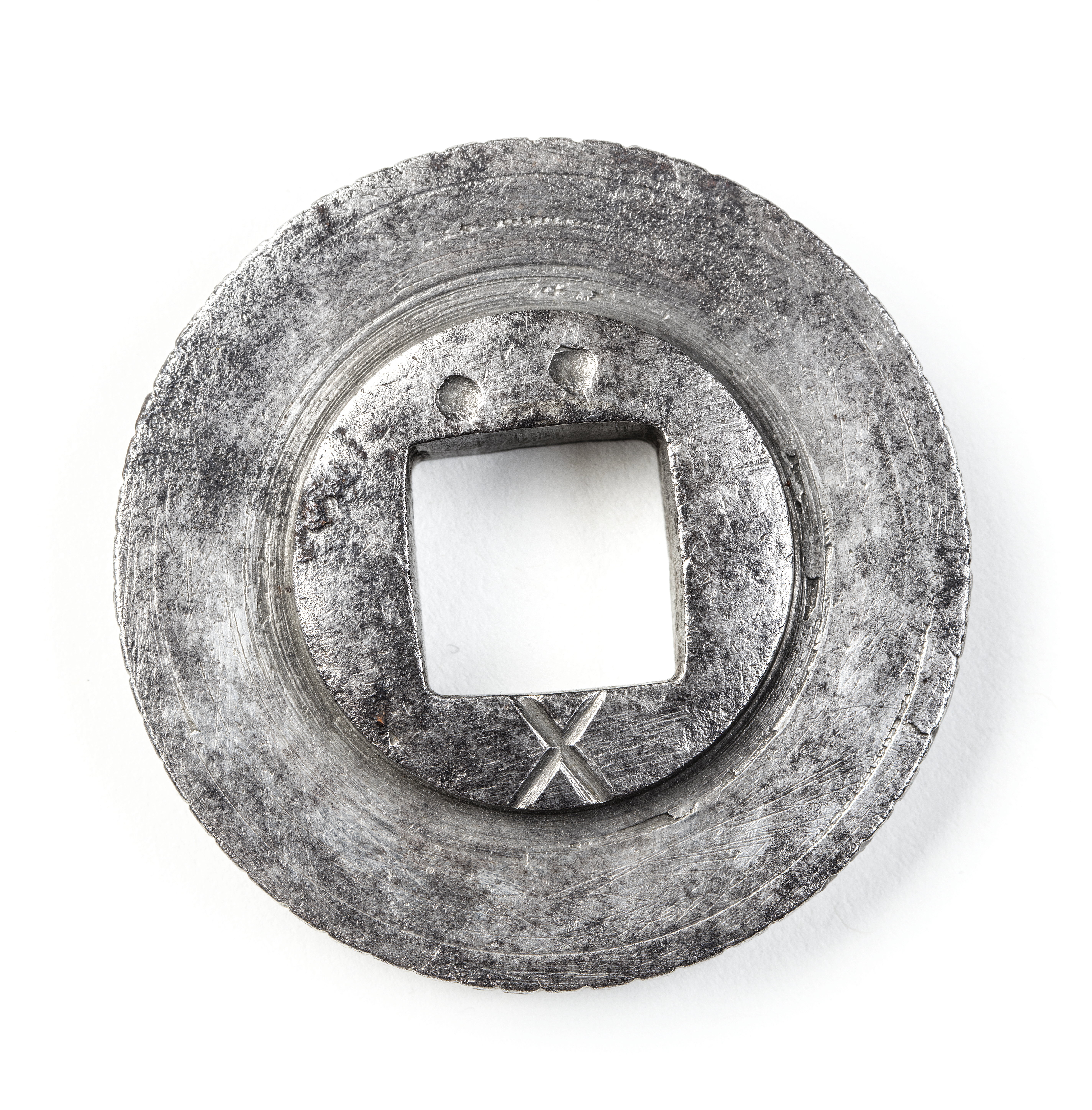 Vals till blyvinda. Runt omkretsen tvärstreck och AHW. I centrum fyrsidigt hål i rund förtjockning. Hålet är på ena sidan märkt med två punkter och X.