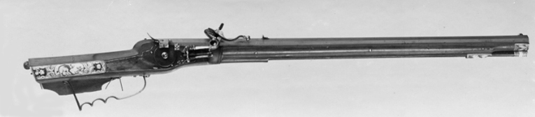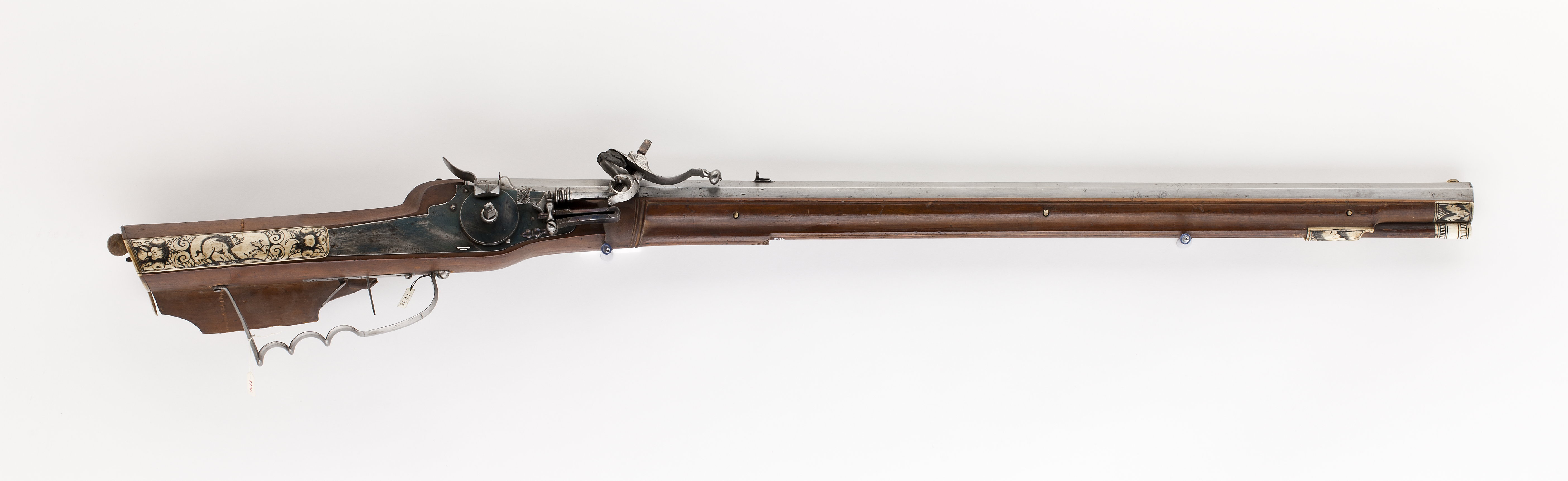 Femsidig pipa av stål med rundad undersida, åtta räfflor. På kammaren två stämplar: M S, pistol och vinranka (Stöckelnr 1009) samt årtalet 1655. Ståndsikte av stål, förgyllt, kraftigt stolpkorn av mässing. Tre häften, pipan fäst med krysskruv underifrån samt tre pipstift av ben. Hjullås av stål med snälltryck. Plant blånerat låsbleck med invändigt hjul täckt av låg, plan hjulkapsel. Fängpanna med bakåtböjd, rundad eldskärm, profilerat tumgrepp fyrkantig, genombruten tryckknapp. Hane med lös överkäke, blånerad hanskruv. s-4orffiigt fingergrepp med kulformig avslutning, något graverad dekor på överkäken. Ringformig han hals, fasad hankropp med skiktad bas, blånerad hanfjäder med balusterformig flik. Två låsskruvar. Helstock av bok(?) med kolv av tysk typ med snidad volut. Inläggningar och beslag av graverat ben. Bakplåt med kolvknapp av stål, kolvlådelock med dekor i form av vildsvin och fruktknippen. Tumgrepp på kolvryggen. Två låsskruvbrickor i blomform, näsband och överrörka med bladdekor. Varbygel av stål med tre fingerlägen. Tillbehör: Laddstock av trä med skoning av ben, två pappersbitar med text:CX No 272 respektive Carl X No 272.