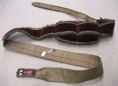 Enkel gjord av ofärgad grövre textil med längsgående mittsöm på insidan. Halva bandet klätt med röd sammet. Kantad med frans av tvinnad guld- och silvertråd, bredd: 17 mm. Bandet löper över en stoppad puta klädd i röd sammet med tvärgående mittsöm och kantning av guld- och silverfrans. Putan är fäst 590 mm från ena änden. Putans längd: 220 mm, bredd: 140 mm, höjd: 50 mm. I ena änden ett fyrkantigt spänne i gulmetall med löphylsa och en nål. Spännet fäst i hälla av rött skinn, fastsydd med snöre runt om. I andra änden vit läderrem med 12 hål och spetsigt avslut. Klädd på ovansidan med röd sammet, bredd: 28 mm, längd: 450 mm.