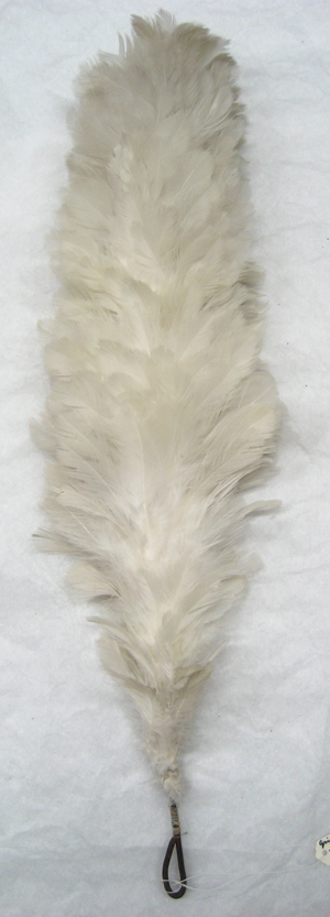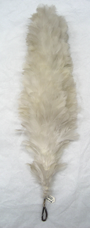 Rak ståndarplym av vita, klippta tuppfjädrar. Fjädrarna är sammanfästade på ett rakt skaft av stål. Vid skarven mellan fjädrar och skaft är virat med gråvit tråd.