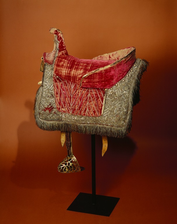 Har enligt traditionen tillhört drottning Kristina. Klädd med röd sammet på säte, bom, kåpor, och sadelknapp. Bommen har invändigt spår av vertikalt påsydda silversnören. Kåporna med ursprunglig dekor i form av smala silvergaloner. Sadeltäcket med heltäckande dekor av påsydd silverlan samt silver- och guldtråd. Täcket kantat med karaftig frans av silvertråd och brandgul silketråd. Bakbom och sätets främre del kantade med tännikor av förgylld mässing, sammanlagt 31 st. Täcket fodrat med läder. Sätets inre längd: 340 mm Bakbommens höjd: 100 mm Sadelknappens höjd: 160 mm Stomme av trä, klädd med tuskaftsvävt grovt tyg. Fast stoppning. Bossor saknas, men har funnits - i stommens vardera nedre hörn finns två hål för fastgörande av desamma. På stommens vardera sida finns tre vita läderstroppar, för fastspännande av sadelgjorden. I bakvalvet finns ett spänne för svanskappan, i framvalvet finns krampa för stiglädret samt en läderhängare.