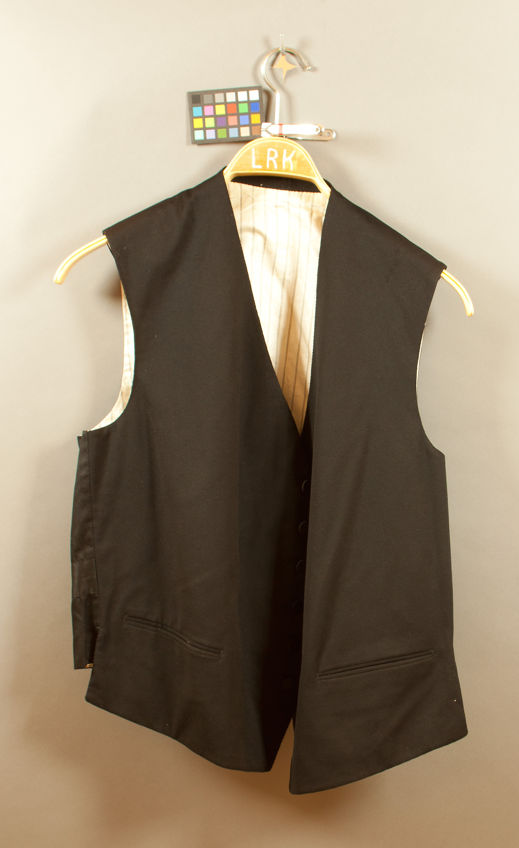 Väst av svart kläde. enkel knäppning med sex plana zinkknappar, klädda med svart bomullskypert, d: 15 mm. kragöppning långsamt avsmalnande ned mot knappraden. Ärmlös. Två stolpfickor nedtill. Bakstycke av svart bomullssatäng, kilar och sprund nedtill. Spänntampar. På ena tampen en vit vaxduksetikett fastsydd: " L G. HANNES & SOHN // BONN a. Rh // H. Lakai Vessmann" och på söljan: " SOLIDE ". Foder av vitt bomullssatäng med smala svarta ränder.