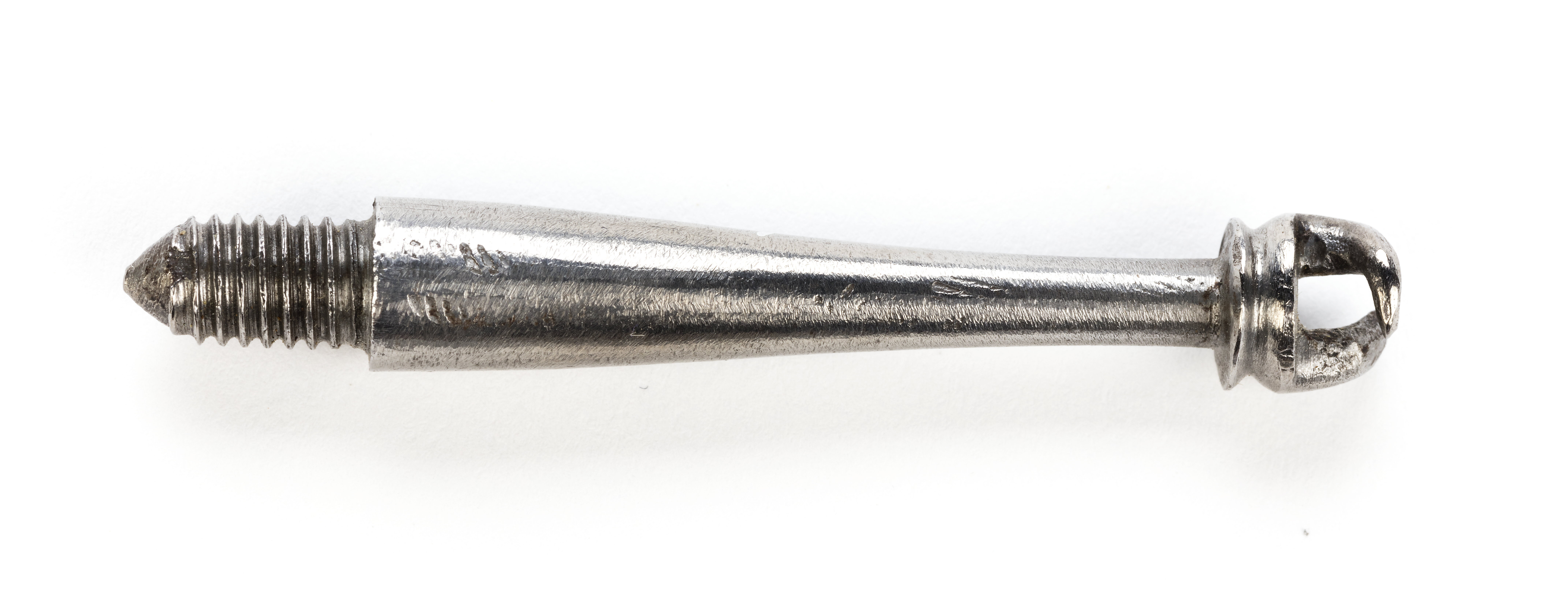 Krats bestående av runt huvud med V-formig skåra runtom och två höger- respektive vänstervridna spetsar på ovansidan. Uppåt avsmalnande, runt skaft och nertill en gängad del för laddstocken, l: 11 mm, spetsig ände.