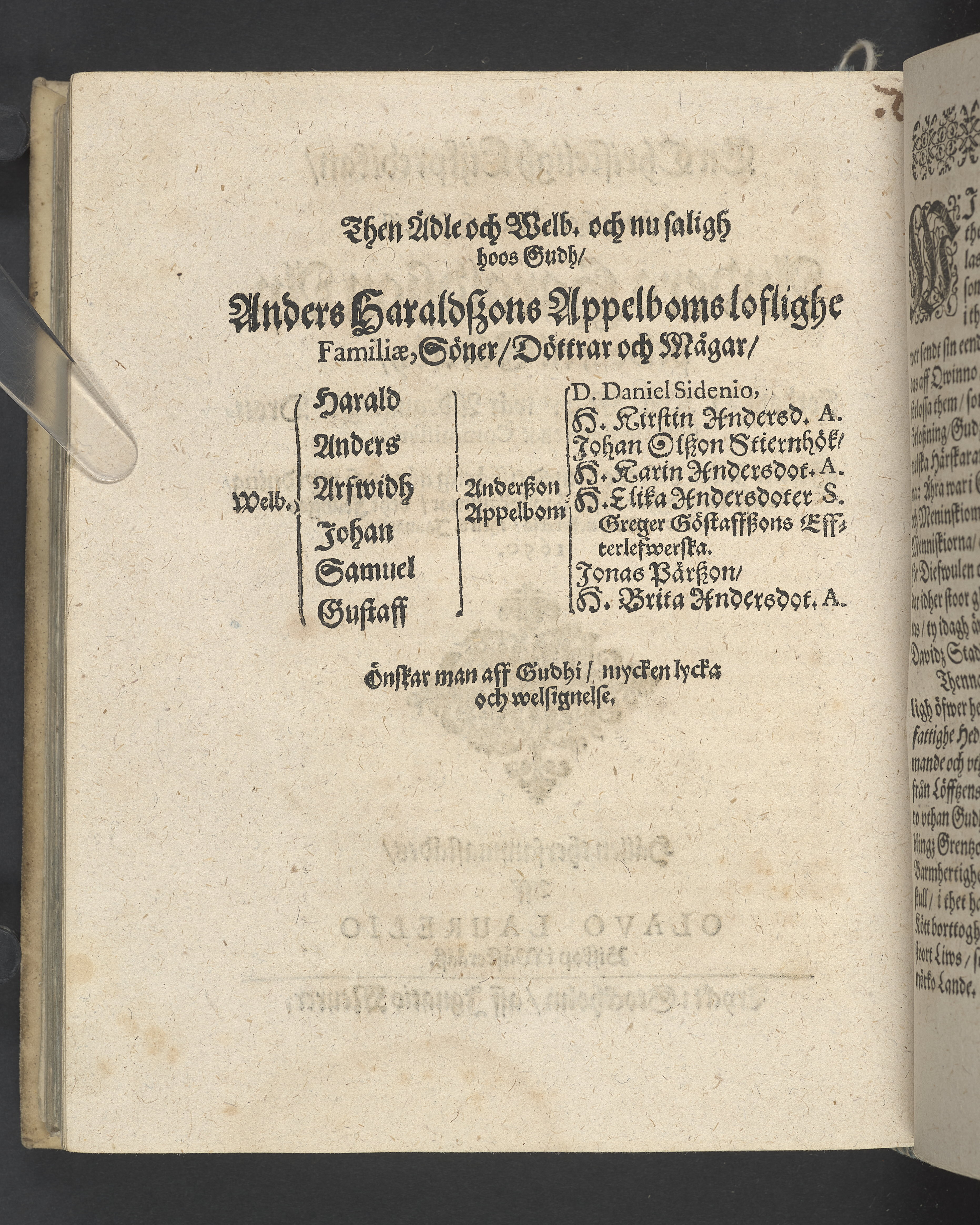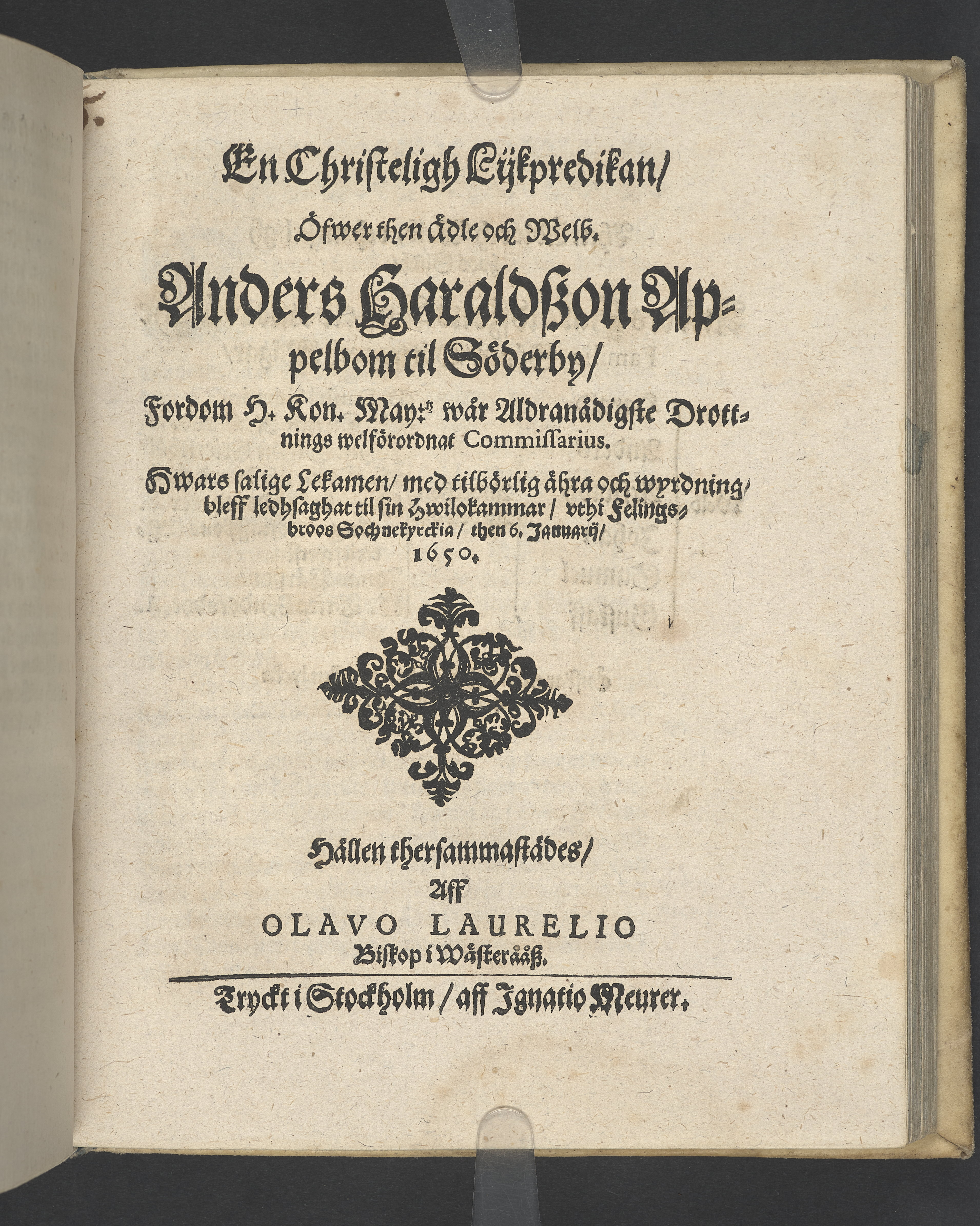 En christelig lijkredikan, öfwer... Anders Haraldsson Appelbom til Söderby... uthi Felingsbroos sockenkyrckia, then 6. januarii 1650... Tryckt i Stockholm, aff Ignatio Meurer.
