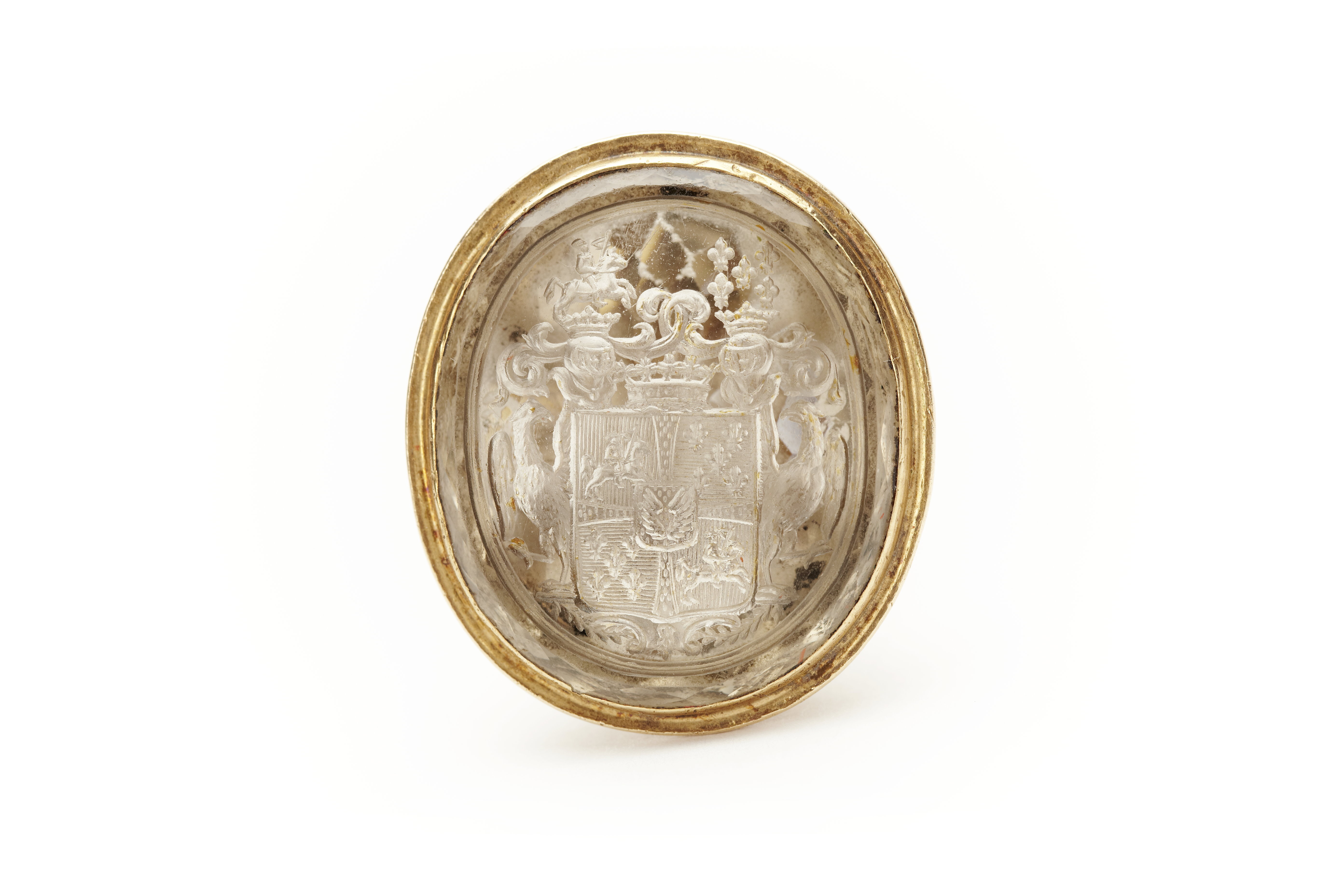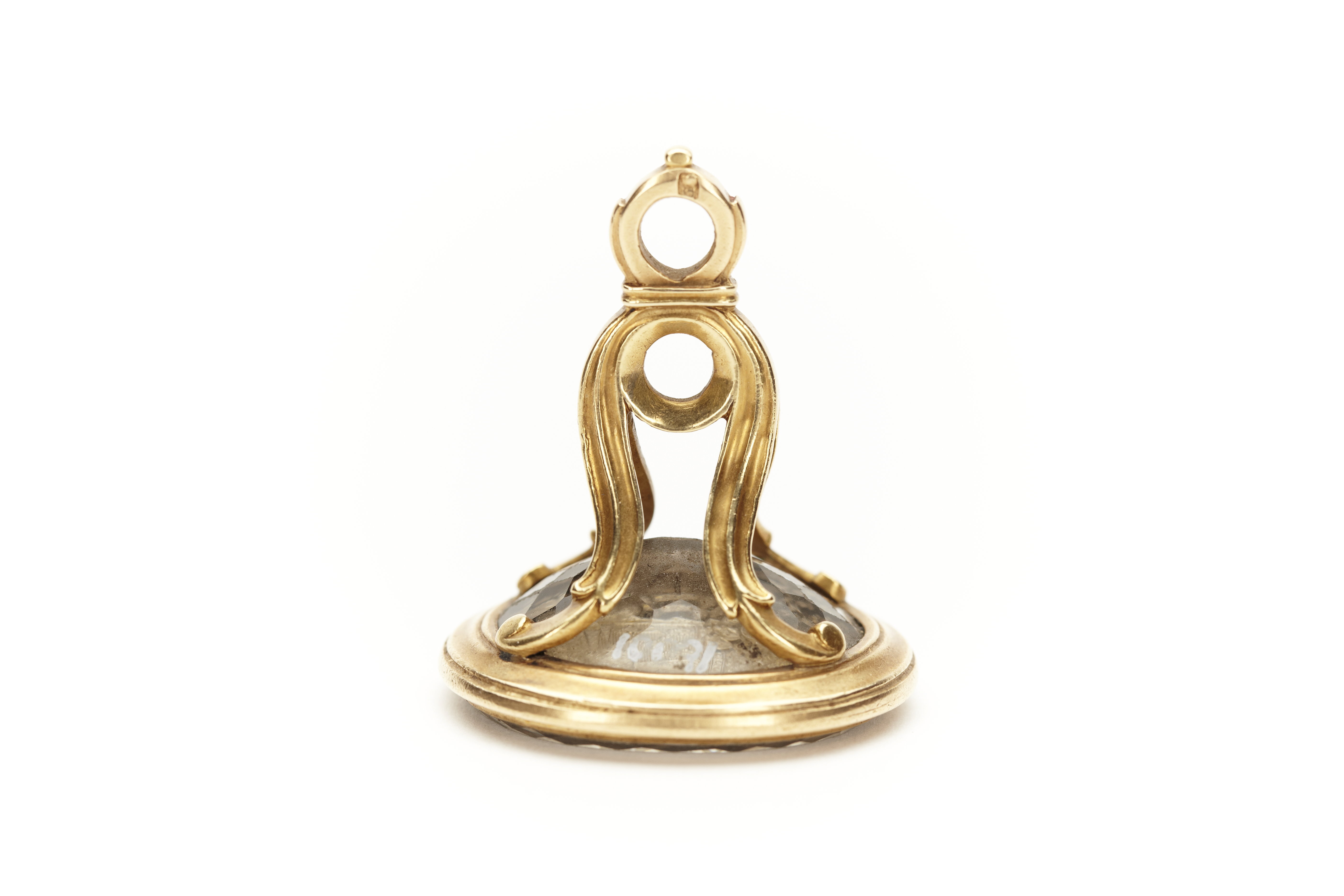 Nyrokoko, 1800-tal. Guld, oval bergkristall med stora Brahe-vapnet. Grepp i form av fyra långstäckta slingor förenade upptill omkring en ring. Överst ännu en ring. Oval stamp av bergskristall i slät fattning med stora brahevapnet. Stämpel: Otydlig, möjligen GS, G5 1831, G3 1861, ej identifierad.
