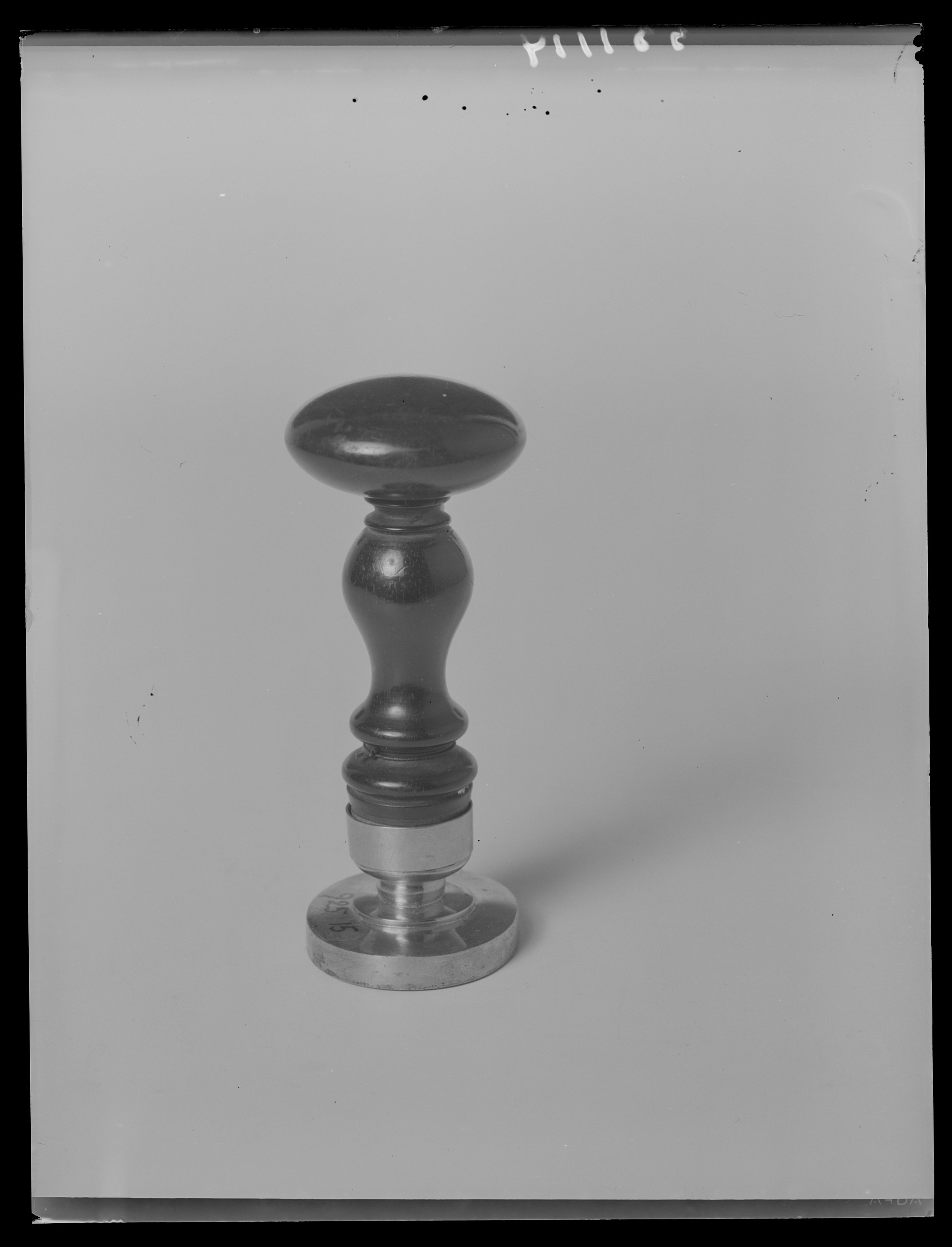 Oval platta av stål, däri graverat vapen, skrafferade färgangivelser. Sköld av fransk typ, kluven av smalt band med något utböjda ändar, tre kronor och folkungalejonet, hjärtsköld Holstein-Gottorp. Runt skölden Nordstjärne-, Svärds- och Serafimerordens kedjor med tecken. Vapentält krönt av kronprinskrona. Slät kantring. På plattans ovansida rund platta, därpå svarvad skaftkula, bärande en något större stödplatta för skaftet. Svarvat skaft av ebenholts(?), nederdelen balusterformig, upptill linsformig skiva, d: 37,4 mm. Nertill skoning i form av kopparring, b: 7,5 mm.