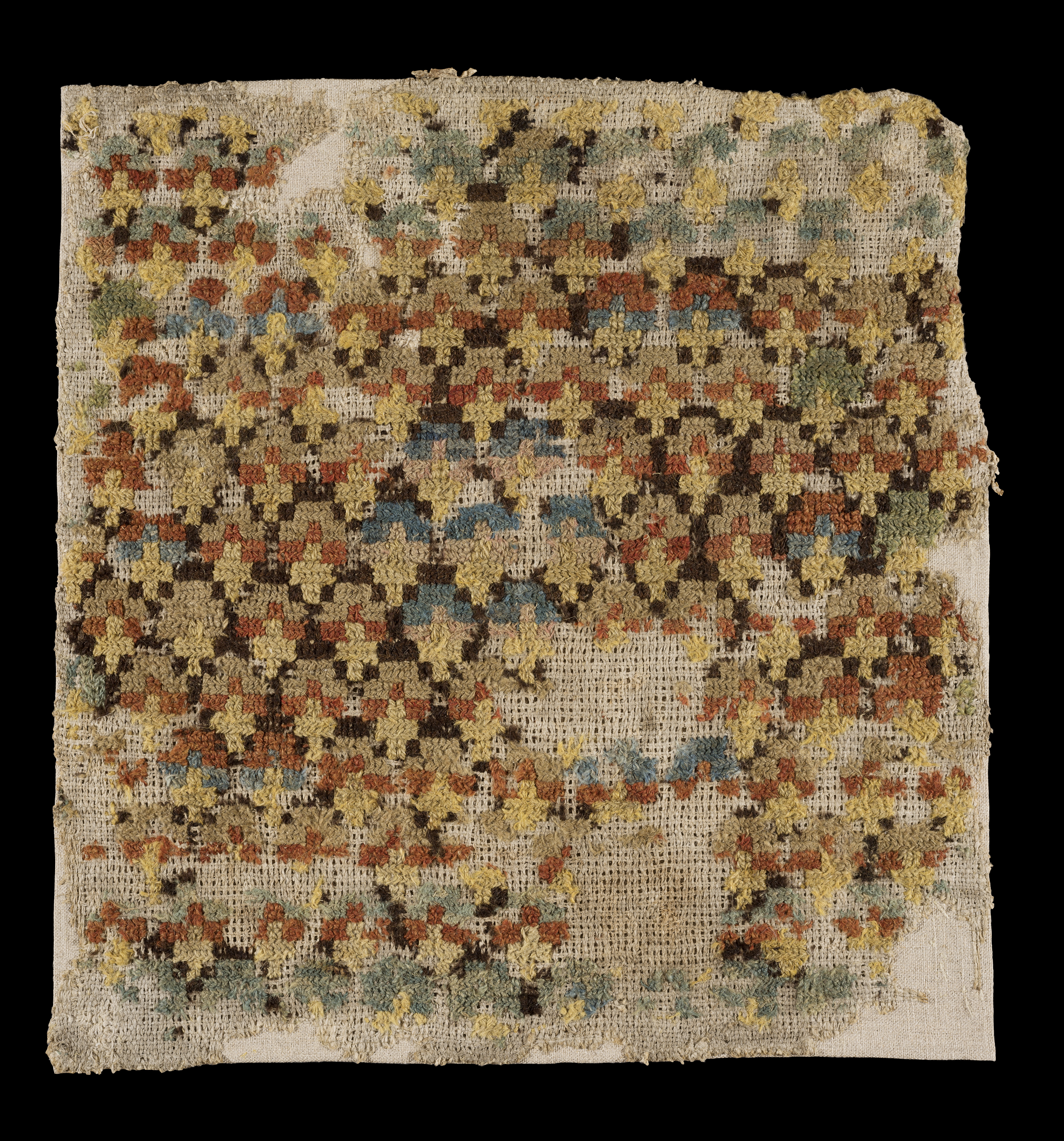 Grov tvistväv av lin. Tvistbroderi i ullgarn. upprepningsmönster i gult, rött, blått, grönt och brunt. Baksidan troligen ursprungligen av nöthud med hårsidan innåt, fragment av sämskinn, linne i spetskypert samt svart yllekypert. Deponerad 1915. (Utställd 1997) Dynan har ett geometriskt mönster i fyra färger och är utförd på 1400-talet. Här och var är broderiet bortnött. Det gör att vi kan se tyget. Under medeltiden kallades detta tyg tvistväv. Det kan ha gett namn till tekniken tvistsöm. Tvistväv är en tuskaftsväv där trådarna följs åt två och två i båda riktningarna. Tyget kallas även panama.