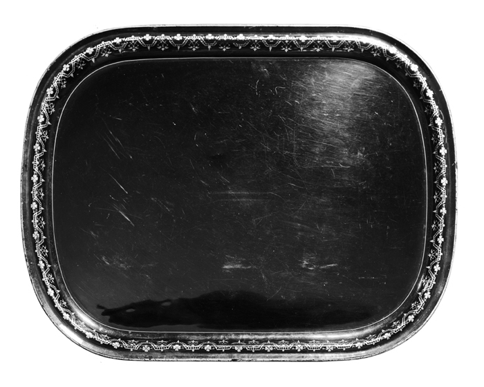 BRICKOR två stycken Av svartlackerad järnplåt. Avlång med bågformiga ändar och snett uppviket profilerat brätte. Dekor: I guld på lackeringen. Höjd: 2,8 cm, längd: 71,5 cm och 76,5 cm, bredd: 55 cm och 59,5 cm. Överförda av Wilhelmina von Hallwyl år 1916 från säteriet Ericslund till Hallwylska huset, Stockholm.