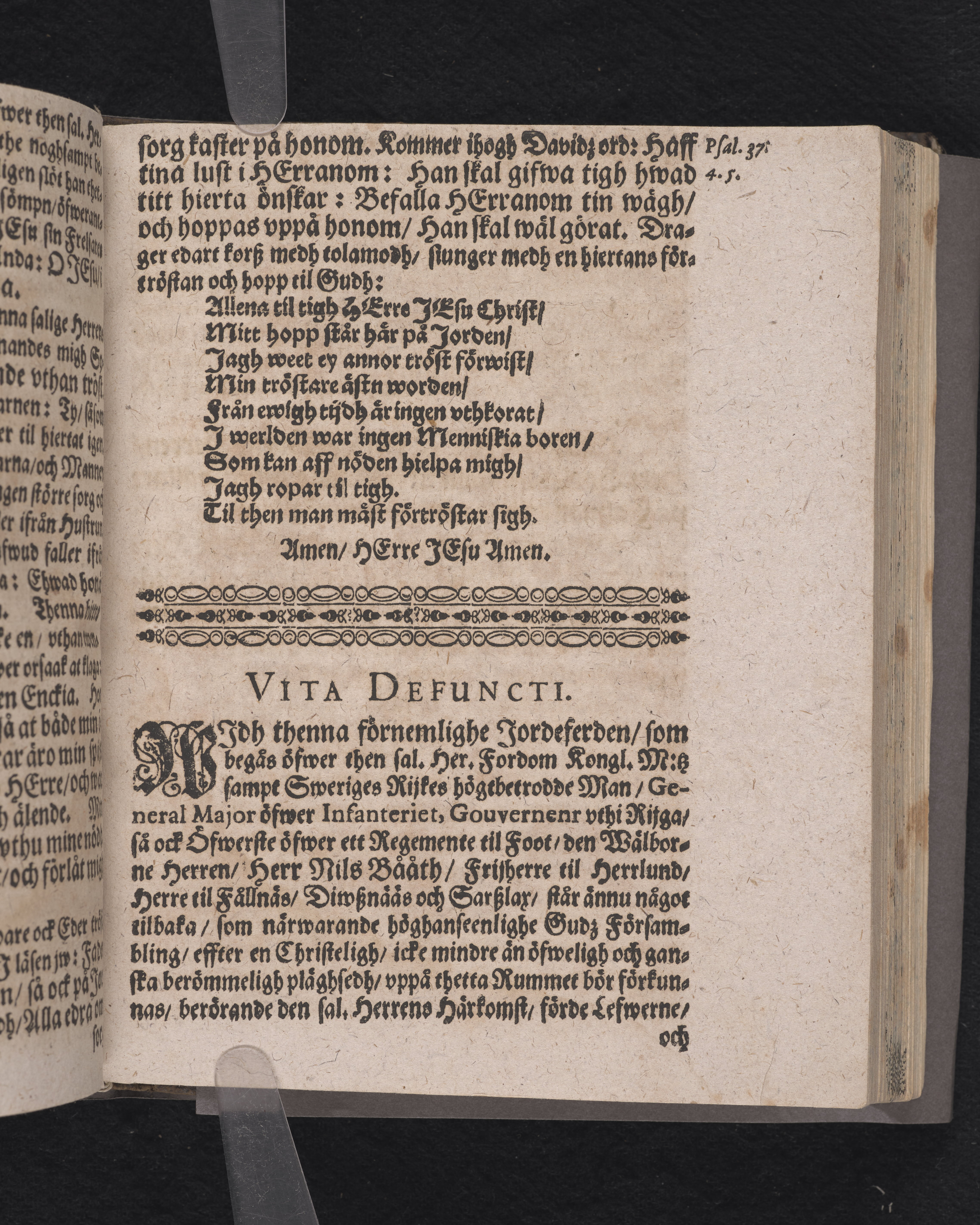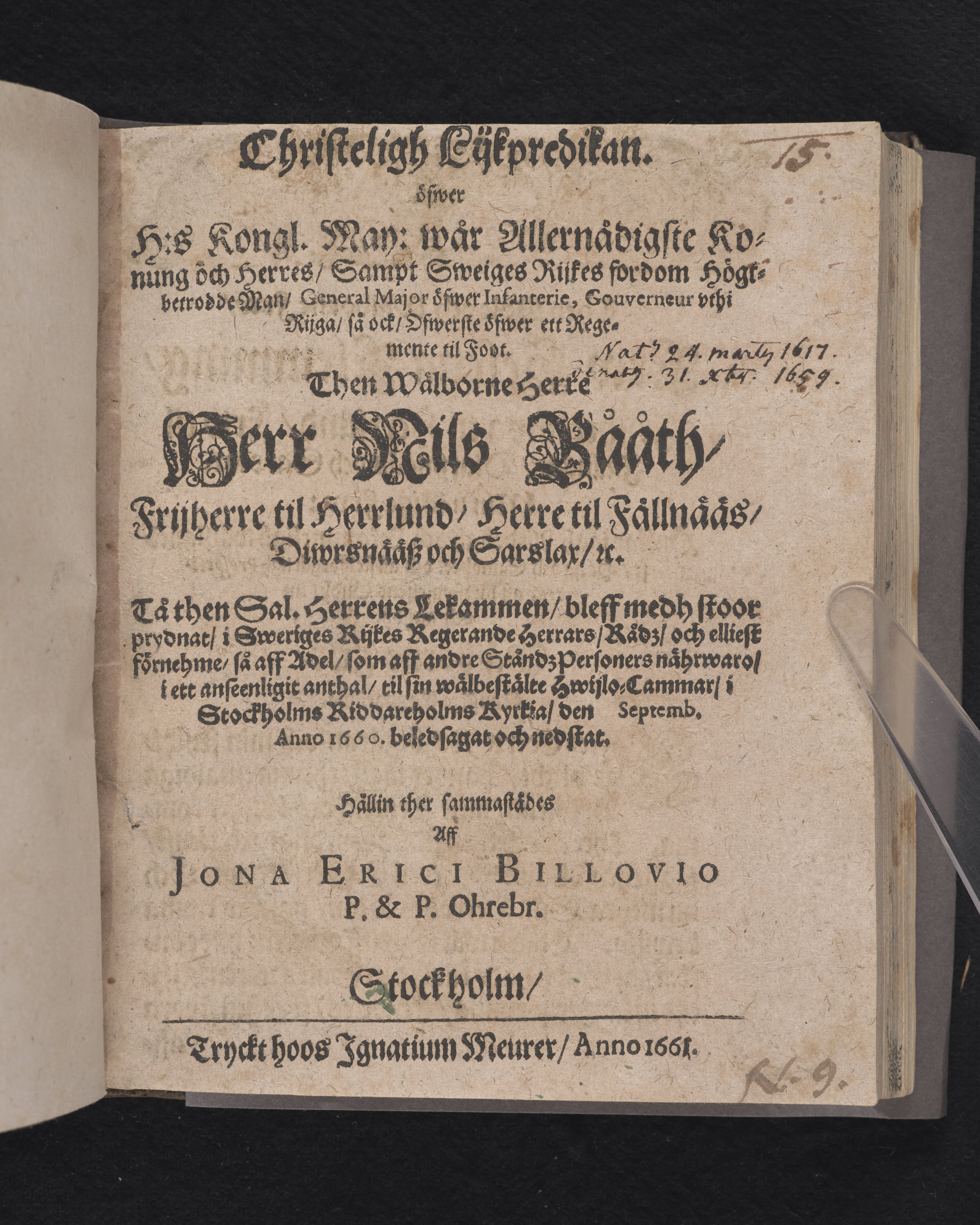 Christeligh lijkpredikan öfwer ... Herr Nils Bååth, frijherre till Herrlund ... tå then sal. herrens lekammen, bleff ... i Stockholms Riddareholms kyrkia, den Septemb. anno 1660. beledsagat och nedstat. Hållin ther sammastädes aff Jona Erici Billovio p. & p. Ohrebr. Stockholm, tryckt hoos Ignatium Meurer, anno 1661.