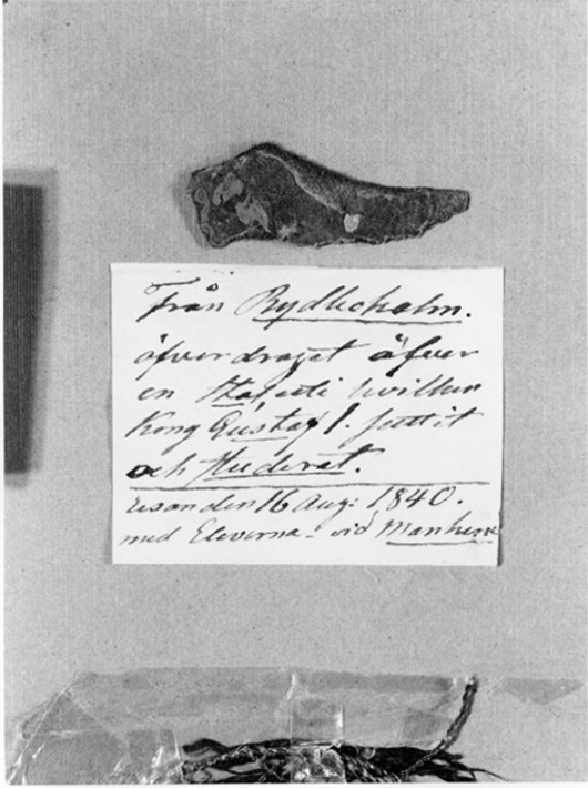 Oregelbunden läderbit med spår av grön, målad dekor. Nedanför läderbiten klistrad etikett med bläckpåskrift: "Från Rydboholm // öfverdraget öfver // en Stol, uti hvilken // KongGustaf I suttit // ochstuderat // resan den 16 aug. 1840 // med Eleverna vid Manhem"