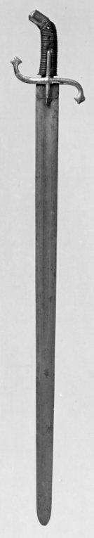 Sabelfäste upptill framåtböjt. Kappa av förgylld mässing med ovalt tvärsnitt och plan ovansida med graverad linjedekor. S-formiga parerstänger den främre böjd uppåt, den bakre nedåt av stål belagt med förgylld mässing med vidgade blomformade ändar, ovalt tvärsnitt och graverad linjedekor. Raka styrskenor i ett med parerstängerna. På krysset graverad stjärna. Kaveln klädd med brunt läder med tvärgående räfflor, märken efter tre nitar. Svärdsklinga av stål 48 mm bred, rak, tvåeggad med grund bred hålkäl på mitten. Rundad ände.