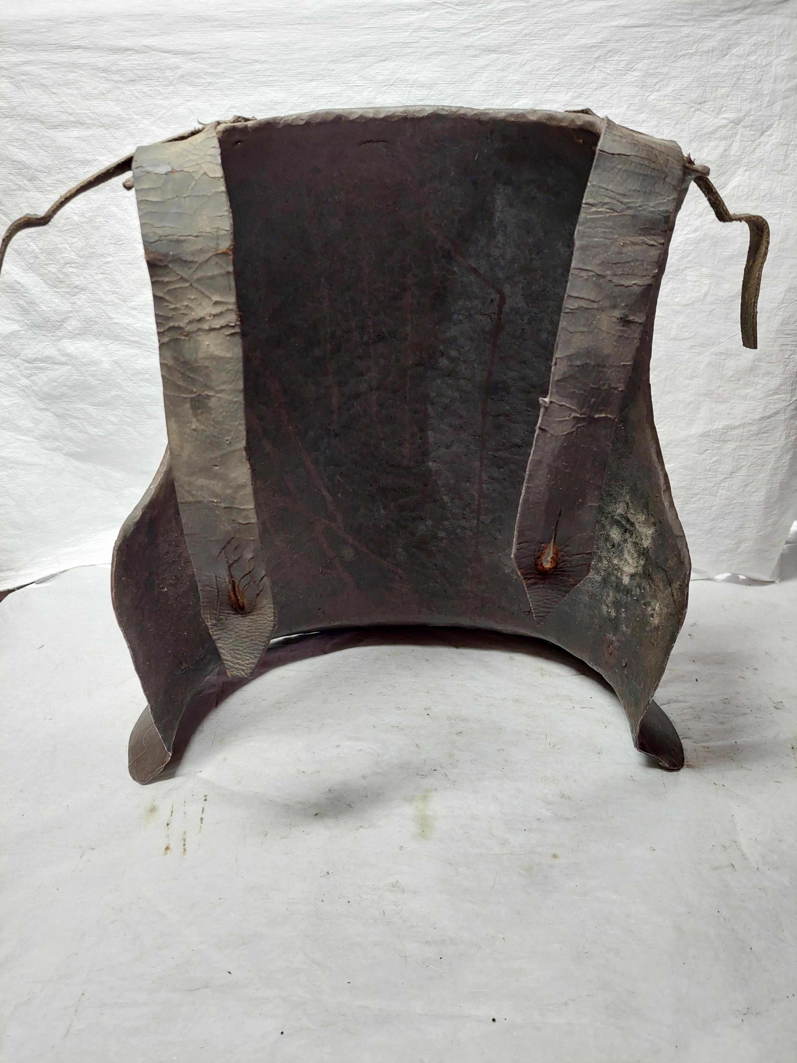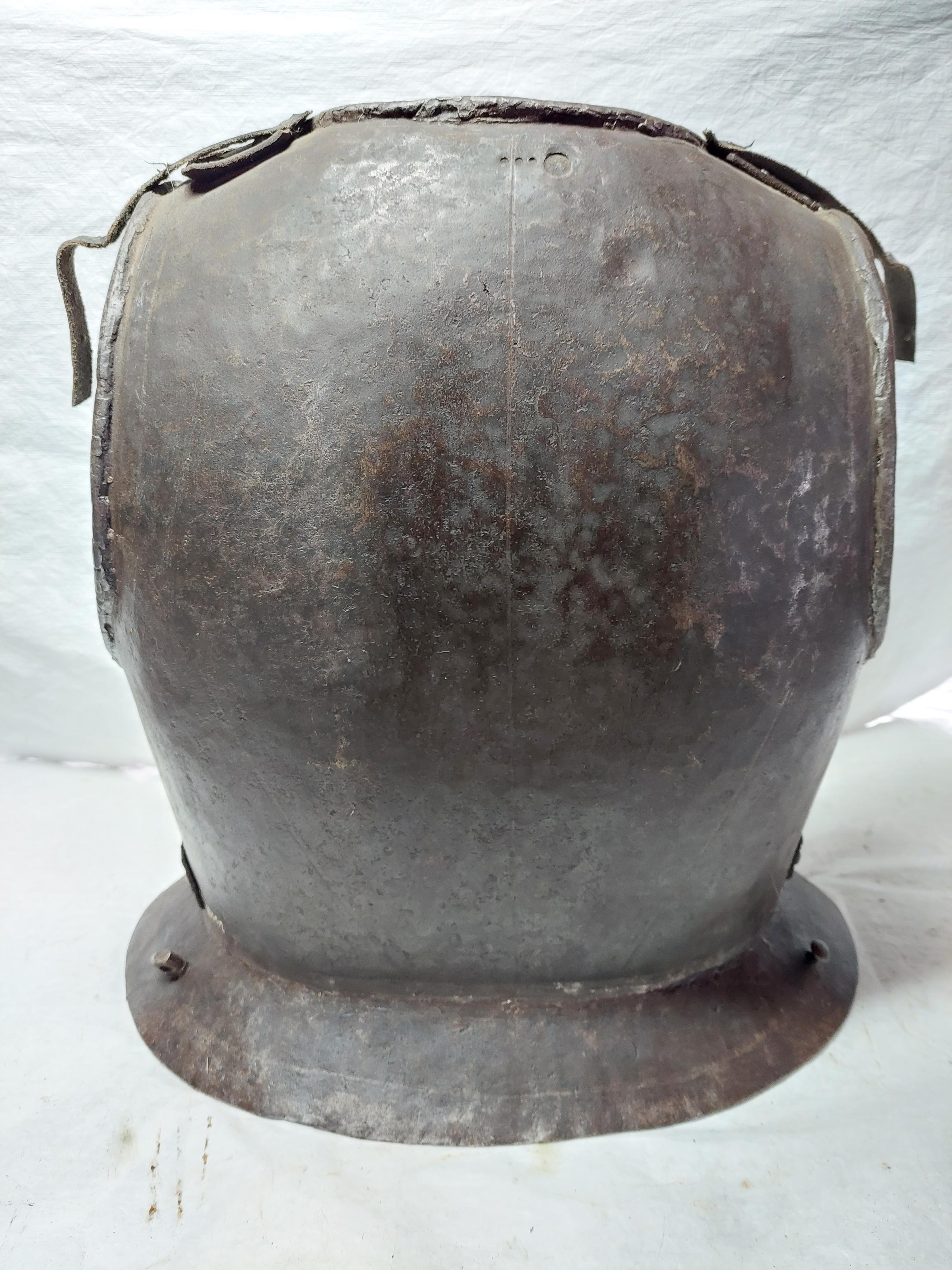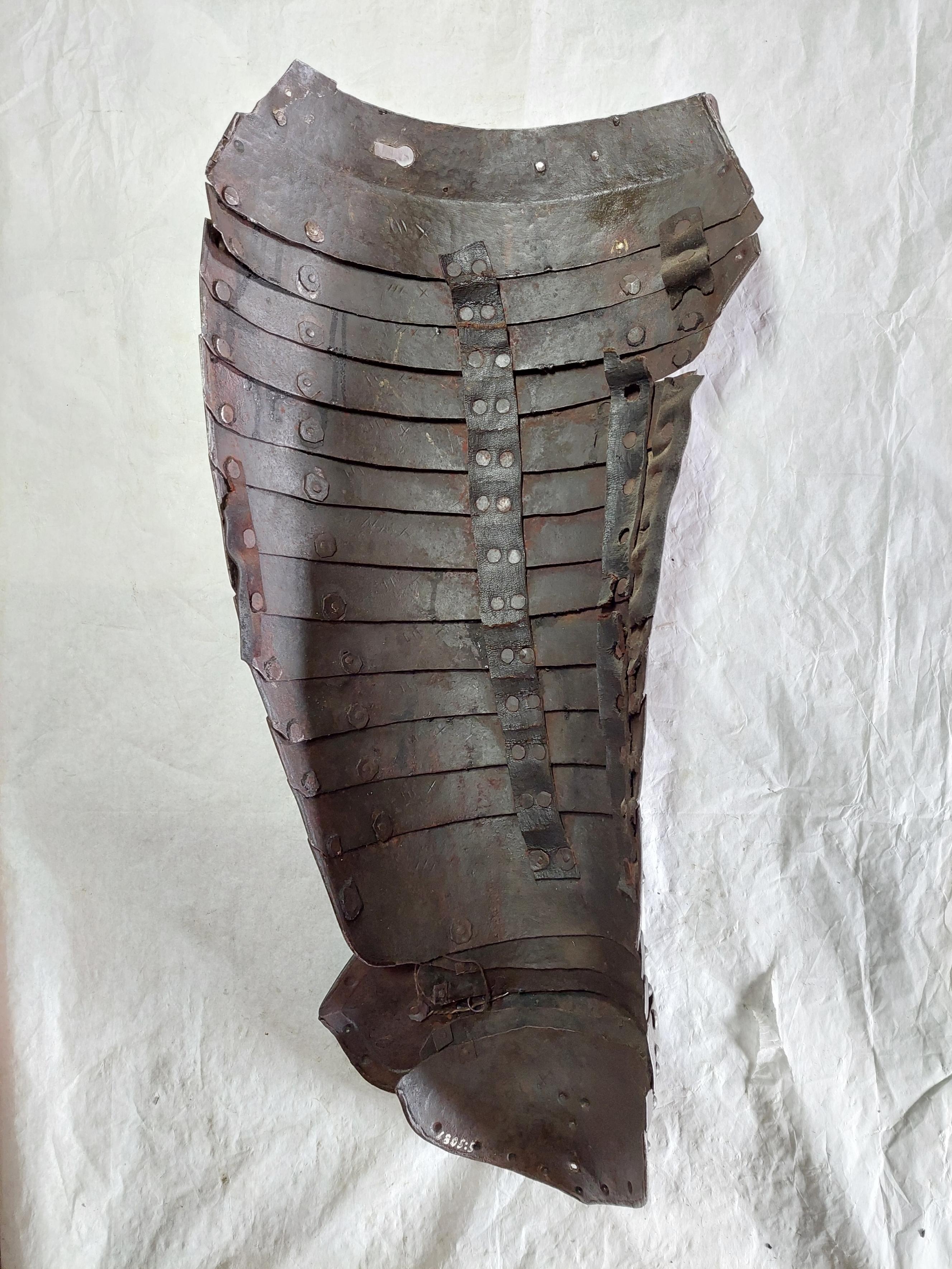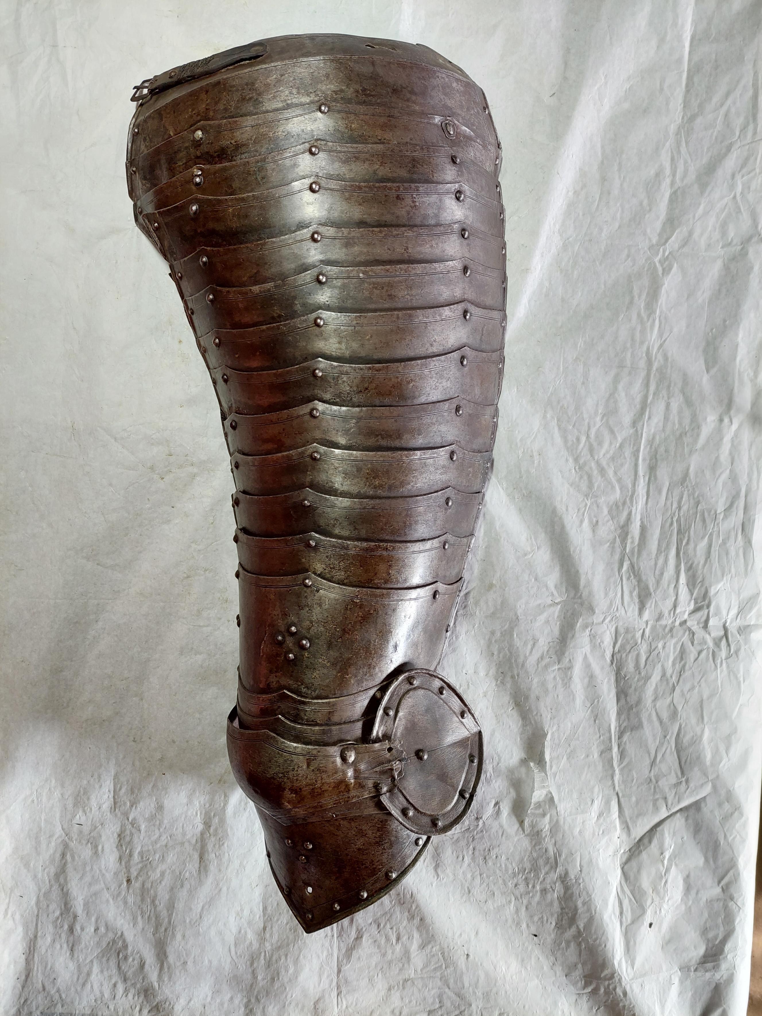 Sammansatt av ursprungligen ej samanhörande delar. Av blånerat stål med nitar av stål. Bestående av: (19760909) bröstharnesk 6805:1 ryggharnesk 6805:2 h. axelstycke m armbuckla 6805:3 v. axelstycke m armbuckla 6805:4 h. lårskydd med knäbuckla 6805:5 v. lårskydd med knäbuckla 6806 ländskört 6807 hjälm 6808 6805:1 Bröstharnesk. Låg, rundad halskant, lika kring armhål. Enkel graverad linje kring hals och armar. Markerad mittås, nertill något utvidgad. På bröstets vardera sida knopp - för fastspännande av ryggharneskets axelremmar. Två knoppar även i harneskets nederkant - för fästande av lårskydden. Nedre lamellen uppsvängd i snibb mitt fram. Märkt: M, mitt fram under halskanten. H. 360 mm, b. 520 mm. 6805:2 Ryggharnesk (samhörande?). Låg, rundad halskant. Enkel graverad linje markerar mittlinjen - från dennes bas snett över harneskets sidor utgående linjer. I vardera axeln fastnitad läderrem, framtill avslutad med ett knapphål. I vardera sidan (vid midjan) fragment av fastnitade läderremmar (avsedda att knäppas runt bröstharnesket). Nederkanten med knapp och ögla för fästande av ländskörtet. Märkt: 3 punsade punkter invid halskanten. H. 410 mm, ryggvidd 570 mm. 6805:3 Höger axelstycke med armbuckla och underarmskydd. Axelstycket består av fem lamel-ler, vars vågiga överkanter följs av dubbla graverade linjer. Överarmskydd av sex lameller. Armbucklan består av tre delar och underarmsskyddet av två skenor, förenade genom gång-järn. I axelstycket spänne för fästande av rem från ryggharneskets axelparti. L. 740 mm, diam. 4000 mm. 6805:4 Vänster axelstycke med armbuckla och underarmsskydd. Se beskrivning 6805:3 H. 750 mm, diam. 390 mm. 6805:5 Vänster lårskydd med knäbuckla. Bestående av tretton lameller. Knäbuckla av tre lameller samt en större avslutande del. Vid övre lamellen fastnitad läderrem med spänne. L. 760 mm, b. 390 mm.