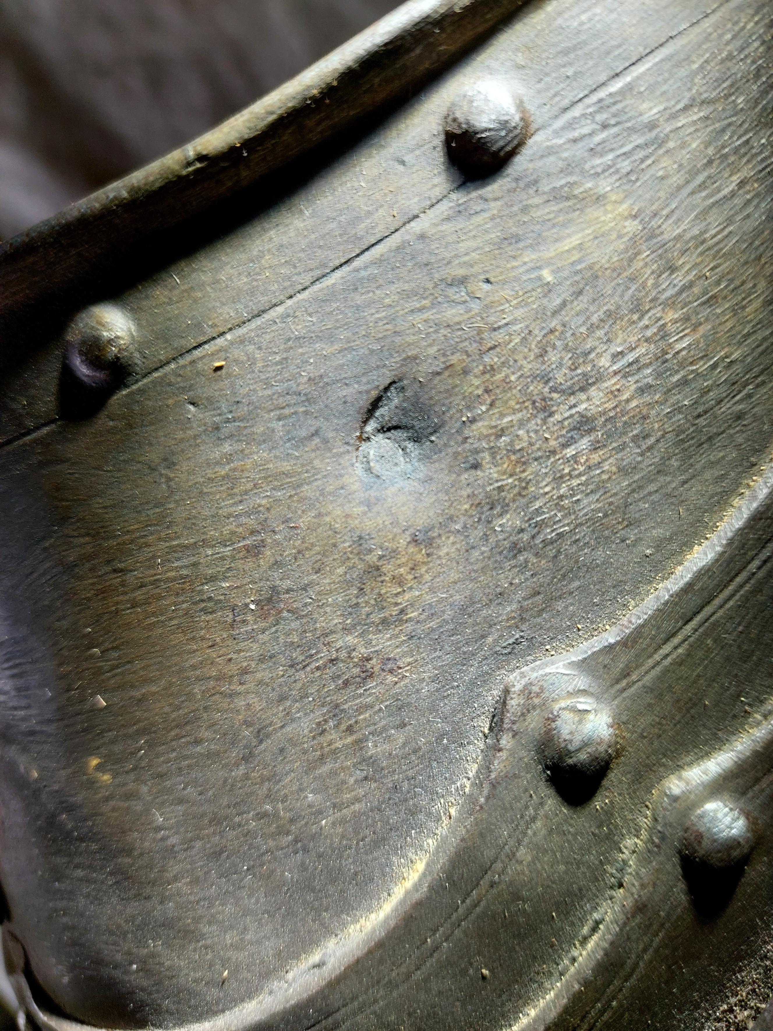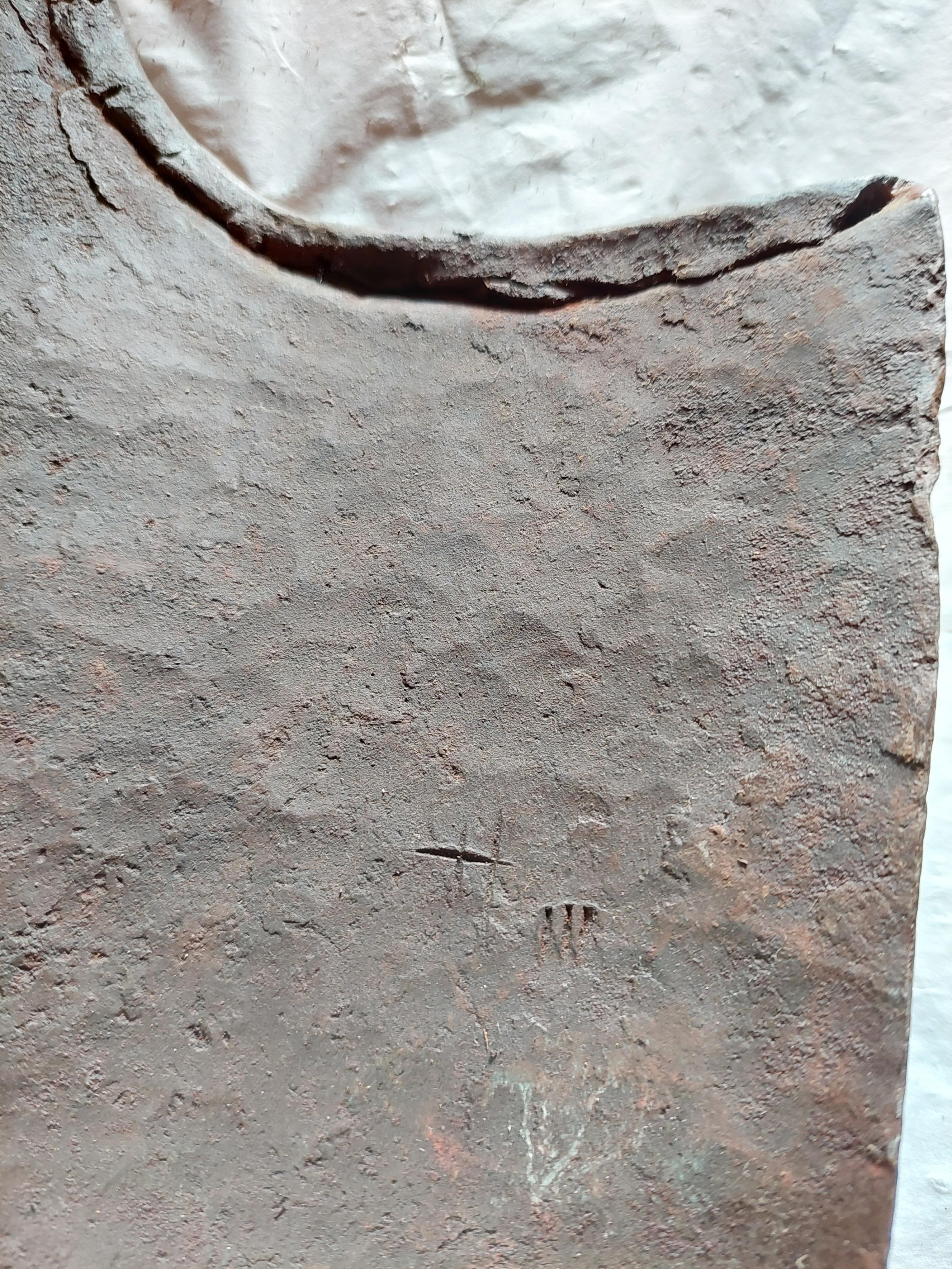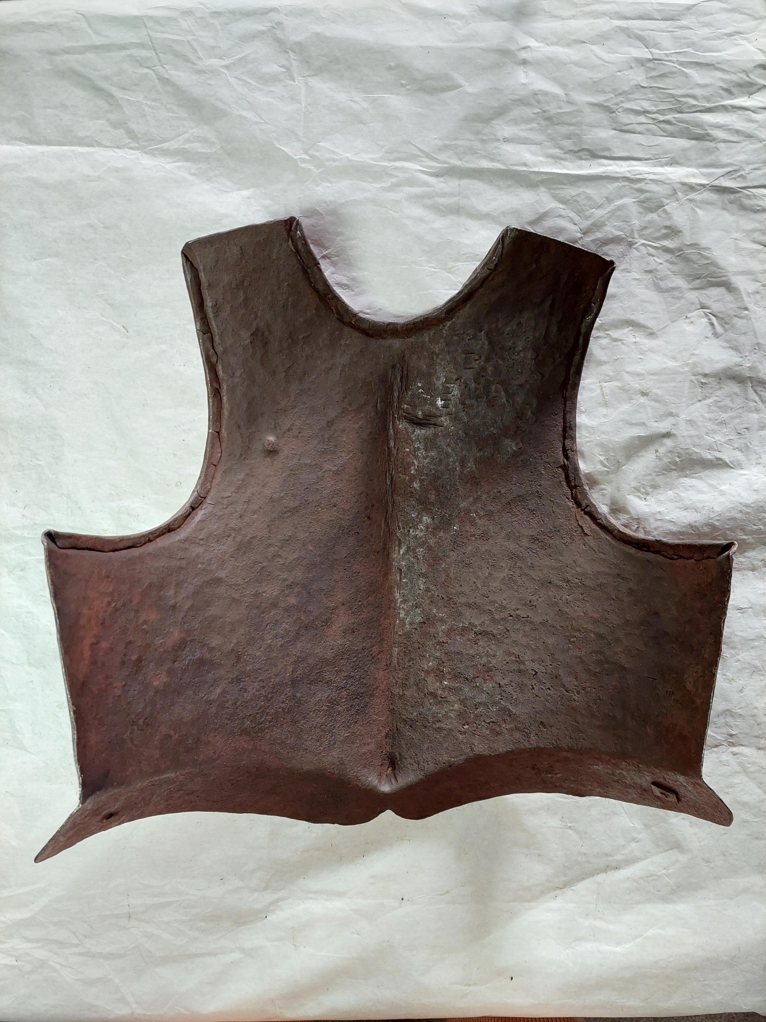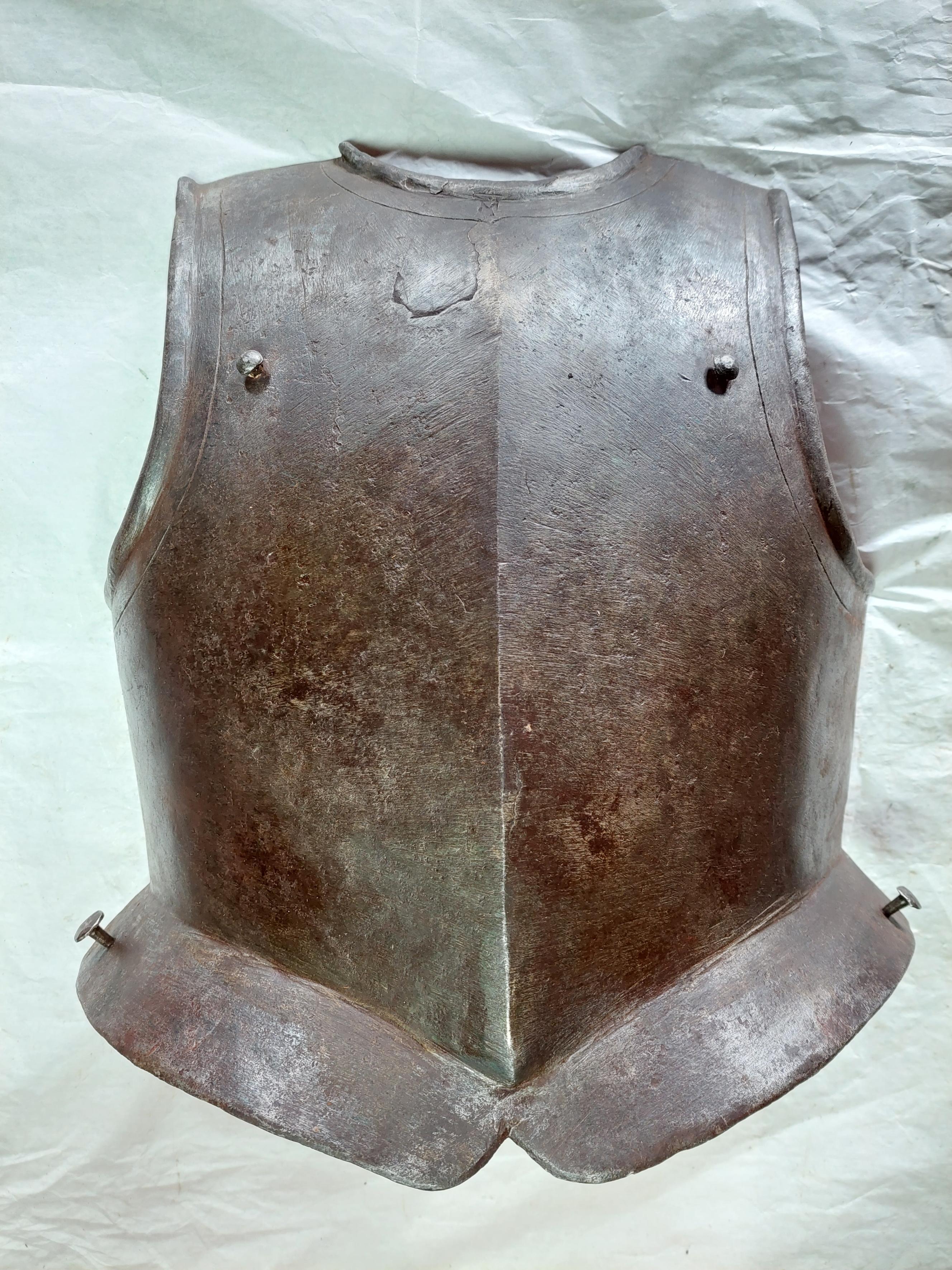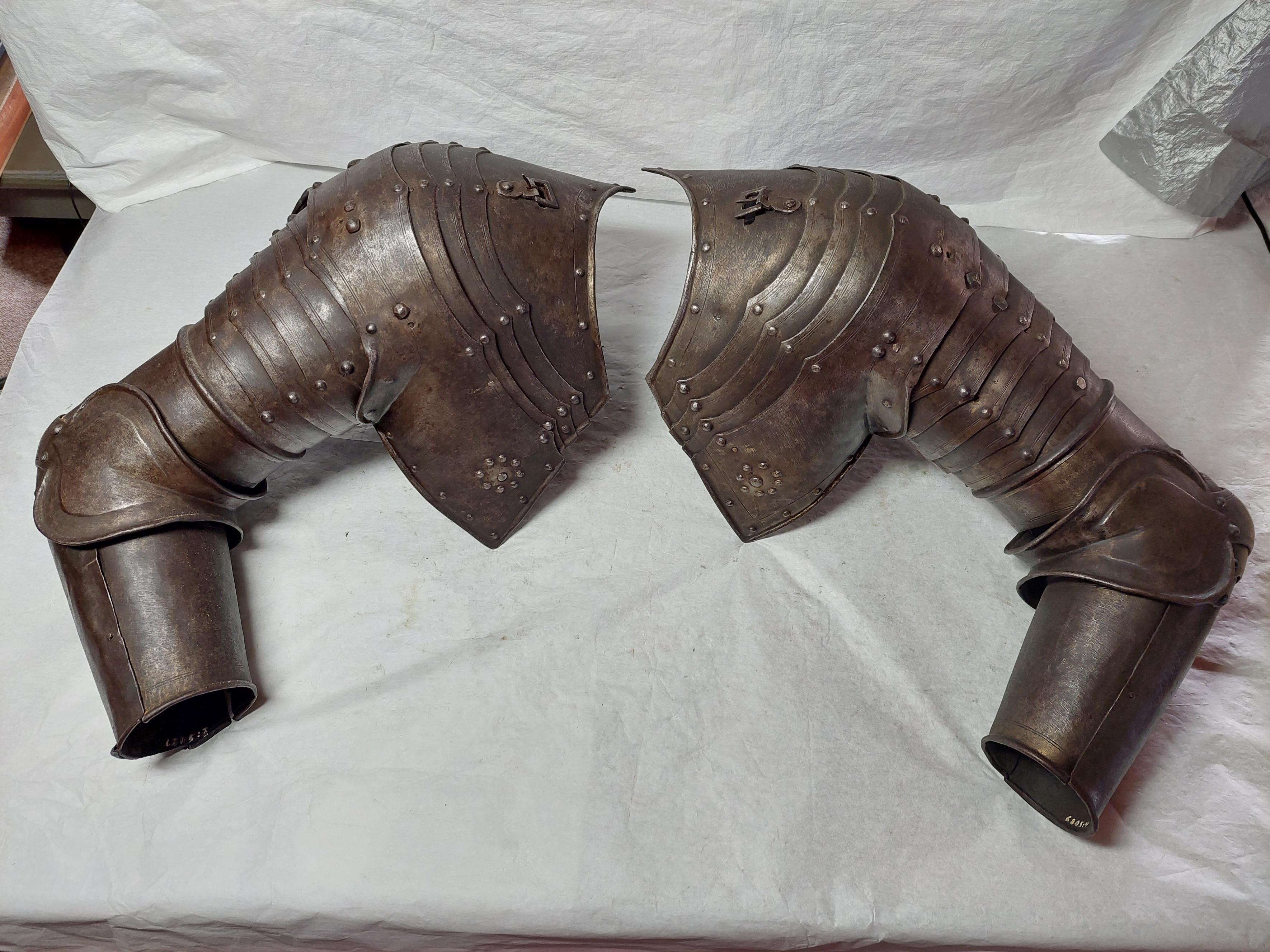 6805:1 Bröstharnesk ursprungligen ej samhörande med ryggharnesket. Möjligen brukat tillsammans med detta. Uppe vid halsöppningen,mitt fram, stämplat "M". På insidan mejslat "H III". Stor inklusion på höger sida, nedan halsen. 6805:2 Ryggharnesk ursprungligen ej samhörande med bröstharnesket. Möjligen brukat tillsammans med bröstet. I stort sett avsaknad av filning och tydliga hammarmärken över hela ytan. Skottprovad vid nacken, vid sidan om detta tre slagna punkter. 6805:3-4 Axelstycken. Försedda med vridled på överarmen. De flesta dekornitarna är falska och drivan med dorn direkt ur plåten. Tydliga slipmörken. Förhållandevis enkelt arbete med en del äldre läder i det högra axelstycket.Högerarmens nederkant deformerad. Inslagna "6" på översta plåtarna. 6805:5 Tassett för vänster ben. Liksom axelstyckena finns dubbla dekorlinjer längs lamellernas kanter. Längsk kanterna falska nitskallar slagna med dorn direktl i plåten. Musslan avbruten. Rester av svärtning. Samhör sannolikt ursprungligen med axelstyckena.