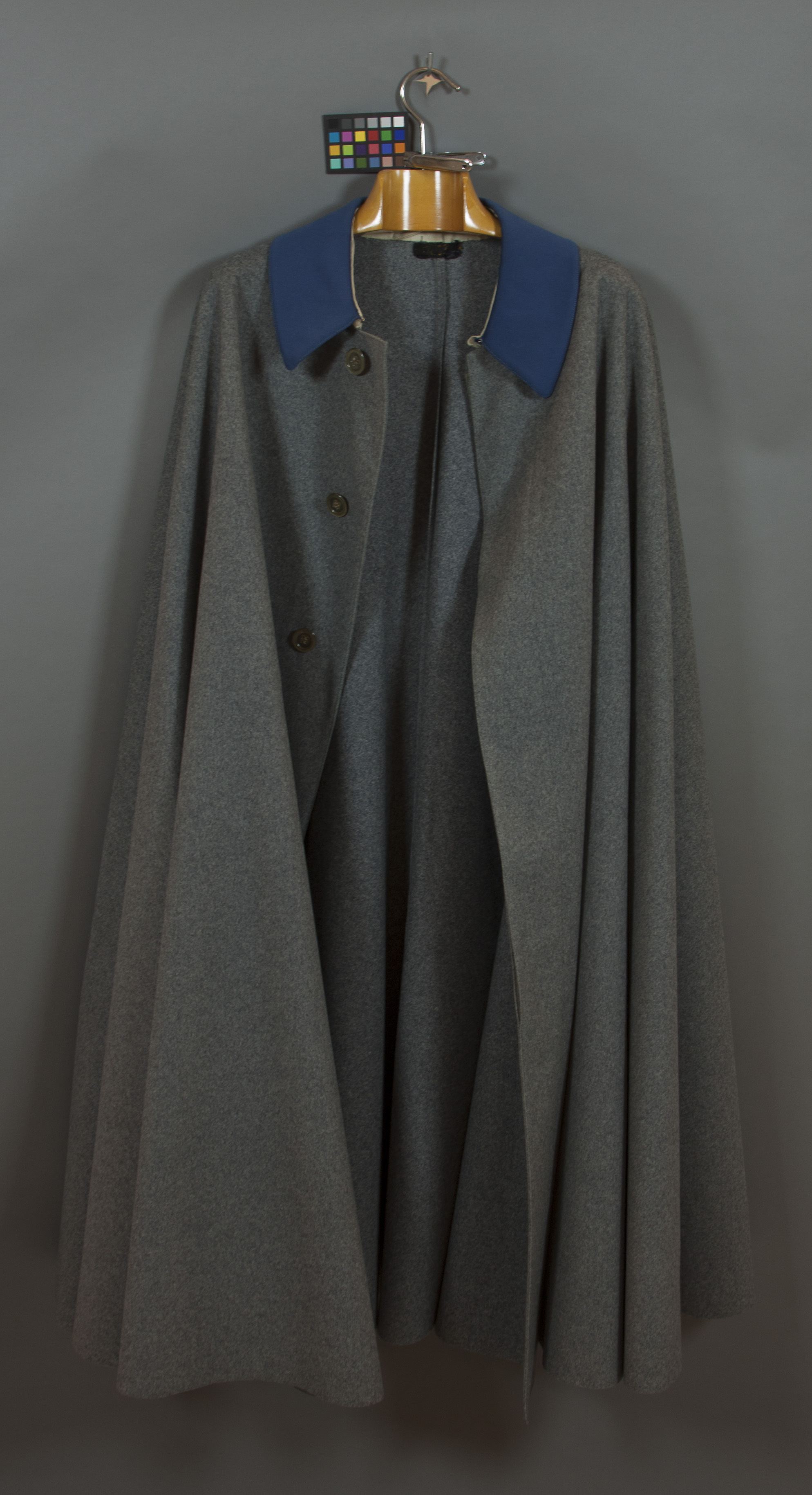 Kappa av grått kläde, rundskuren med en söm mitt bak. Fällkrage av blått kläde, fodrad med vitt kläde med täta parallella stickningar. Kragen skodd på insidan med vitt kläde samt med hängare av samma material. Dold knäppning fram med fem knappar av horn, botten av mörkt horn, överdel av ljust horn. Nedre knappen utbytt mot en, helt av hornimitation.