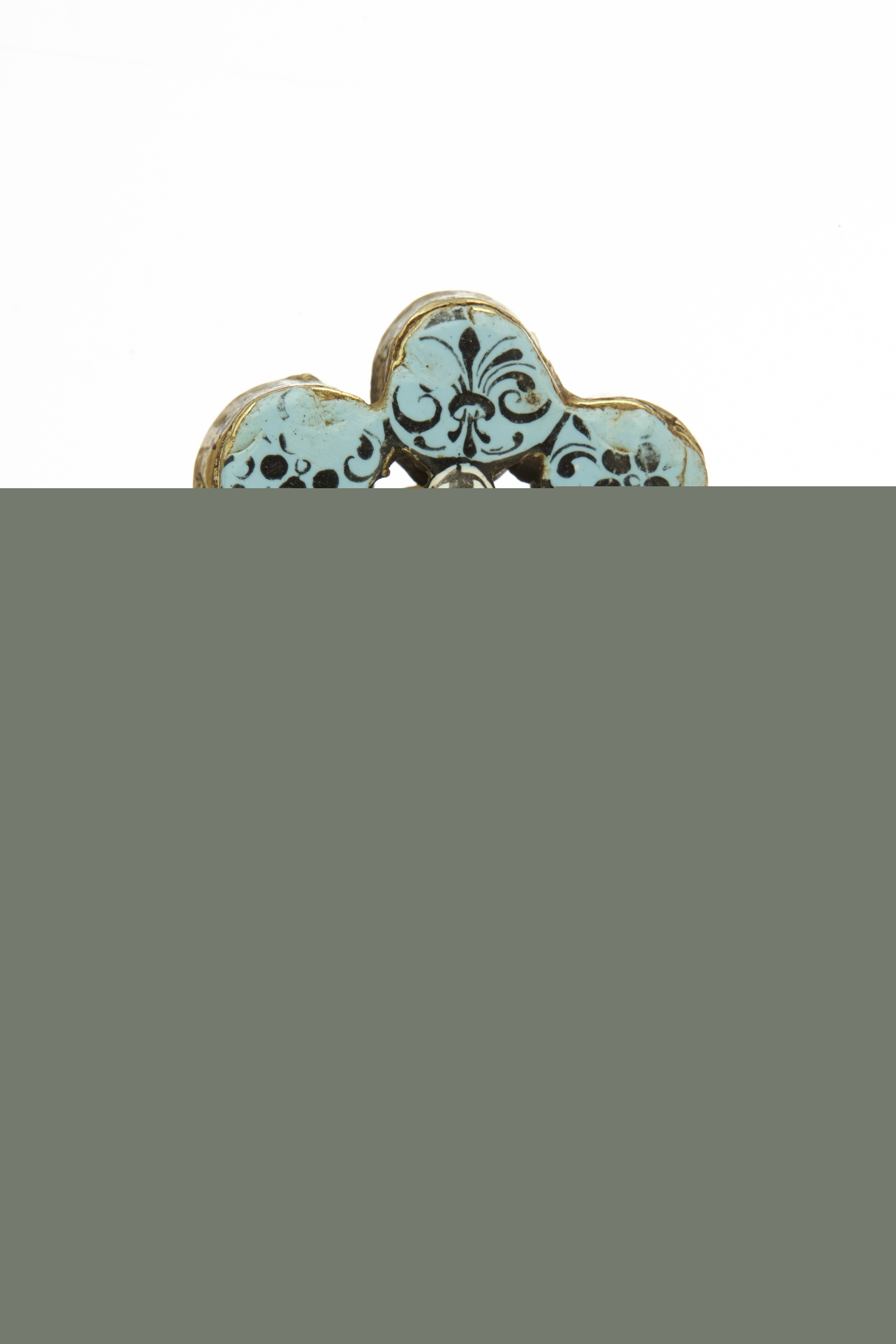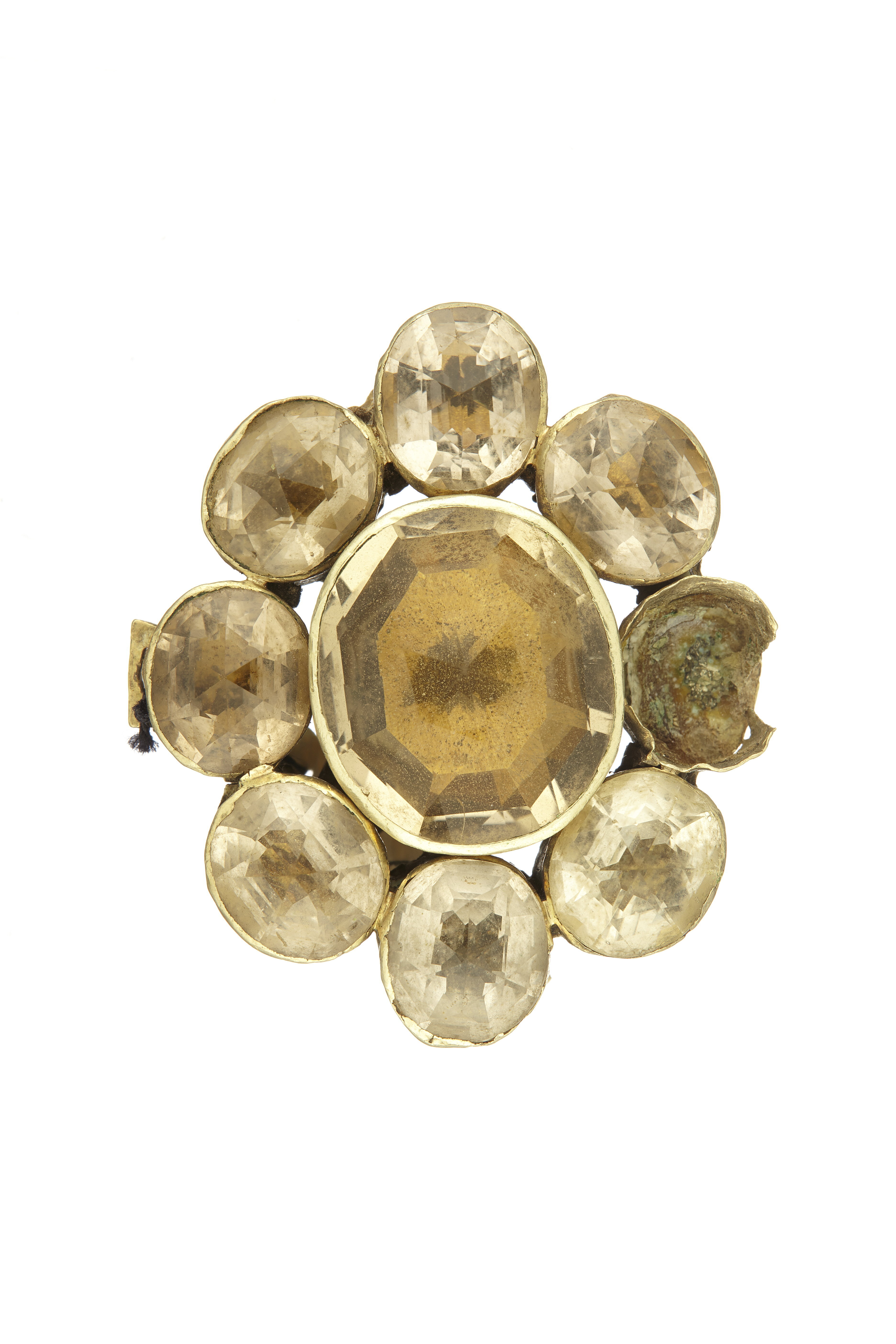 Blomformigt hängsmycke av guld och bergkristall, arbetat som övriga delar. Sammansatt av en större, oval sten i mitten, omgiven av ursprungligen åtta,nu sju ovala stenar. På mittstenens baksida en åttabladig, vitemaljerad blomma, på övriga stenar ovala plattor, täckta med turkosblå emalj. Vid ena kanten en fyrkantig bygel.