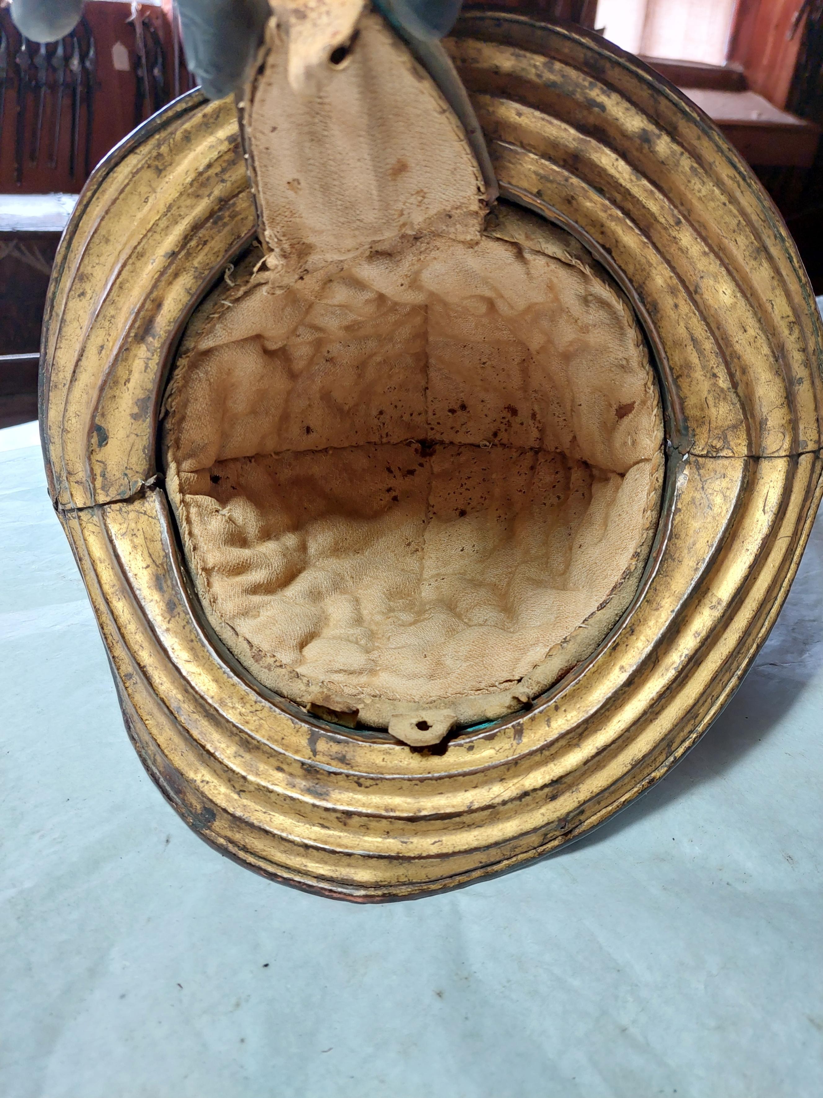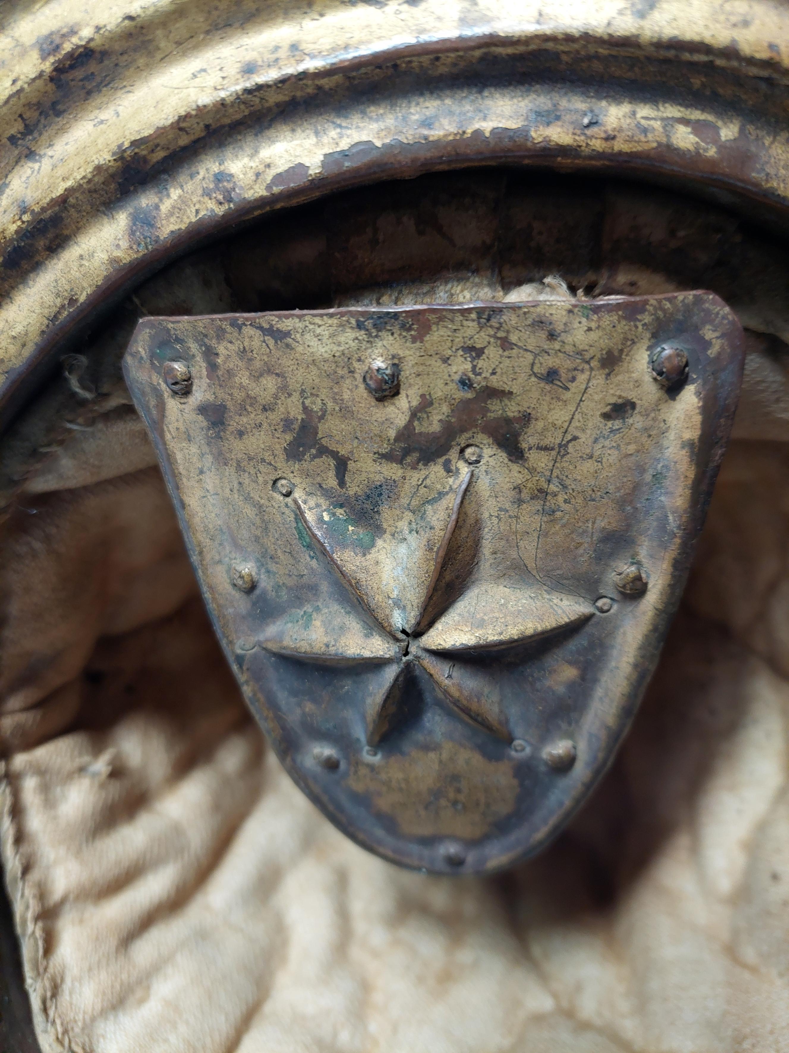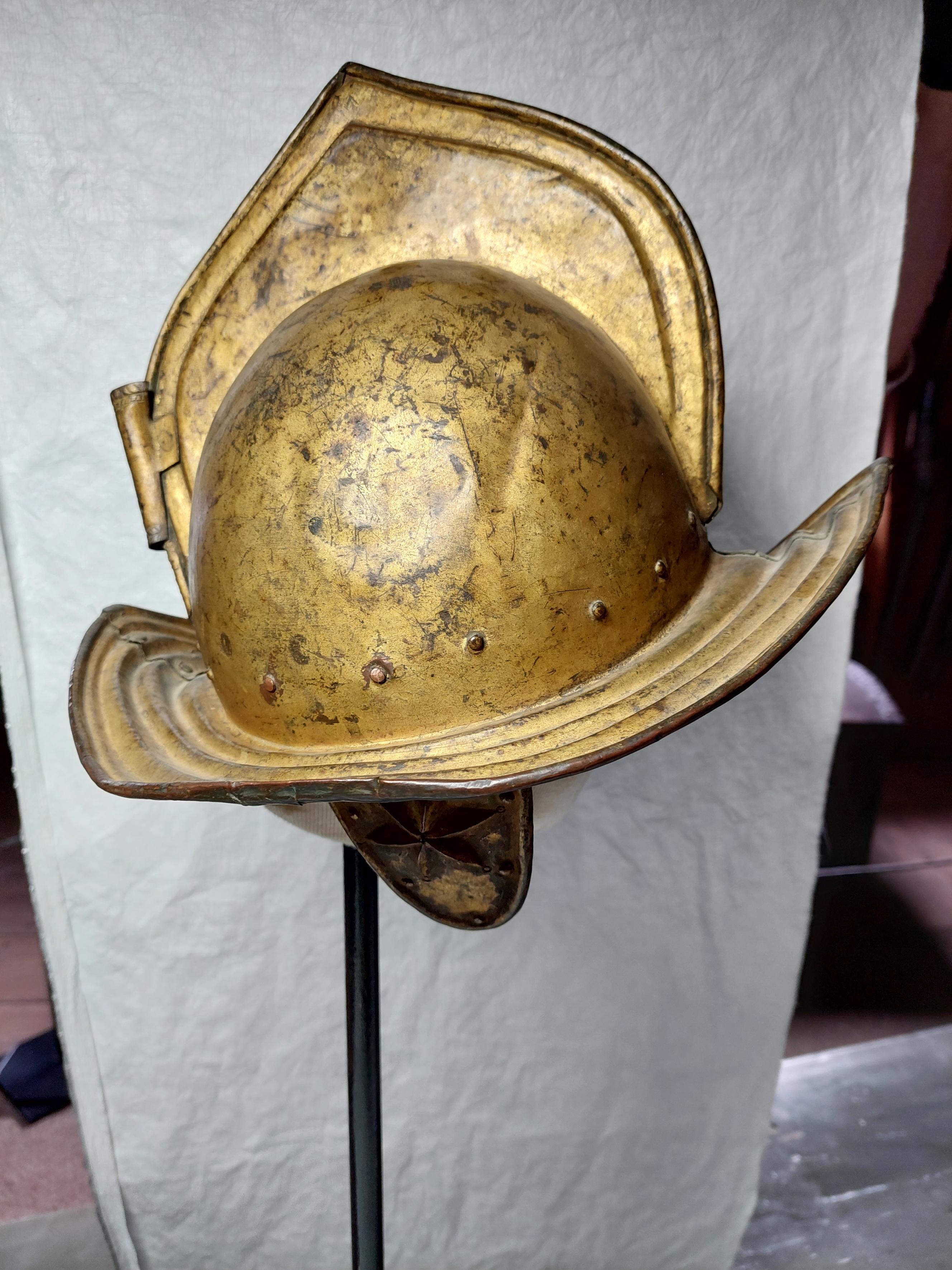 Hjälm av typen morion, möjligen använd vid karusellspel. Hjälmen är av förgylld koppar, målad med guldfärg. Den har en lökformig kam med uppsvängda, räfflade bretten samt en plymhållare. Det finns även ett kindskydd med uppdriven stjärna. Fodret är troligen i gåsögonsdräll stoppat med bomull.