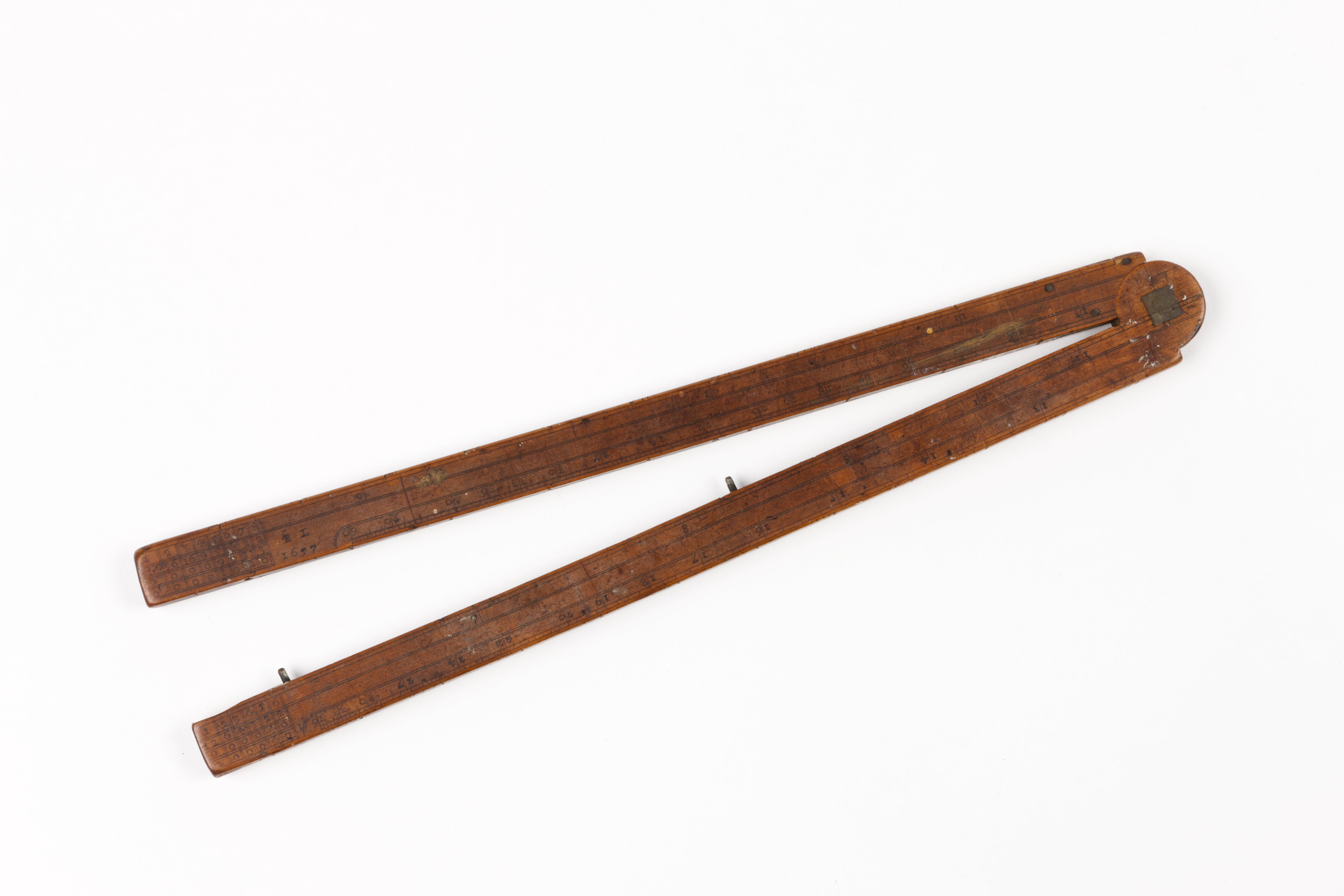 Måttstock av buxbom. Ledad på mitten och hopfällbar, med matematisk skala. Sekundärt ändrad till tumstock. Stämplad: "E.L. 1657".