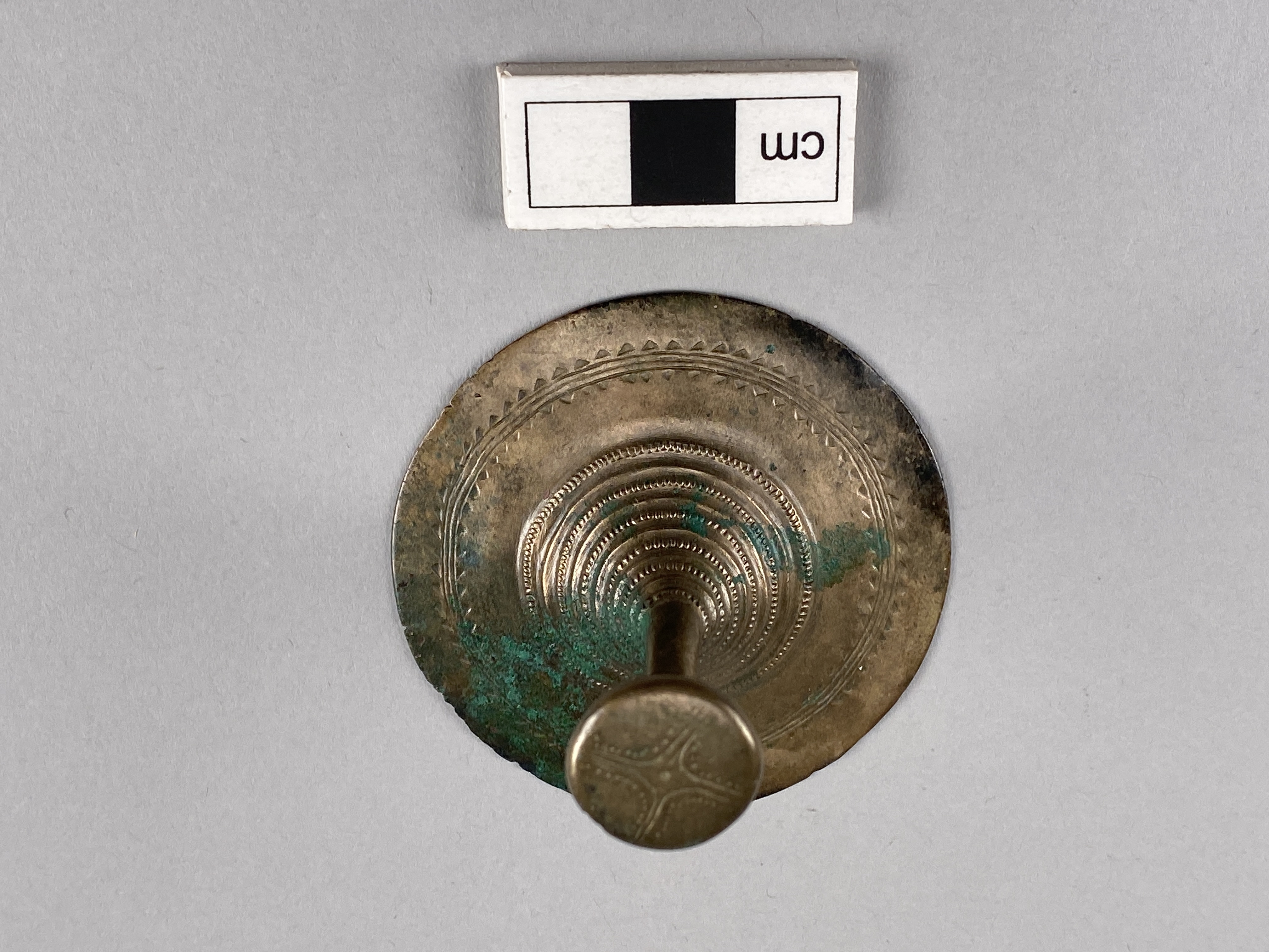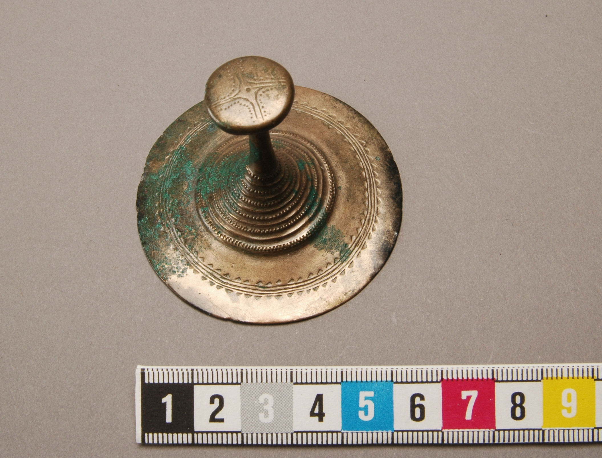 Tutulus av brons. På den flata delen är den prydd med en grupp av tre fina linjer, parallella med kanten. Ornerad med inslagna fyllda trianglar. Knoppen på toppen är flat och 1.65 cm vid, ornerad.