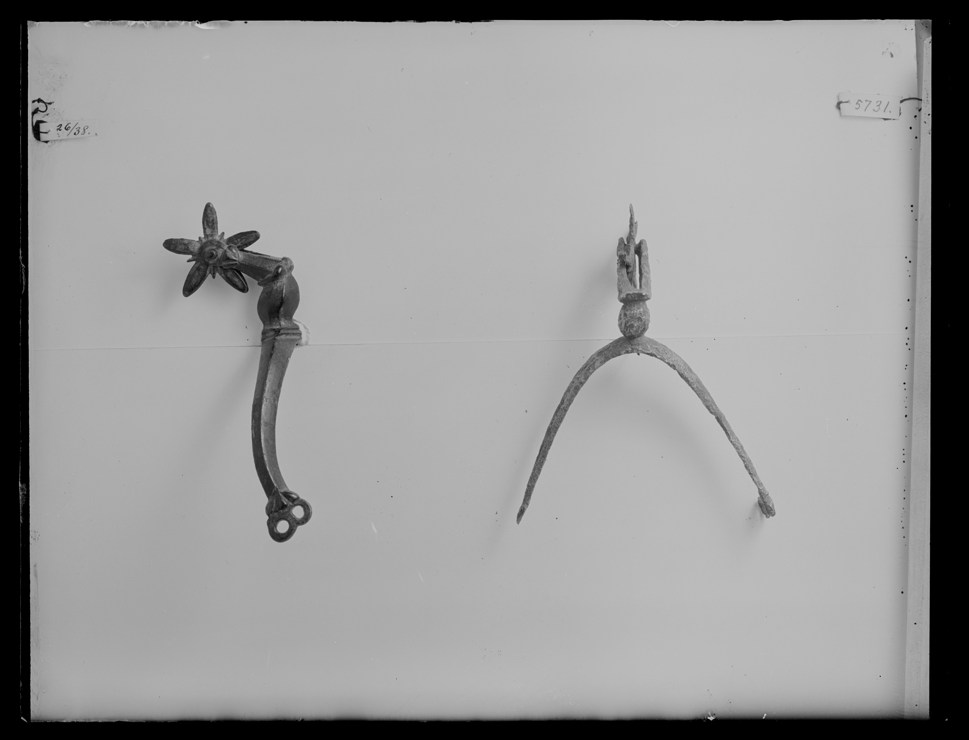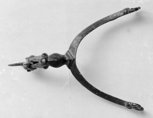 Sporre av brons. Öppet u-formade skänklar med åsad utsida, plan insida, något svängda med utvidgade ändar, i ändarna tredelat reliefornament och två hål. Vinkelformig 45 mm lång hals, vid skänklarna räfflor. Den delen som är närmast skänklarna fasad äggformad, mitt på tredelat utskott, yttre delen fasad. Femuddig, blomformad klinga med femuddig mittrosett.