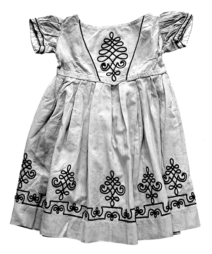 KLÄNNING Av beigefärgat finrandigt bomullstyg, s. k. piké, med broderi av svarta ylleganser. Handsydd. Liv och kjol sammanhängande. Livet bestående av ett framstycke och två ryggstycken med svagt sneddade sid- och axelsömmar. Halsurringning rundad samt med en svart kupig porslinsknapp, isydd med vit bomullstråd. Kjolen bestående av två raka våder, hopsydda med förstygnssöm av vit bomullstråd. Kjolen upptill med tolv längdgående motveck Mått: Längd: 54 cm.; vidd nedtill: 154 cm. Buren av Ebba eller Ellen von Hallwyl åren 1869 och 1870.