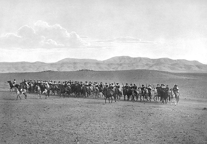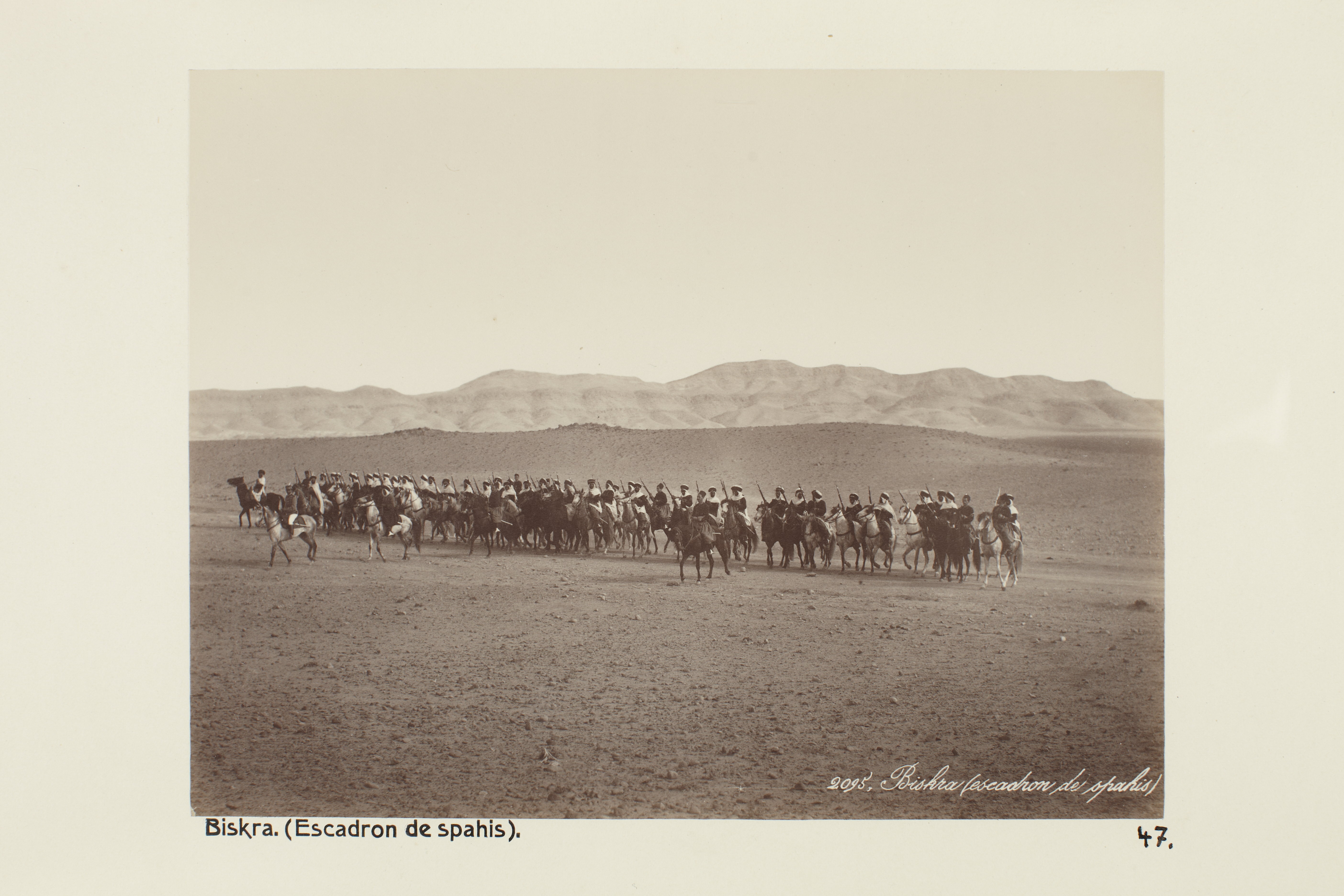 BISKRA, Algeriet. Spahis-skvadron. Foto från resa genom Algeriet och Tunisien samt åter över Schweiz, 11 februari - 19 maj 1889. Samtliga foton i gruppen LXVI:F. är inköpta av Wilhelmina von Hallwyl i Alger, Biskra, Tunis, Constantine, Oran och Blidah vid hennes vistelse i nämnda städer tillsammans med sin make, Walther von Hallwyl, sin mor, Johanna Kempe, f. Wallis, dottern Irma samt fröknarna Caroline Pflaum och Ida Uhse. Uppgifterna kommer från fröken Ida Uhses reseanteckningar.