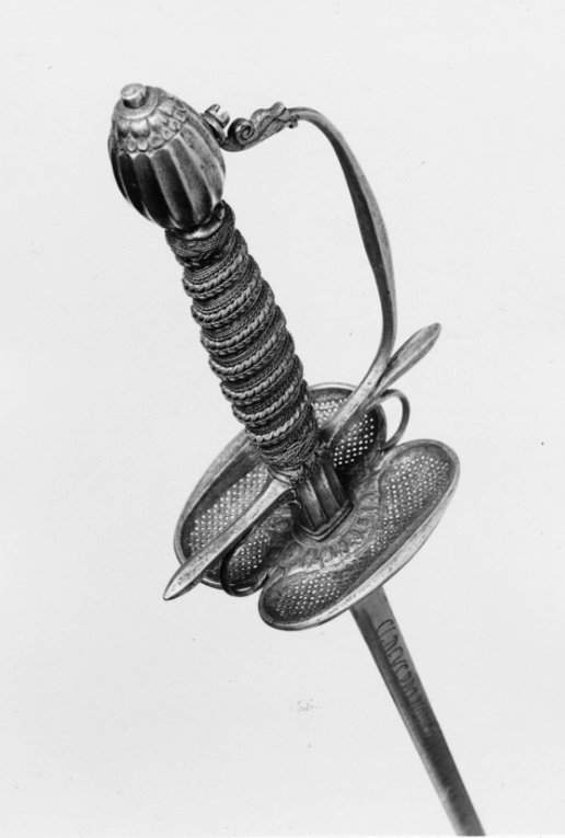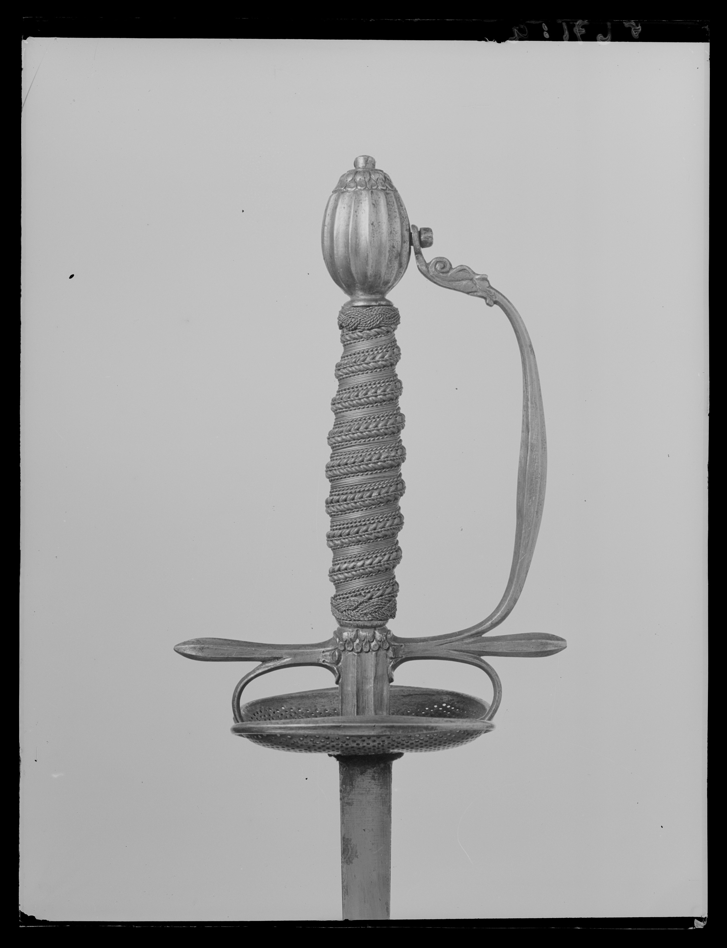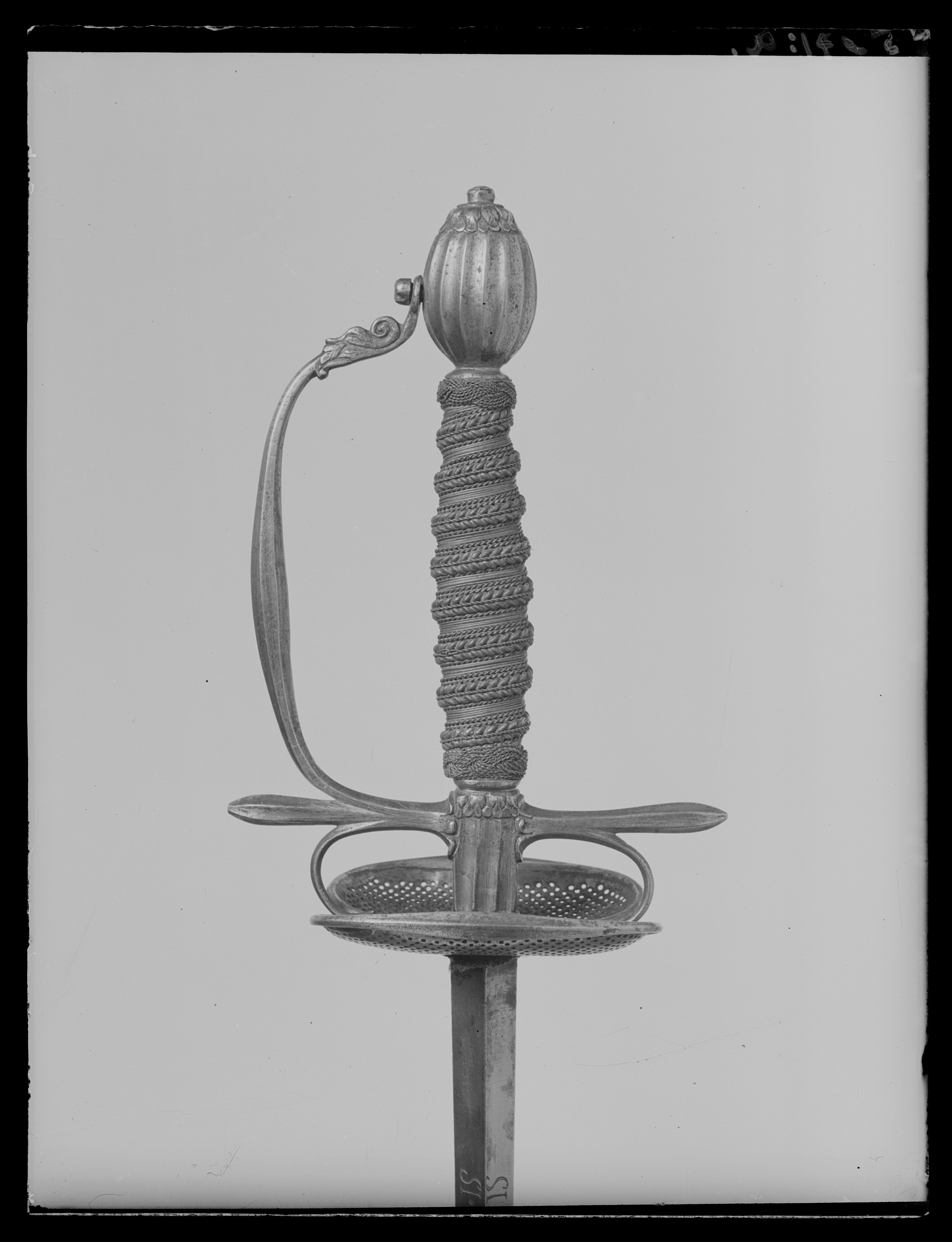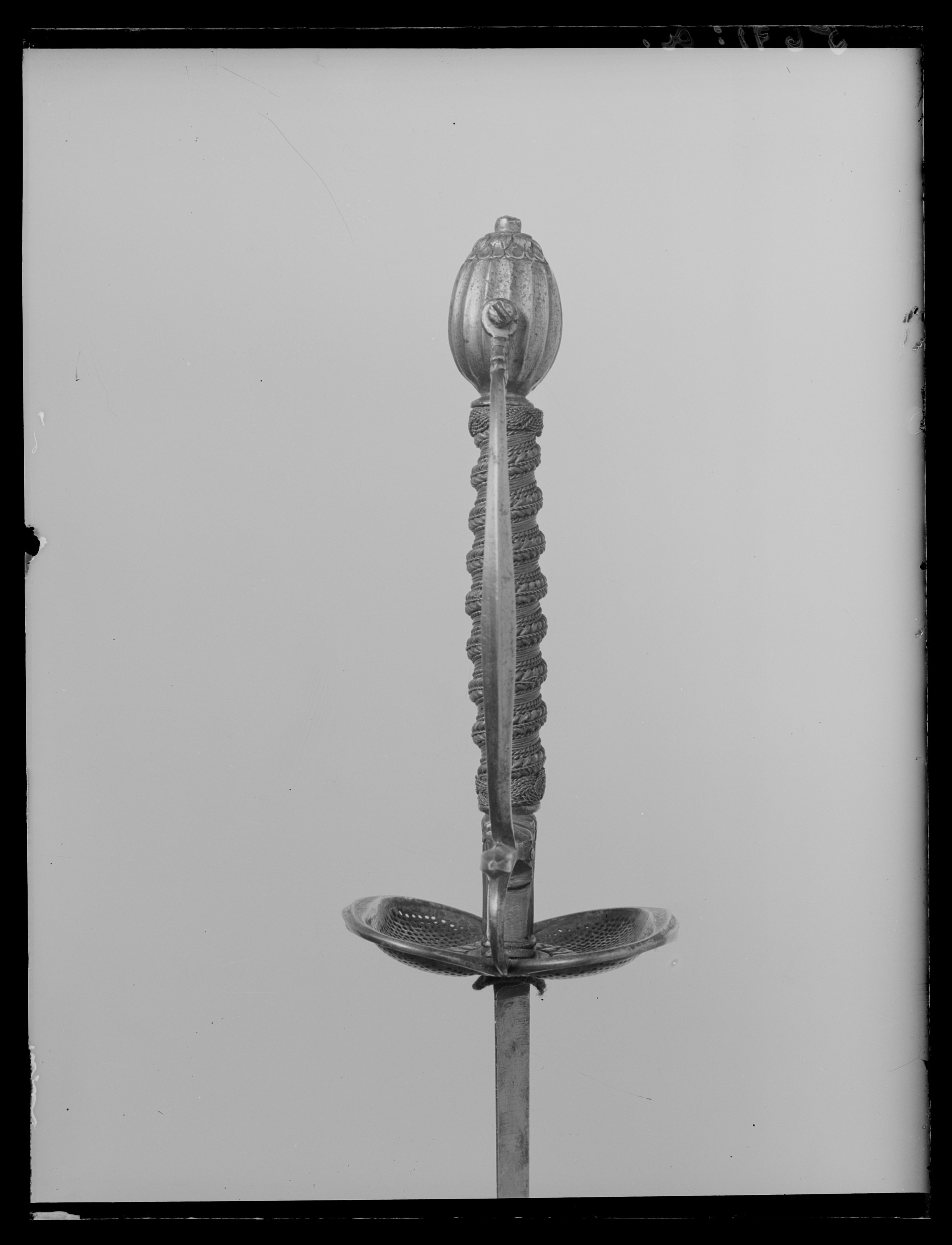 Fäste av delvis reliefsnidat stål, tämligen högt. Knapp utdraget oval form, vertikalräfflad, runtöverdelen bladkrans, nitknappen slät. Handbygel sexsidig (sidorna konkava) med vidgat mittparti, överdelen med volutformig bladranka och fäst vid knappens mitt medelst en genom en uppåtvikt fot dragen skruv med högt huvud. Främre och bakre parerstång, raka yttre delar vidgade och sexsidiga (sidorna konkava). Bågformiga fingerbyglar. Kryss tämligen högt, på ut- och insidan tre vertikala räfflor. Parerplåtar njurformiga med genombrutet ytmönster av små, runda hål och omgivna av kantbyglar med vidgat, sexsidigt mittparti. Kavellindning av barocktyp med reliefverkan genom åtta varv av höga parter med två tjocka, tvinnade silvertrådar, varemellan en tunn, tvinnad koppartråd. Mellan de höga parterna låga dylika av tunna, släta koppartrådar. Upptill och nertill en flätad krans av tvinnad, tunn koppartråd. Samtliga koppartrådar med svaga spår av förgyllning. Klinga rak, lång, slipad med tre eggar, s.k. stukatklinga. I vardera av de tre konkava sidorna etsadinskription: "SI DEVS PRO NOBIS QVIS CONTRA NNOS" (Om Gud är med oss, vem är mot oss - NOS på alla sidor stavat NNOS). Därframför på vardera sidan en grovt tecknad arm utstickande ur moln, beväpnad med sabel-huggarliknande blankvapen.