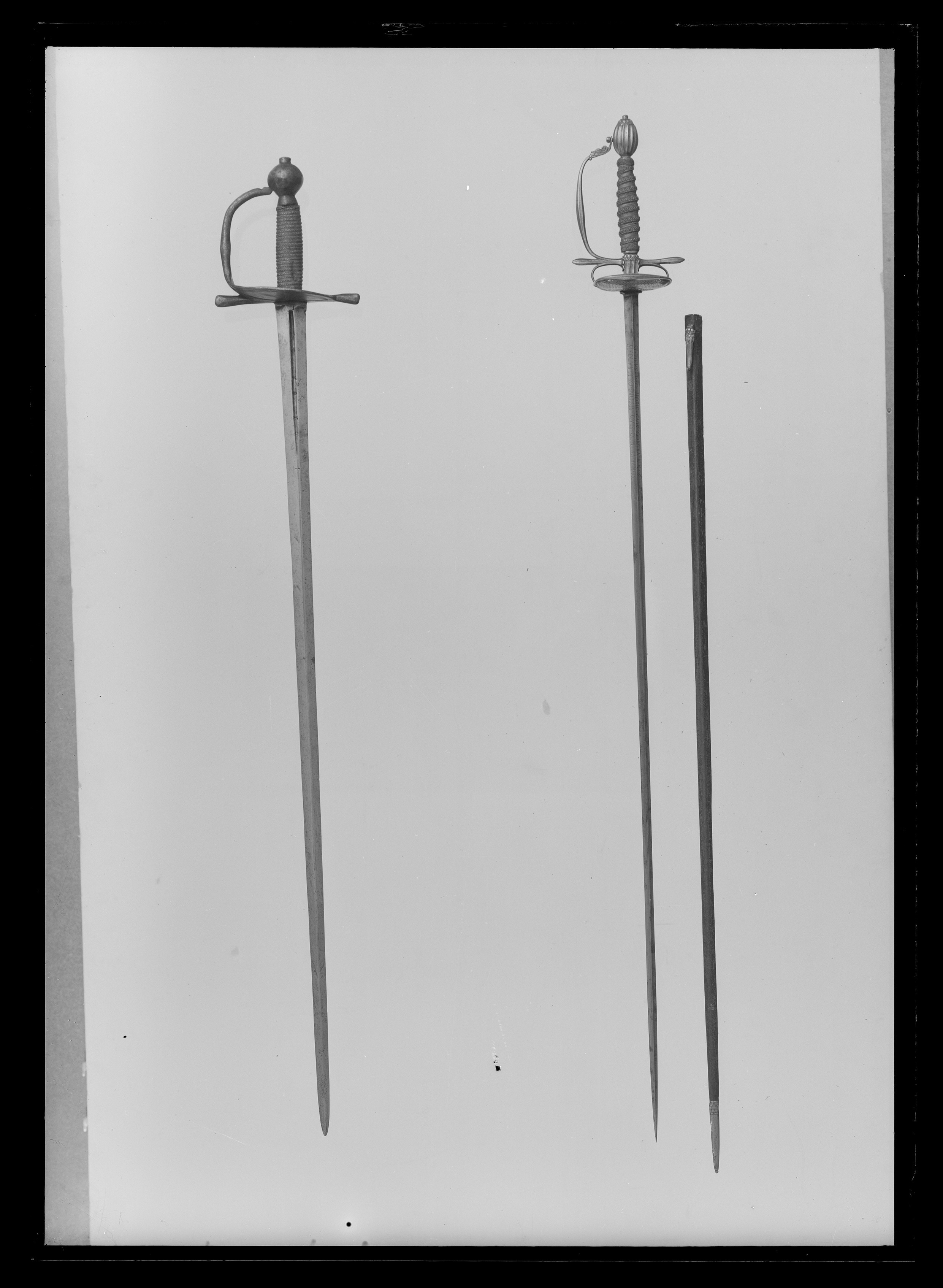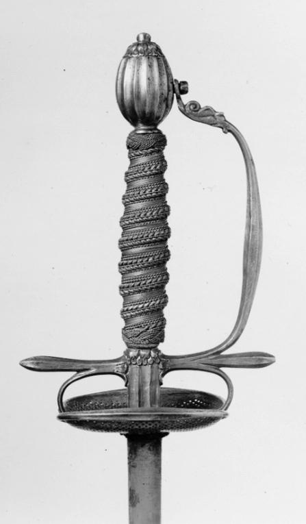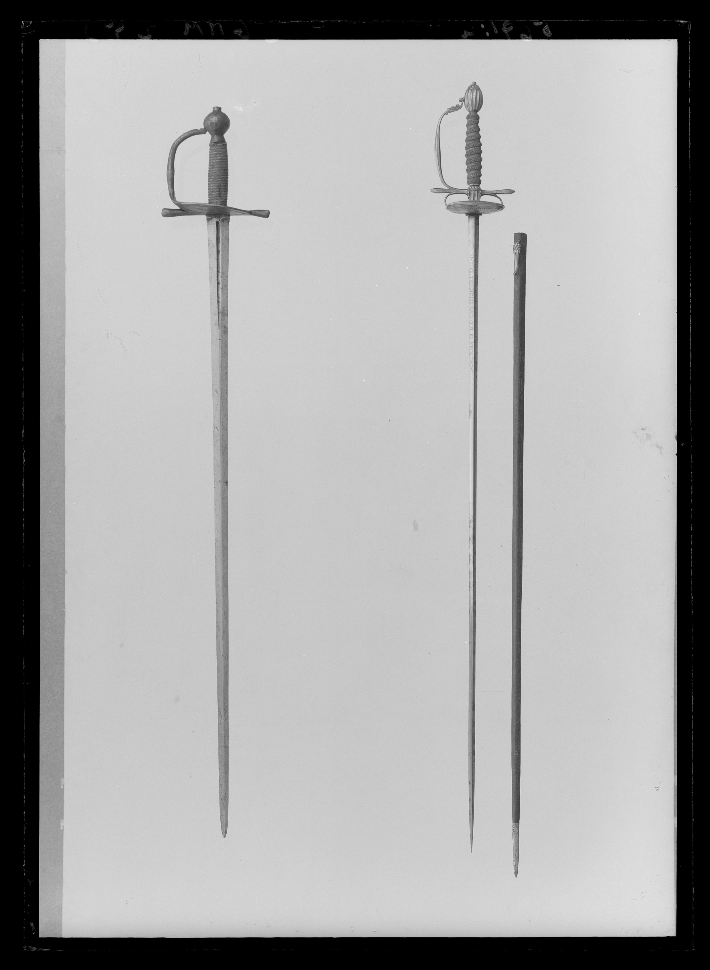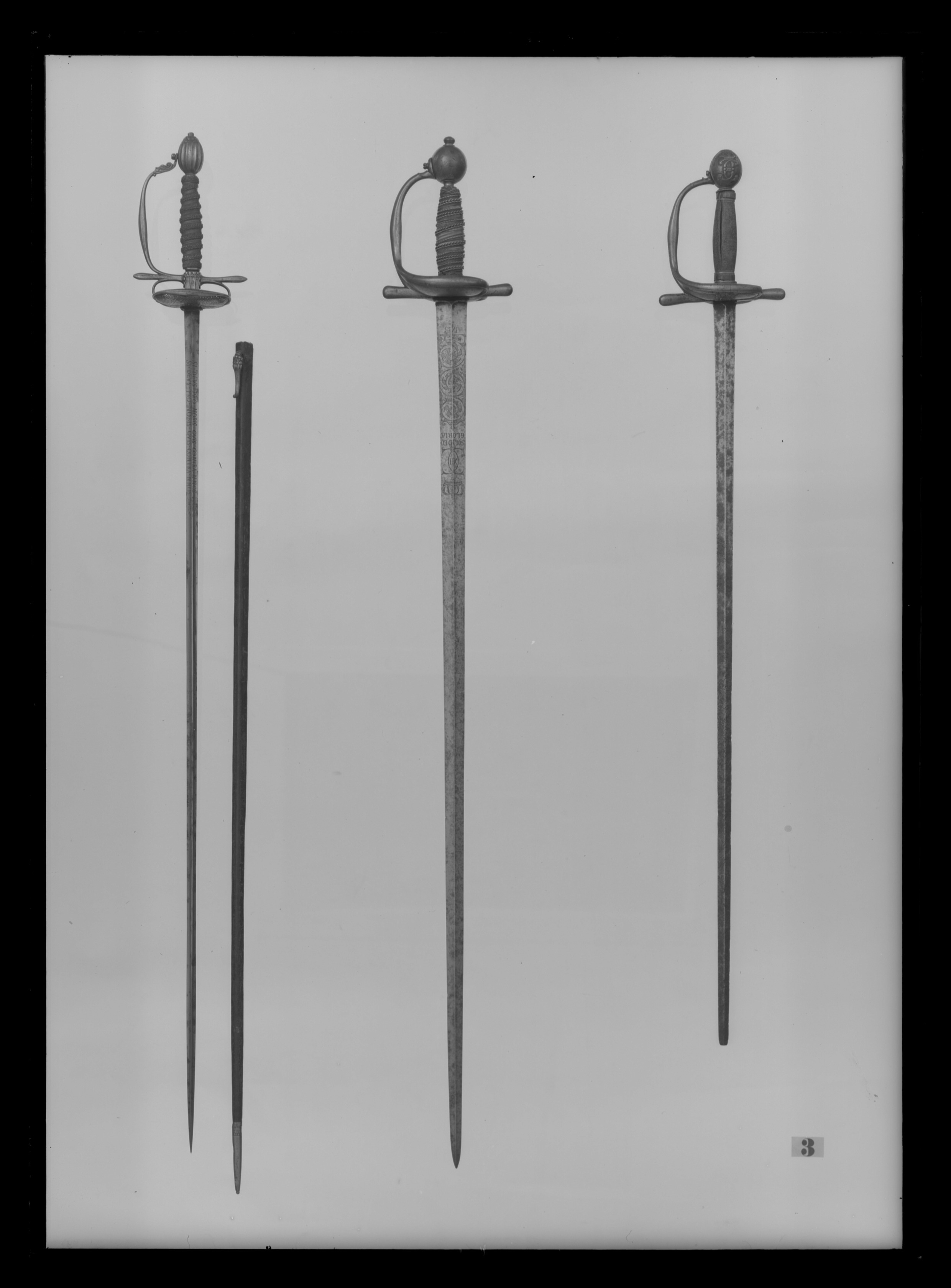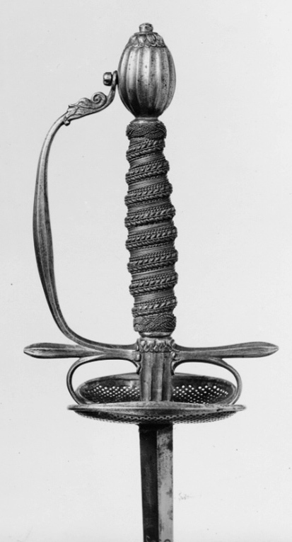 Fäste av delvis reliefsnidat stål, tämligen högt. Knapp utdraget oval form, vertikalräfflad, runtöverdelen bladkrans, nitknappen slät. Handbygel sexsidig (sidorna konkava) med vidgat mittparti, överdelen med volutformig bladranka och fäst vid knappens mitt medelst en genom en uppåtvikt fot dragen skruv med högt huvud. Främre och bakre parerstång, raka yttre delar vidgade och sexsidiga (sidorna konkava). Bågformiga fingerbyglar. Kryss tämligen högt, på ut- och insidan tre vertikala räfflor. Parerplåtar njurformiga med genombrutet ytmönster av små, runda hål och omgivna av kantbyglar med vidgat, sexsidigt mittparti. Kavellindning av barocktyp med reliefverkan genom åtta varv av höga parter med två tjocka, tvinnade silvertrådar, varemellan en tunn, tvinnad koppartråd. Mellan de höga parterna låga dylika av tunna, släta koppartrådar. Upptill och nertill en flätad krans av tvinnad, tunn koppartråd. Samtliga koppartrådar med svaga spår av förgyllning. Klinga rak, lång, slipad med tre eggar, s.k. stukatklinga. I vardera av de tre konkava sidorna etsadinskription: "SI DEVS PRO NOBIS QVIS CONTRA NNOS" (Om Gud är med oss, vem är mot oss - NOS på alla sidor stavat NNOS). Därframför på vardera sidan en grovt tecknad arm utstickande ur moln, beväpnad med sabel-huggarliknande blankvapen.