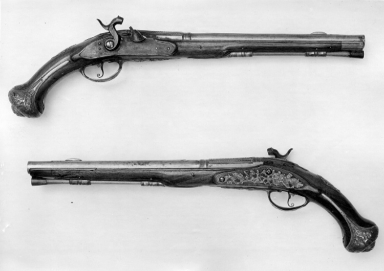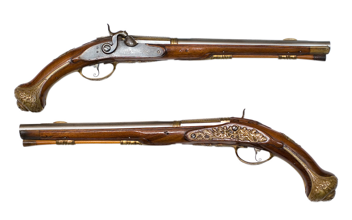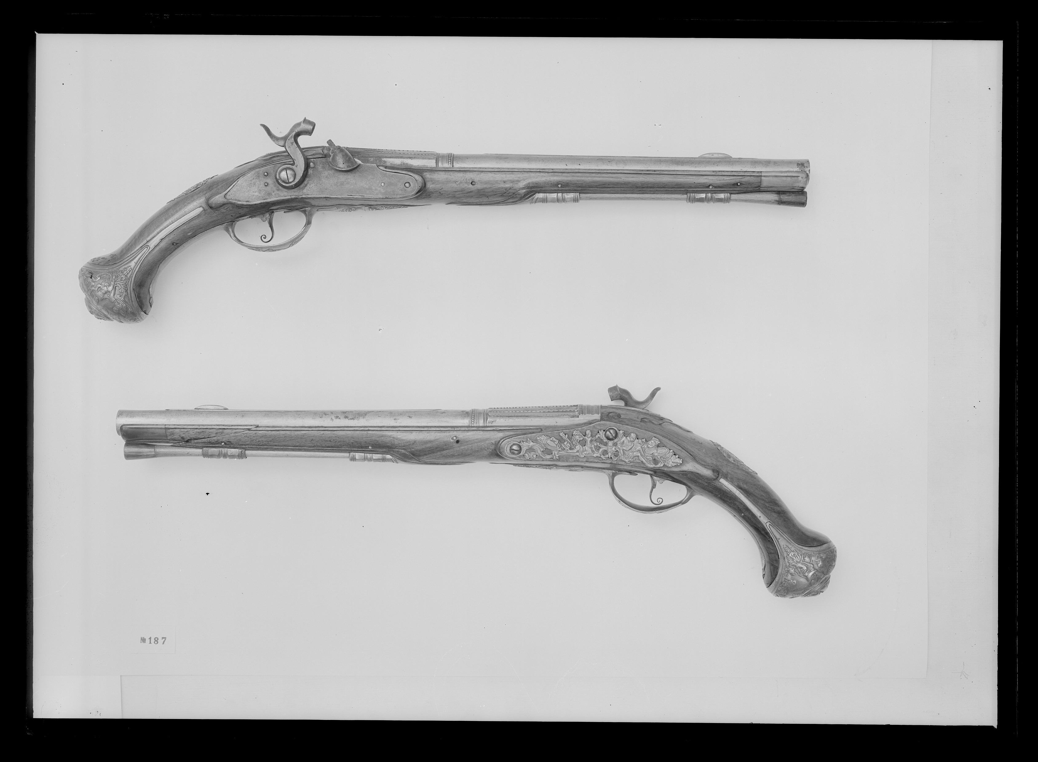 Rund, slätborrad pipa med åttsidig kammare, svarvad ring vid övergången, vid pipbasen en bred mässingsring med pärlstavsdekor, på pipan däremellan tre profilerade lister. På den runda delen därframför list med spetsiga ändar och kornet framtill. Bakåt vidgad svansskruvblad, belagd med mässingsplatta. Vid kammarens h. sida fäst konisk snäcka med tändhattsnippel. Riktmedel: Spolformigt korn av mässing på mässingsplatta. Fästning: Pipan fäst med krysskruv samt två pipstift av stål. Slaglås med plant, blånerat låsbleck. S-formigt svängd, plan hane. Invändigt är några låsdelar märkta 1, studel fäst med tre skruvar. Fästning: Två låsskruvar. Avtryckare med bakåt ihoprullad spets. Helstock av trä med avsatser kring spetsrörka, bleck, varbygel och svansskruvblad, tungor bakom blecken. Näsband av horn, övriga beslag av mässing med reliefdekor av trofégrupper mm. Kolvkappa med långa flikar och centrumplatta i form av maskaron. Genombrutet sidbleck med två sittande människor samt ett liggande, bakåtseende lejon(?). Tumplåt med mansbyst, omgiven av lagerkrans, krona upptill, nedanför kransen en fågel med utbredda vingar, sittande på ett människohuvud. En + en profilerad rörka. Tillbehör: Laddstock av trä skodd med horn.