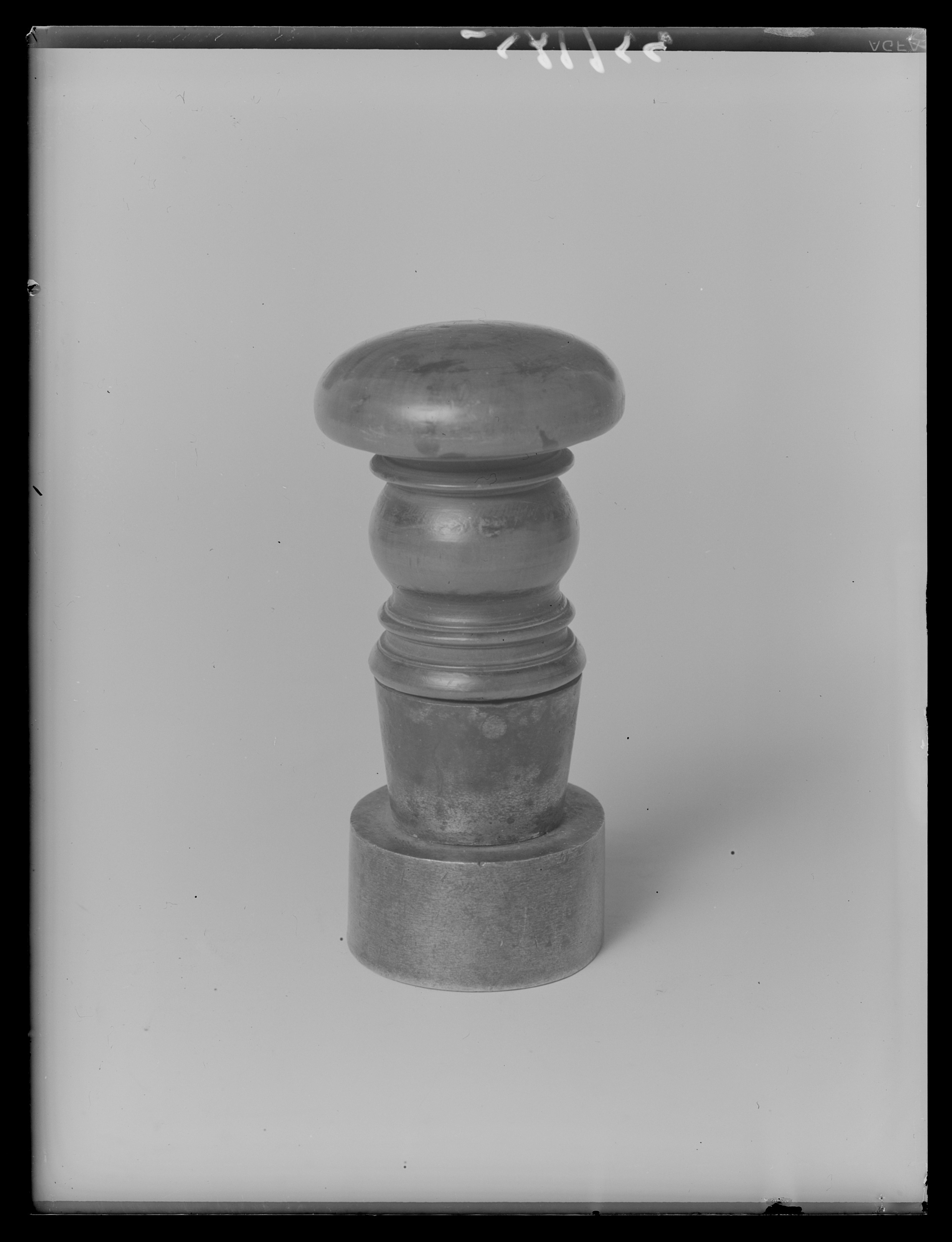 Oval, cylindrisk platta av stål, däri graverat alliansvapen, skrafferade färgangivelser. Två ovala sköldar, till höger tre kronor, sköldhållare krönt, tillbakaseende lejon. Till vänster Danmarks tre leoparder i hjärtbestrött fält, sköldhållare vildman. Sköldarna krönta av gemensam kunglig krona, mellan sköldarna hänger en blomsterranka. Sköldarna står på postament på mur med lagerfestong. Kantbård i form av bladkrans. På plattans ovansida ett gängat hål, däri skruvat holk av stål med gängad tapp, omvänt konisk, h: 26 mm. Svarvat skaft av ljust trä (buxbom?), balusterformig nederdel, upptill en på ovansidan välvd skiva, d: 49,6 mm.