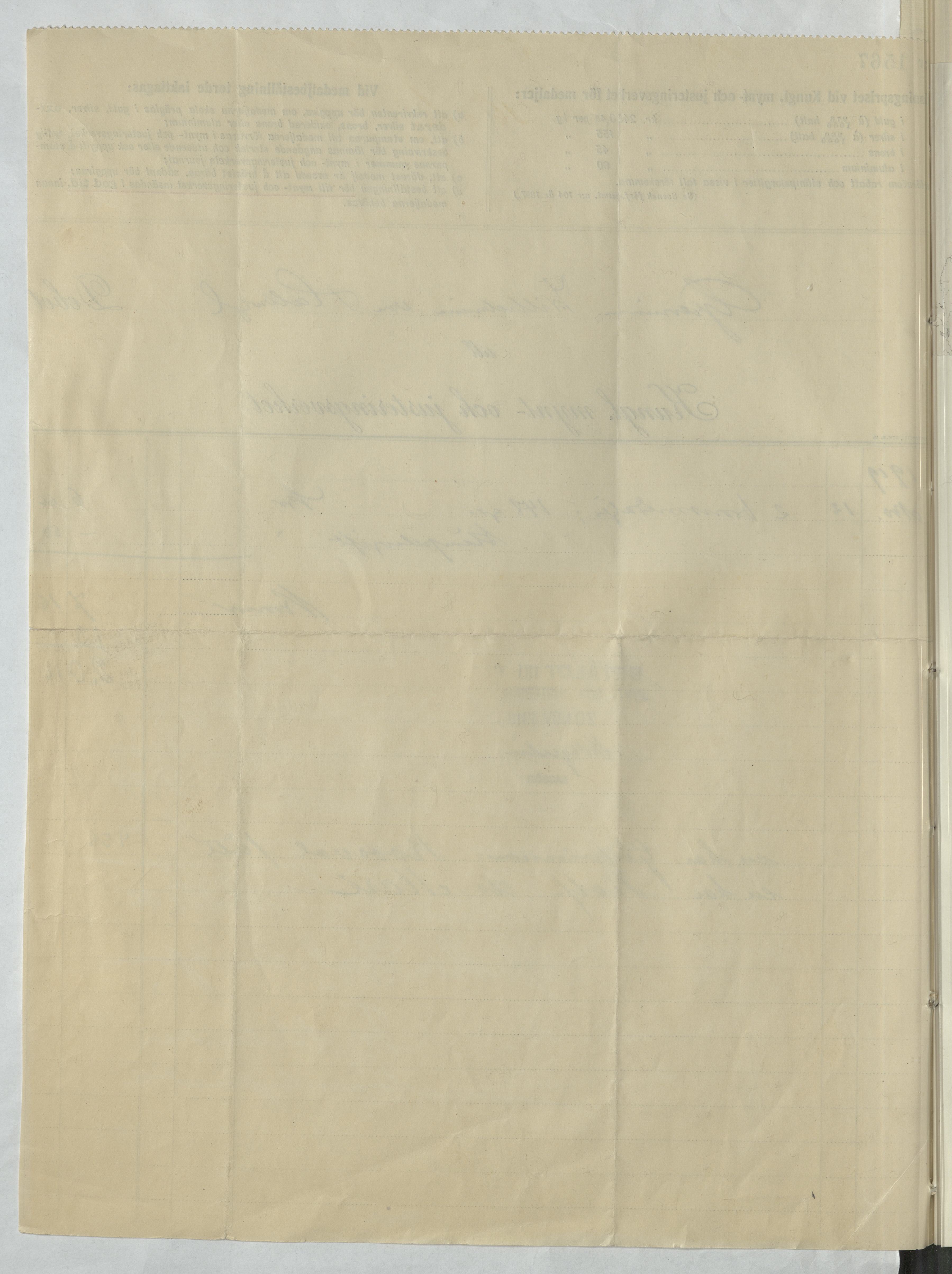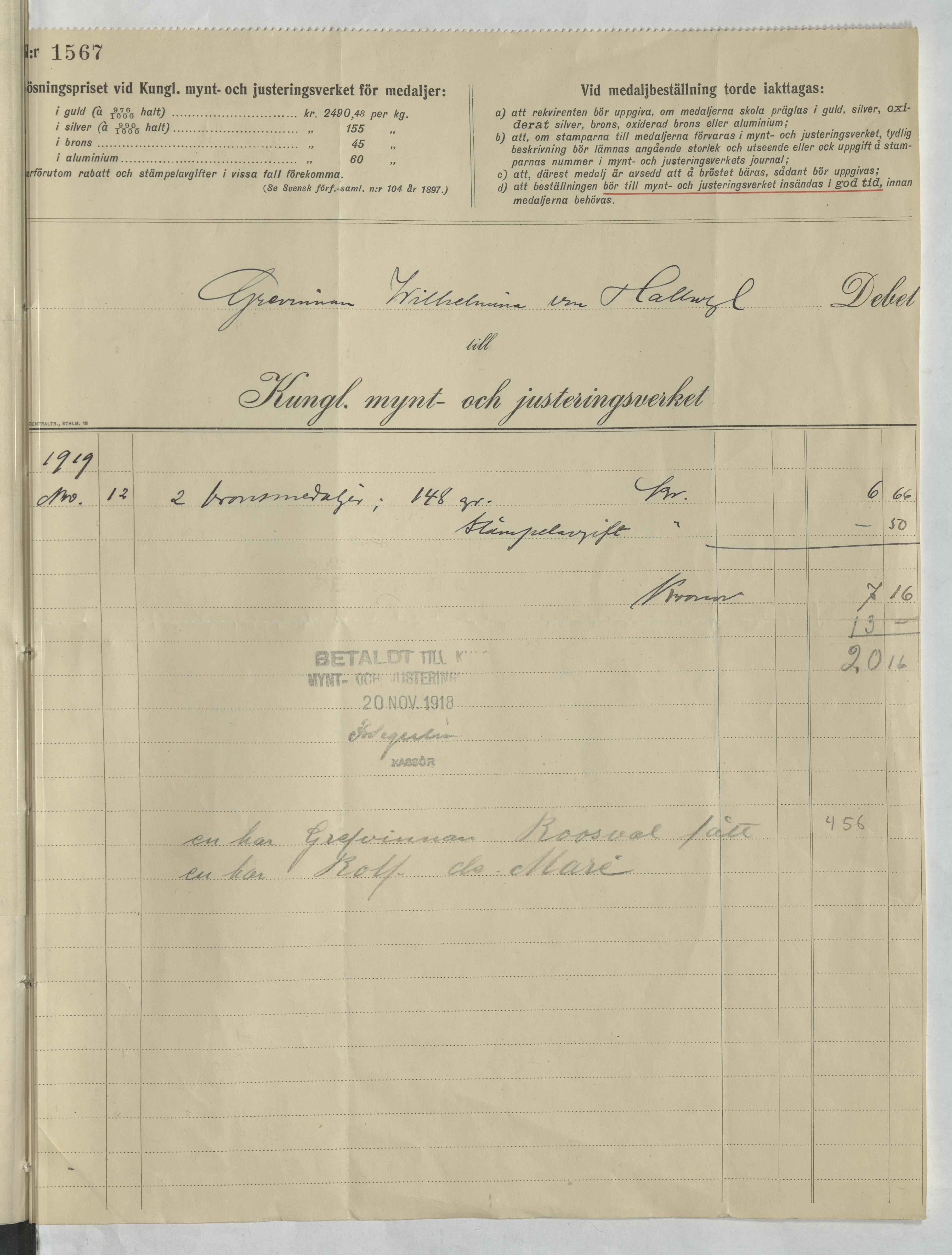Kvitto från Kungl. Mynt- och Justeringsverket