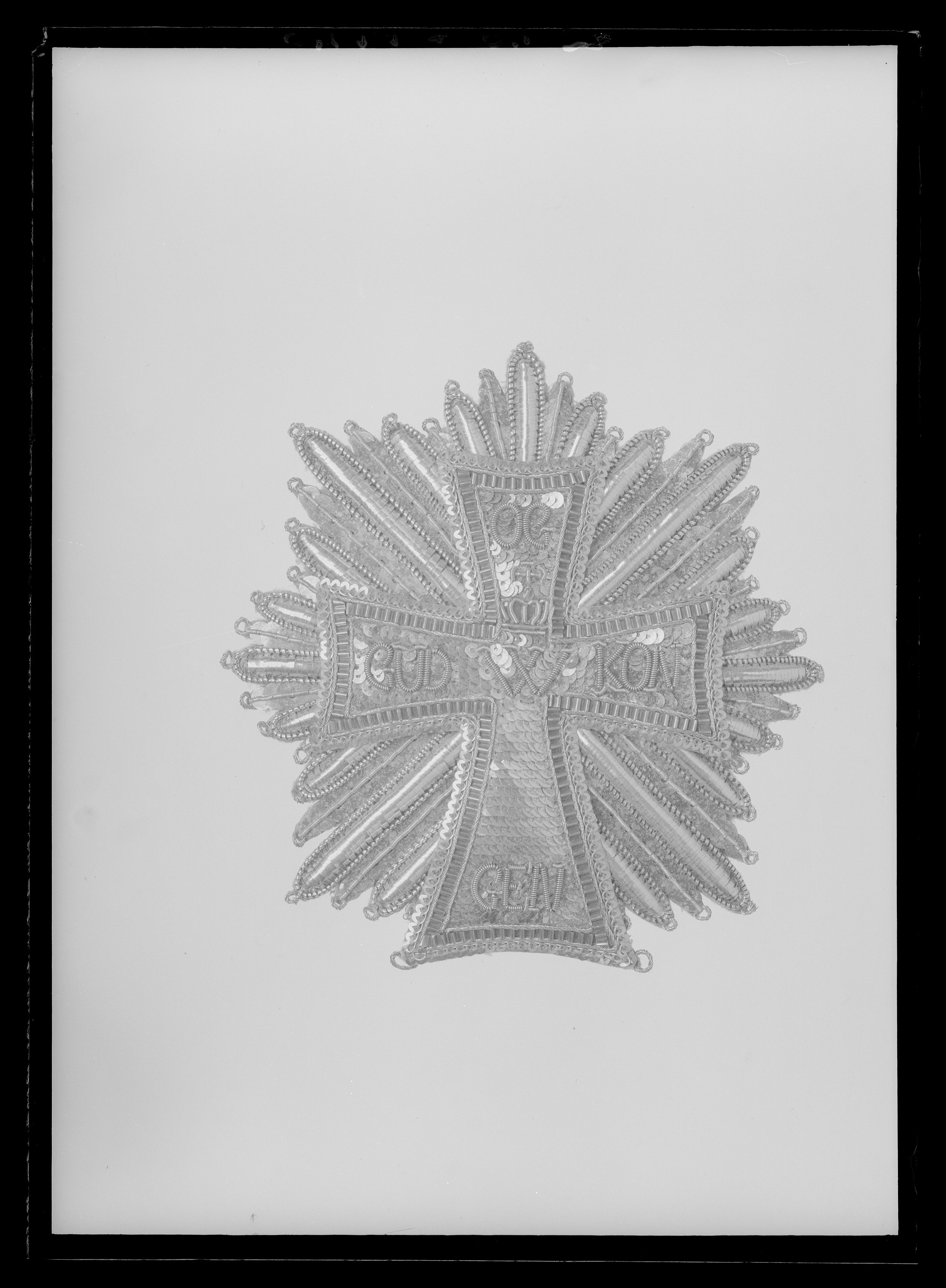 Sjuuddig strålstjärna, broderad med silverlan- kantlinjer och paljetter. Därpå ett utböjt, latinskt kors, broderat med silverpaljetter, kantbård av guldpaljetter och rödmålat, veckat lan, kantat med flätade guldkantlinjer. På korsmitten broderat med guldkantlinjer W samt däröver kunglig krona av guldkantlinjer, en guldpaljett samt foder av rödfärgat lan. På korsarmarna text, broderat med guldkantlinjer: "GUD OG KONGEN". Baksidan täckt med vitt skinn, därpå skrivet med bläck: "C. (Sab?) Hielm // Hof Perlestikkerinde".