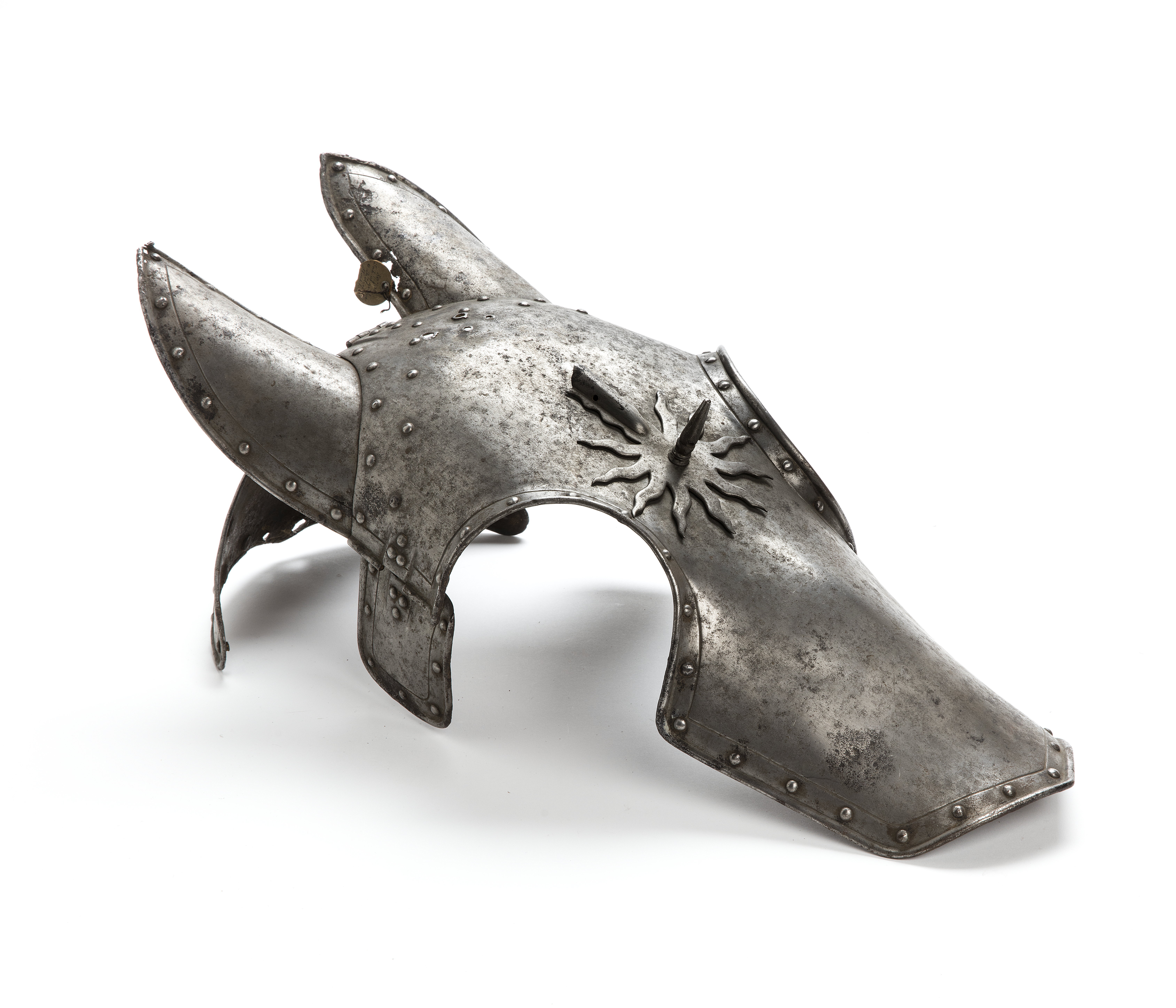 Av smitt stål i sex delar, hopsatt med nitar, bestående av en huvudplåt med två öronplåtar, nackplåt samt på sidorna kindplåtar. Huvudplåt i ett stycke. Mitt fram en 45 mm hög uppåt avsmalnande nitad spets med ett genomgående hål. I basen tre framfilade ringar. Under denna en tiouddig stjärna som överst har en plymhållare med två hål. Under denna en svag antydan till en ås. Mellan öronen på plåten fyra uppslagna hål. Urtag för ögonöppningar, b 125 mm på höger sida samt 140 mm på vänster sida mm samt urtag för öron med nitade öronplåtar, h ca 150 mm (mitt på). Kindplåtar fästa vid huvudplåten med gångjärn. Nackplåt nitad vid huvudplåten med ett gångjärn. Mitt på denna, stort hål med tre små hål i nära anslutning, där en plymhållare troligen varit fäst. Längst ner två sekundärt upptagna hål i olika storlek. Ytterkanterna till samtliga delar inåt omvikta och rundsmidda. Därinnanför en nitad nitrad samt en parallellt mejslad dekorlinje, b mellan 11 -14 mm. Invändigt, nitbrickor med spår av läder på några ställen. Märkning i vitt "59.736. //Ink. af grefve O. Frölich// i Stockholm." samt, därunder, i svart "59 735". Lapp fäst i vänster öronplåt: "59.736//Ink. af grefve O. Frölich i // Stockh." Skador på vänster öra samt toppen på höger öra. Rost, i synnerhet på nackplåt.