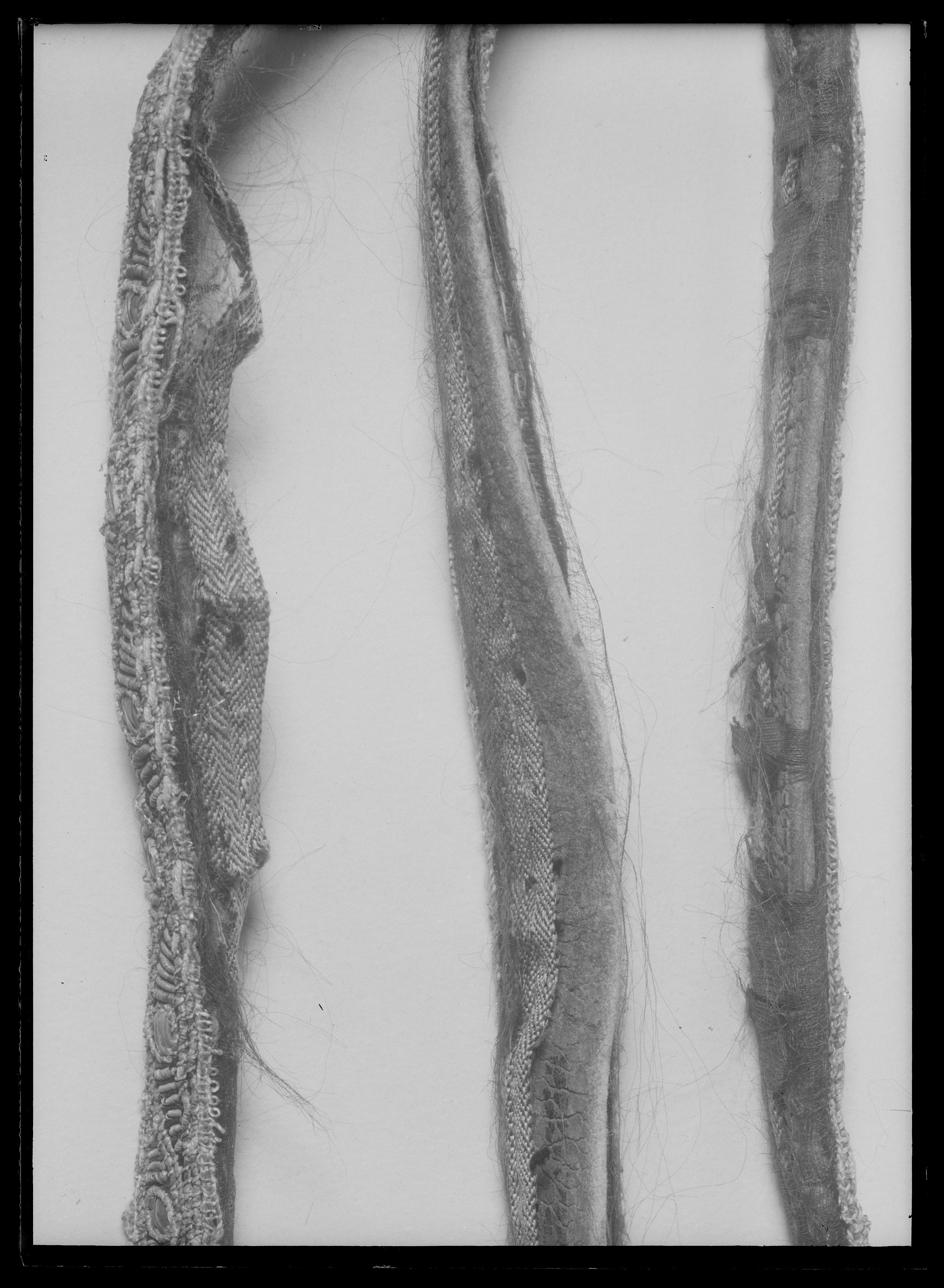 Tyglar klädda med nött svart sammet broderade med guldtråd och lan i vågmönster med rundlar. Insida klädd med svart textil (konserveringsåtgärd). Två söljor samt ändbeslag av mässing vid fästet till tygelringarna. Löpare och valknut dekorerade med flätad guldtråd.