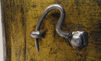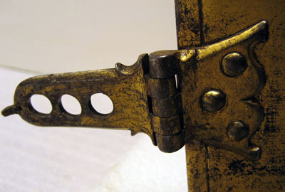 derpå sittande en karlfigur med förgyldt bröst och ryggharnesk. 2 armstycken af D:o D:o 1 Handske. 1 Höftstycke af D:o D:ot på kanterna, 2 lårstycken af D:o D:o 2 benstycken af D:o D:o med fötter och sporrar, 1 ringkrage af D: D:o 1 Sluten Hjelmaf messing, fodrad med karduan.