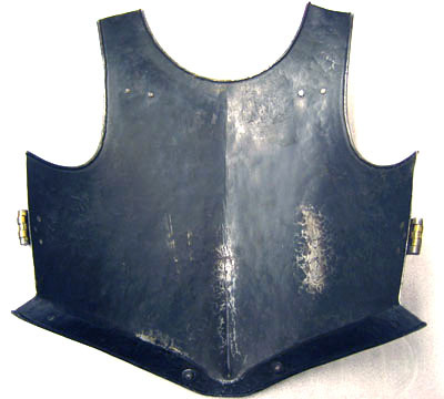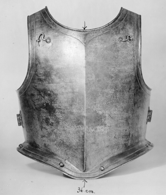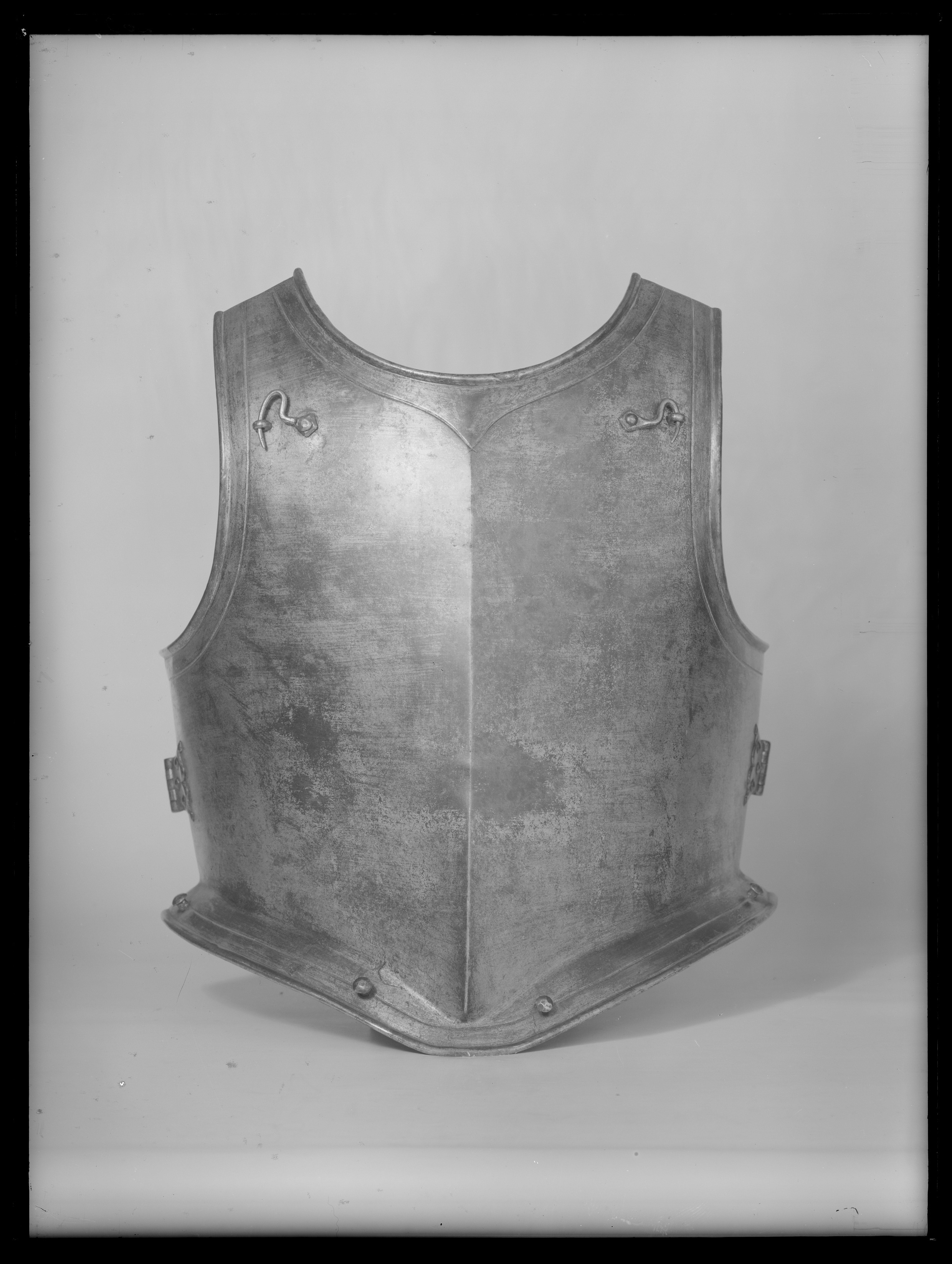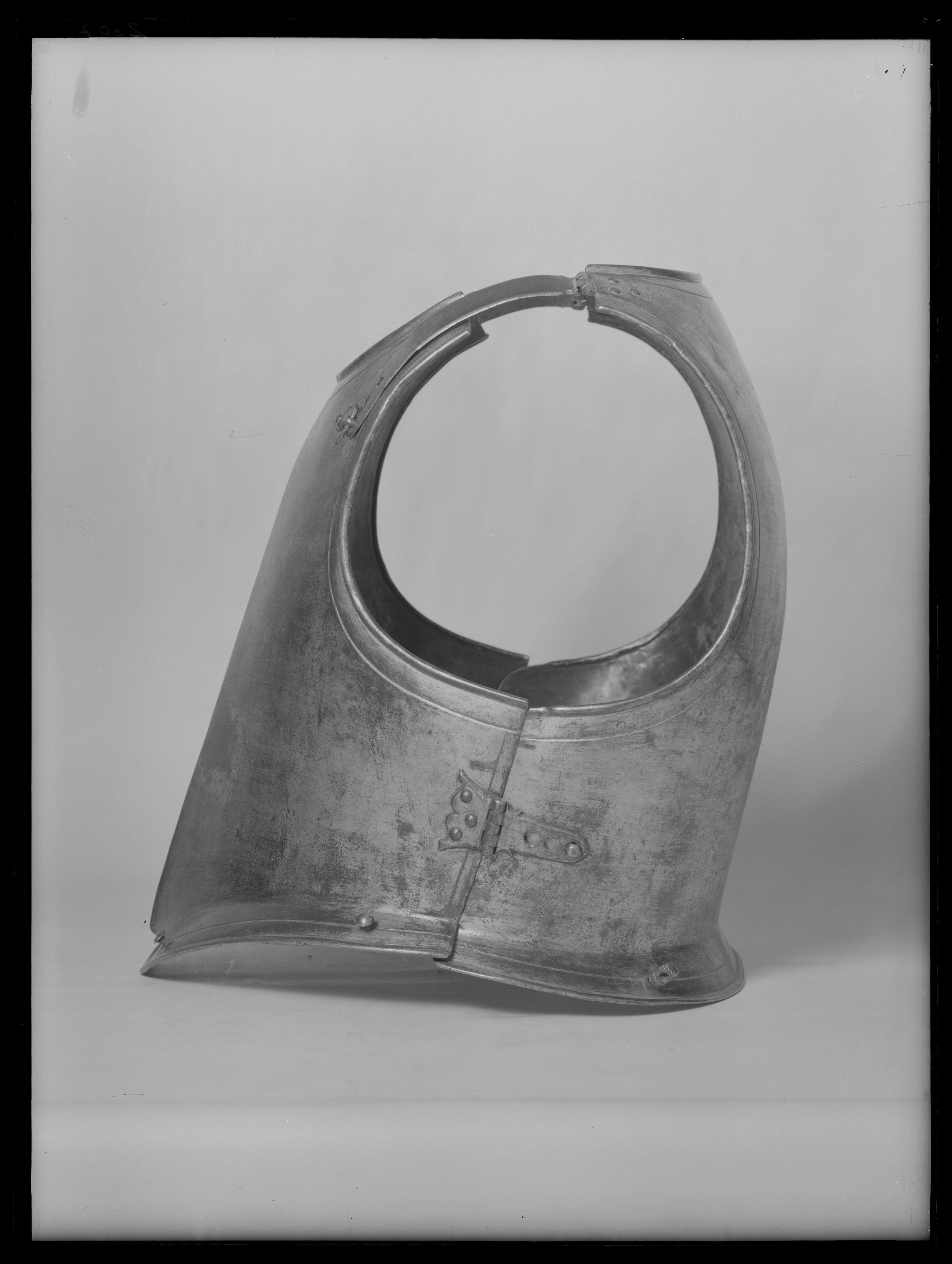 Driven ur ett stycke, med rundade urtagningar för hals, b 90 mm, och armar, b 210 mm. Snett inåt lutande sidor över midjan. Nertill krage, b 33 mm, med välvda och rundade sidor framtill i mitten hopgående i ett 50 mm brett parti med rak kant. På kragen i var sida baktill och framtill två utstående nitar, h 9 mm, med kullrig skalle. 45 mm från halskragens kant och nedåt en driven skarp mittås, avslutad nertill med liten spets, h 8 mm. Över var bröst en hasp och genomborrad tapp. Nertill i sidorna gångjärnsförsett spänne, l 85 mm, med tre borrade hål. Bakre del med kant formad som två motställda S, främre delen utåt avsmalnade med släta kanter, framtill rundad med i mitten liten spets. Harneskets insida svärtad med tydliga slagmärken.