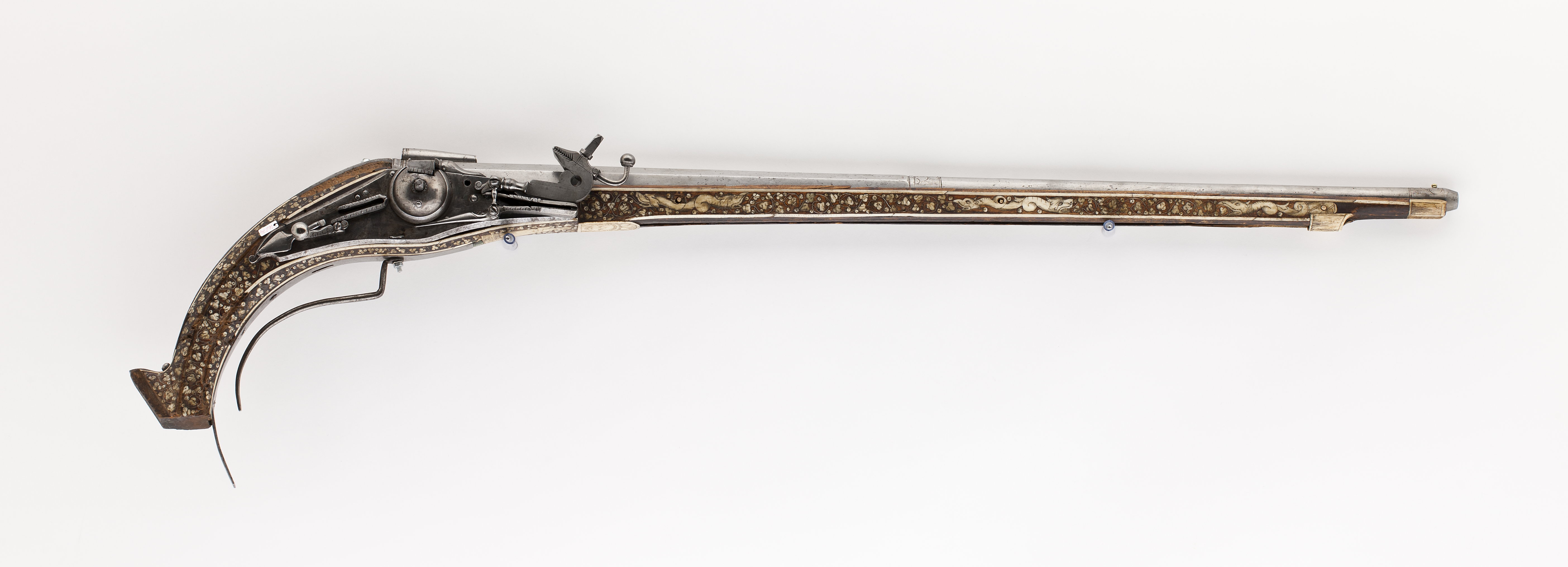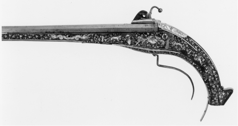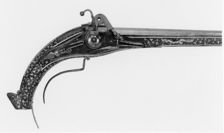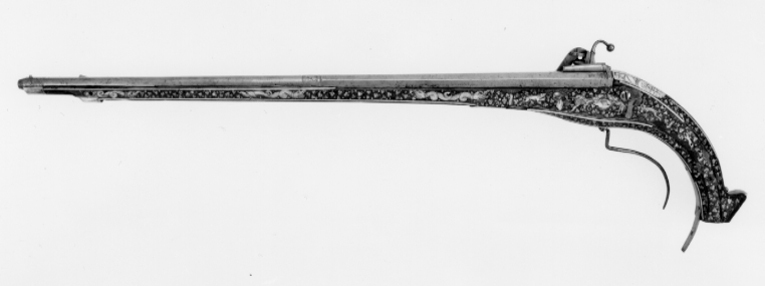Rund, slätborrad pipa av stål med åttsidig kammare, fasad kant vid mynningen, l 10 mm, på undersidan vid fänghålet ett stycke borthugget för hjulstudeln. Långt svansskruvblad inskruvat i svansskruvplattan, utdraget till kolvänden, böjt i vinkel vid änden, tre skruvhål. Svansskruven har baktill en åttsidig platta av pipans bredd, på ovansidan en profilerad vulst, på undersidan en fyrsidig tapp. Punsad dekor med rester av förgyllning vid pipbas, övergång rund-kantig del samt vid mynningen, rankor, X samt ornamentsstämplar. På sidofaserna vid pipbasen två stämplar: sköld med L M och planta med tre runda blad, (LRK vägl.1921:207). På mittfasen framför siktet stämpel sköld med örn (Stöckelnr 8780, LRK vägl.1921:177). Riktmedel: Rörsikte, solsikte, l: 60 mm med streckdekor, två streck vid bakänden, ett vid framänden samt mittpå ett v-formigt streck. Knoppkorn av mässing. Fästning: Tre häften, det främre trasigt. Pipan fäst med mässingsstift bakom svansskruven (nytt), en skruv från svansskruvblad till avtryckarbleck, två pipstift av trä (nya) samt ett av stål, en skruv saknas mittpå svansskruvbladet. Hjullås med blånerat låsbleck, kloformig bakre del med ändvolut. Utvändigt hjul med välvd hjulkapsel, bred, rundad ring, rankt nedanför axeln en välvd, blank skruvände. Rektangulär fängpanna med rak nederkant, streckdekor, blankt lock med rörlig arm, tryckknappen saknas. Blank hane med balusterformig kropp, plan hals med runt hål, dekor i form av två raka streck. Lös överkäke med uppåtsvängt grepp, avslutat med en rund kula på en skålat platta. Högt, blankt käkskruvhuvud med kvadratiskt tvärsnitt fasade kanter upptill. Hanfjäder med delvis fasade kanter, på bakre delen bladdekor, mycket lång, svagt välvt, avsmalnande fjäderlöv. Balusterformig hanstudel. Låset invändigt blånerat förutom hjulstudel och rörliga delar, fängpannelockets drivfjäder blånerad. Säkring: Bakom hjulet virvelsäkring med kulformigt grepp, på bygeln ett spetsigt, triangulärt, välvtlöv. Fästning: Två låsskruvar. Avtryckaren saknas. Helstock av valnöt med nedåtsvängd kolv med avbruten tå. Nästan yttäckande dekor av ben, kantlister samt bladrankor. Rektangulärt avtryckarbleck av stål till kolvänden. Fri, rundad varbygel nedåtsvängd efter kolven, fäst med "krysskruven", bakre stolpen saknas. Övriga beslag av graverat ben. Vid svansskruvbladet urspr. två brickor med vänstervänd mansprofil med mustasch (h.saknas).På kolvens undersida framför avtryckarbecket en kvinna i lång klänning, pipkrage o puffärmar, långt förkläde, mössa med spetsig mittprydnad. På anslagssidan en jaktscen, grönfärgad mark och tre träd med grönfärgat lövverk, ett träd saknas. Vildsvin på rygg, angripet av en jägare i pluderhosor med spjut, två hundar intill vildsvinet, två hundar springande från kolven, en från framstocken.Spetsrörkeplatta med rundad framände, dekor i form av en lejonmaskaron(?). Sex pipstiftbrickor i form av slingrande drakar med huvuden i båda ändar. Topprörka och näsband med streckdekor.