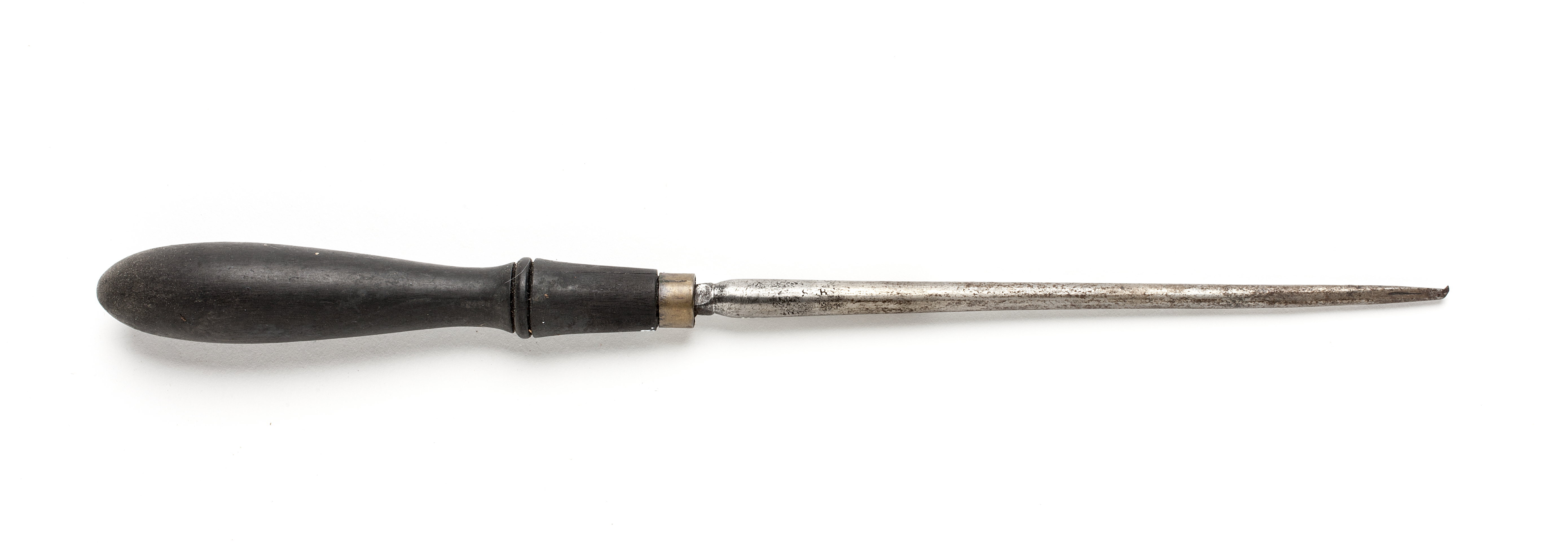 Rund klinga. Kort, vinkelställd, spetsig egg. Svarvat skaft av ebenholts med en vulst. Mässingsring. Stämplat på klingan: "S B", 2 ggr