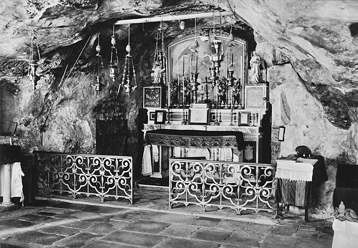 Text på originalet: "Grotto of the Agony/Grotte de l'Agonie". Fotografierna LXVI:N.01.-180. kommer från resan till Palestina och Syrien som Wilhelmina och Walther von Hallwyl gjorde den 30 mars-27 april 1901. De lämnade Sverige den 5 november 1900 för Egypten, där de stannade till den 28 mars 1901, då de fortsatte till Palestina. Med på resan var Wilhelminas sällskapsdam, fröken Ida Uhse. Den 27 april fortsatte de till Turkiet och Mindre Asien. De mindre fotografierna (utom de från Samos) LXVI:N.90.-100. är tagna av Wilhelmina själv, under en resa till häst från Jerusalem till Damaskus 8-20 april 1901. Övriga fotografier är inköpta av Wilhelmina i Jerusalem, Damaskus och Beirut. Alla uppgifter kommer från Ida Uhses reseanteckningar.