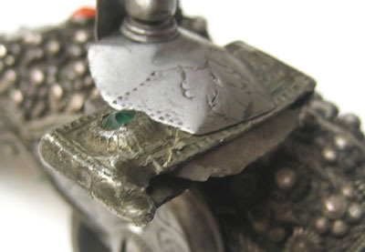 Brungrå färg, rektangulär och platt med grovt slagen ojämn spets. Påkostad mantel av bly, rektangulär och fint formad med raka sidor och på ovansidan graverad dekor, i änden infattad grön fasettslipad sten (glas?).