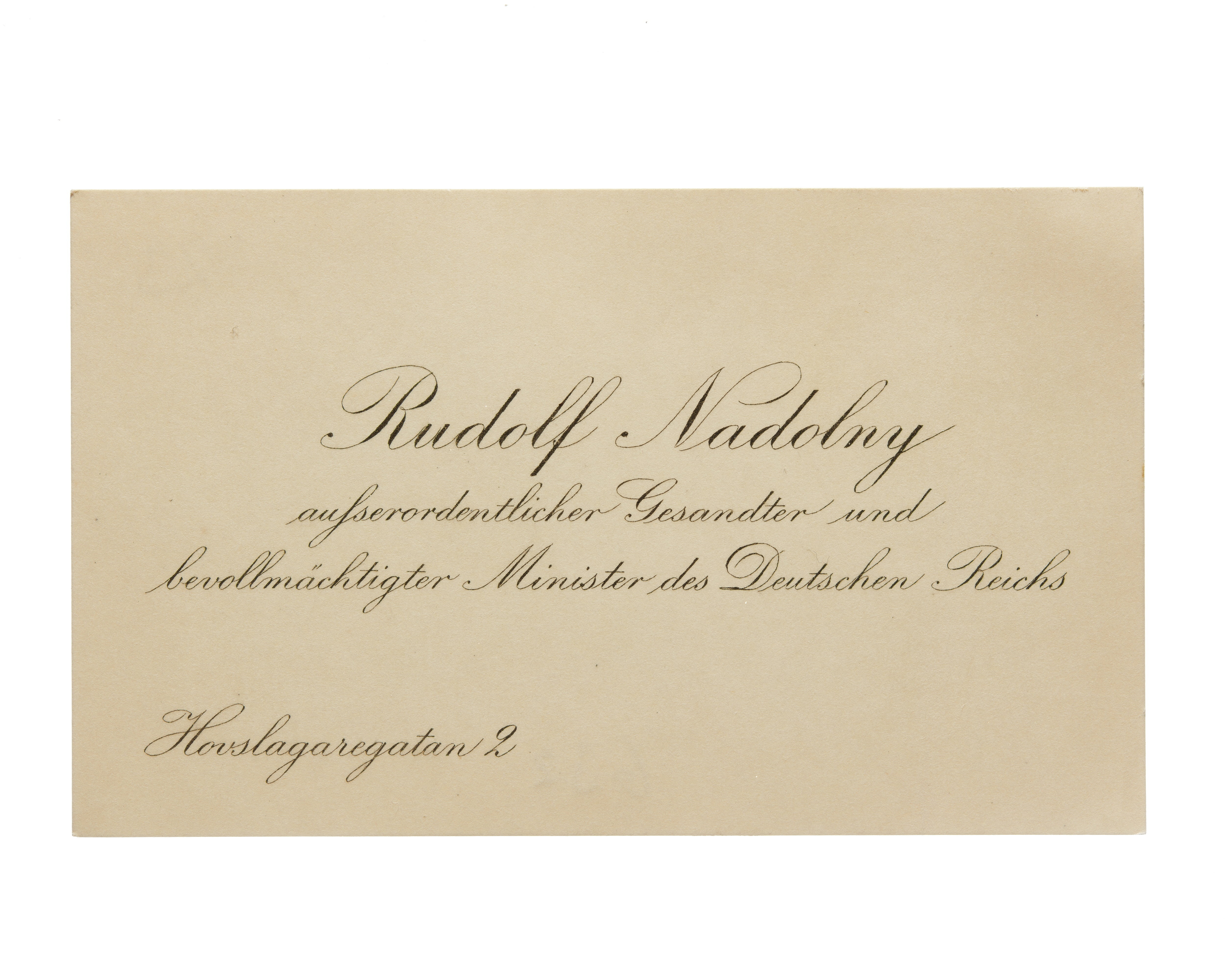 Ett visitkort från Rudolf Nadolny, Ausserordentlicher Gesandter und bevollmächtigter Minister des Deutschen Reichs, utan datum, adress (nedre vänstra hörnet) Hovslagaregatan 2.
