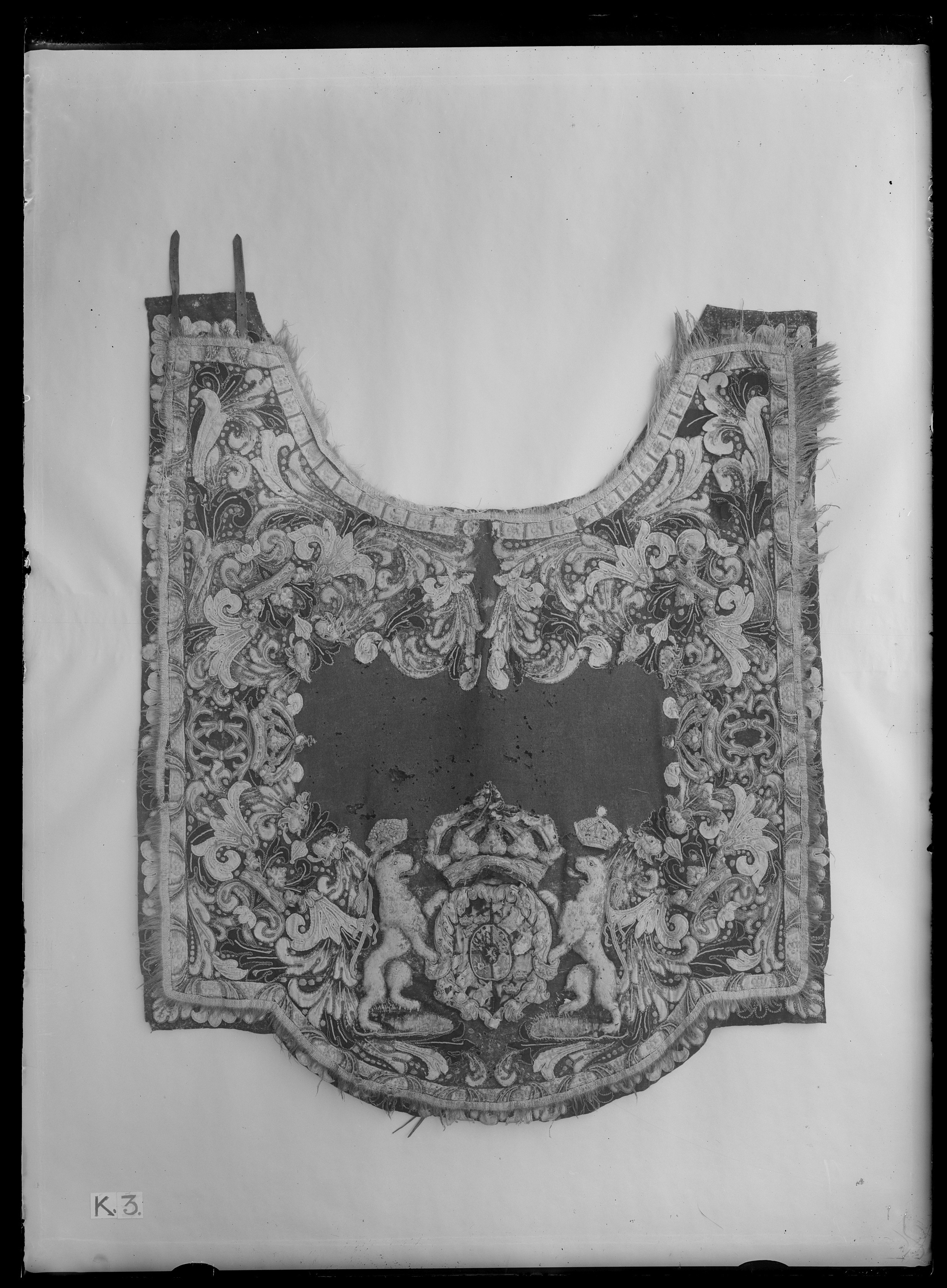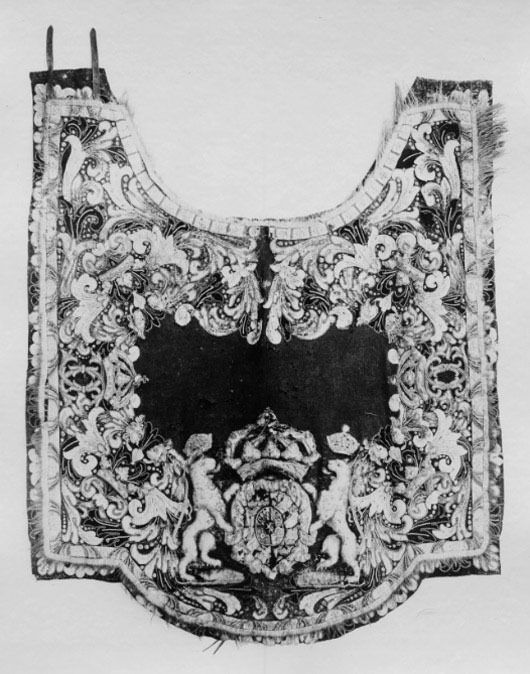 Handhästtäcke, ur en svit om 30 st med svenska riksvapnet och Karl XI:s namnchiffer.